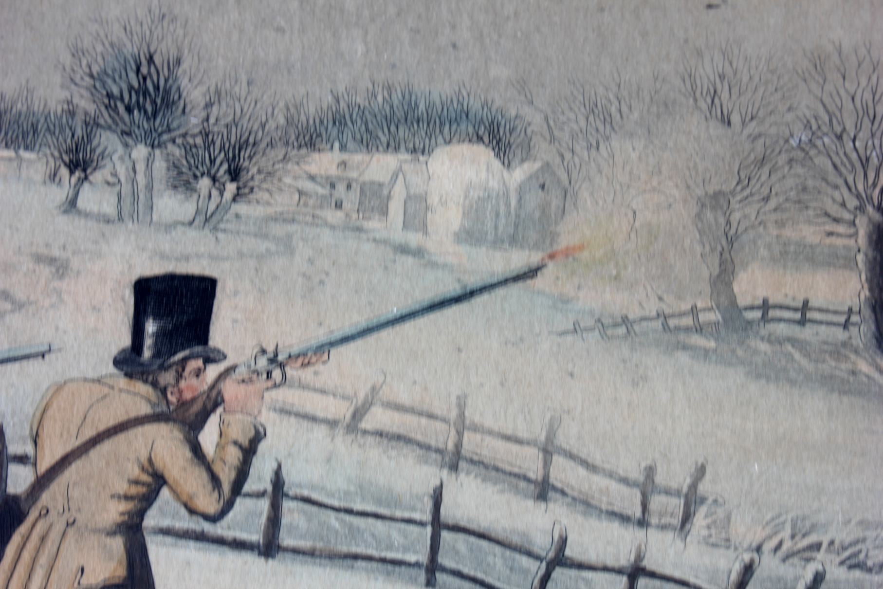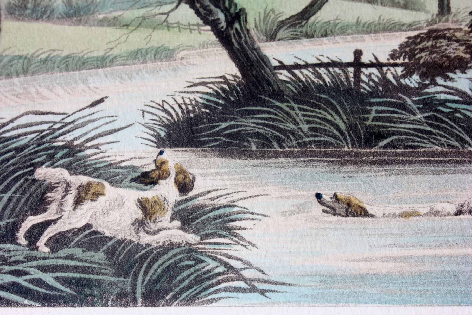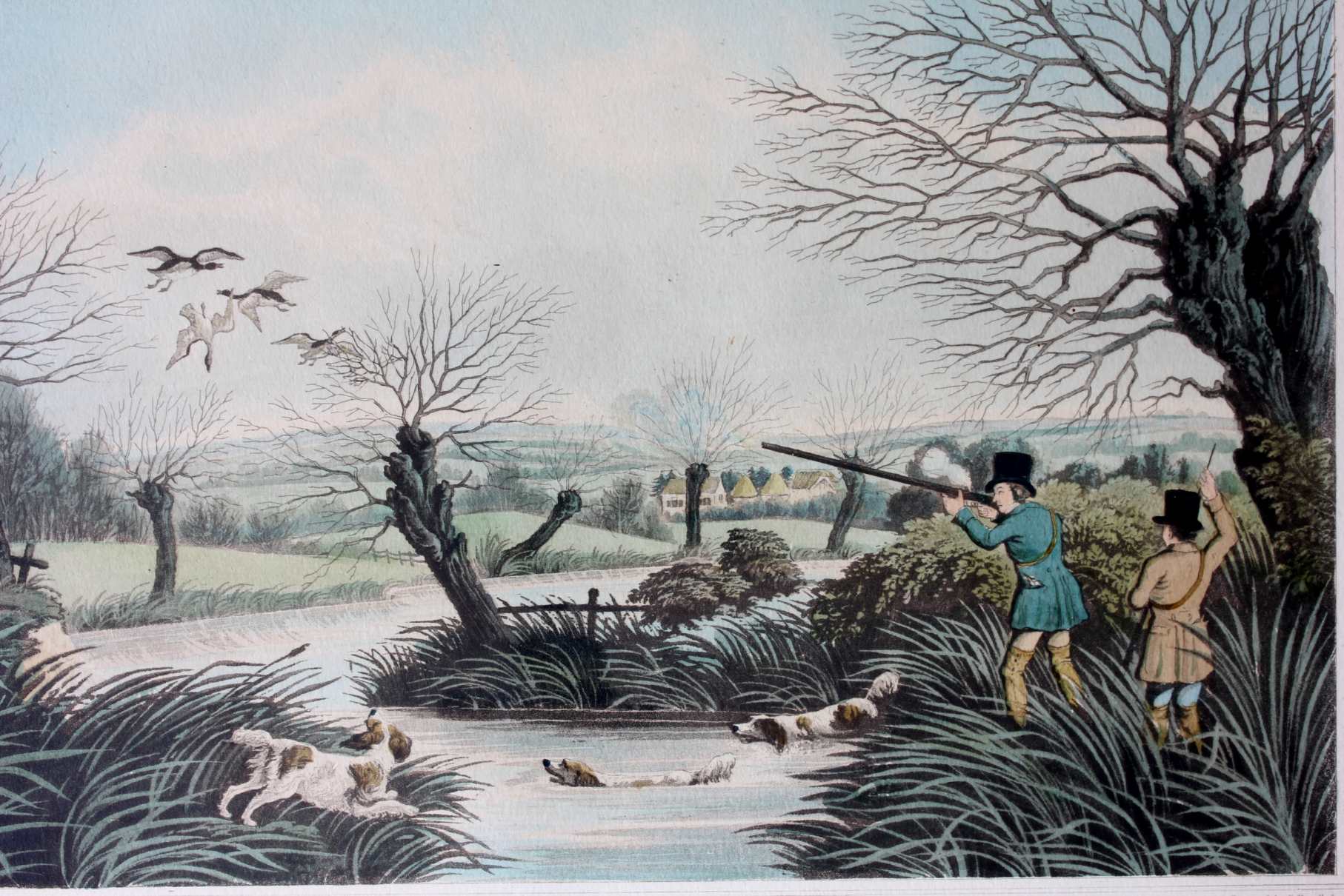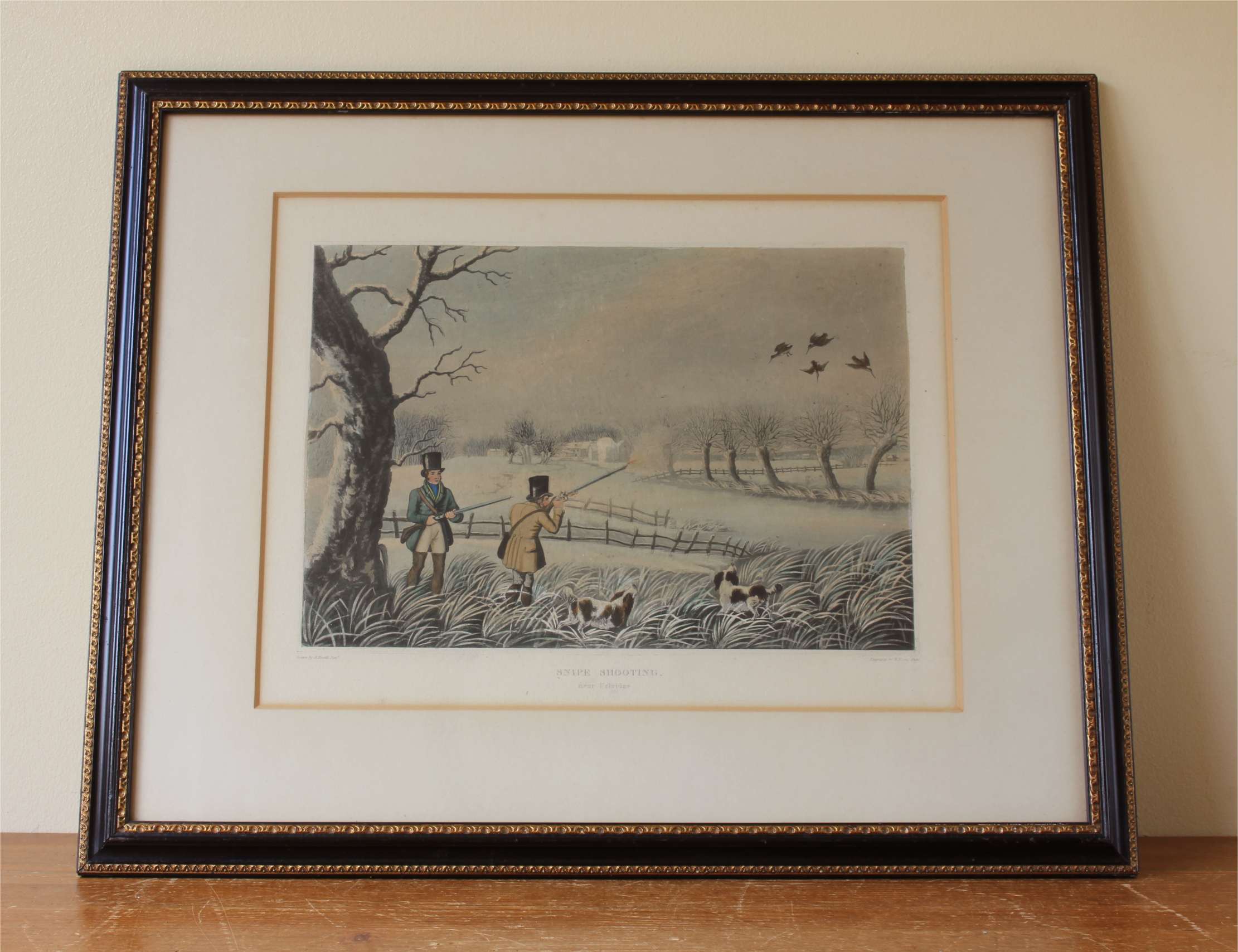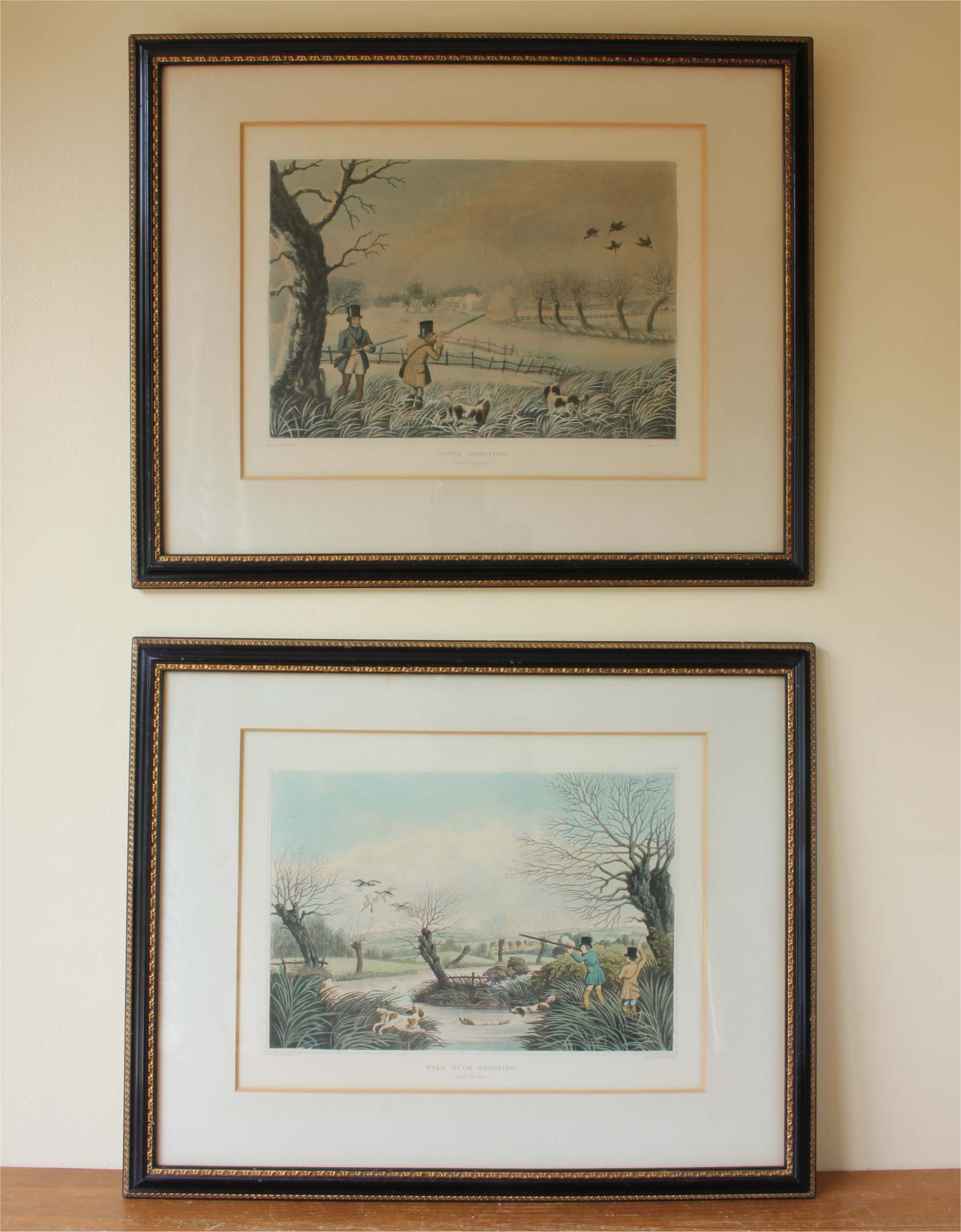 These two fine antique engraved aquatints which have original hand colouring are drawn and engraved by R Havell and are titled Snipe Shooting Near Uxbridge and Wild Duck Shooting Near Cowley.