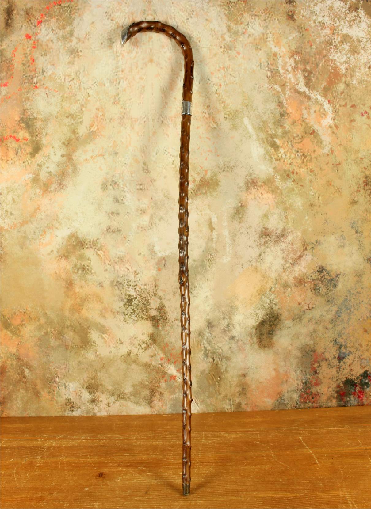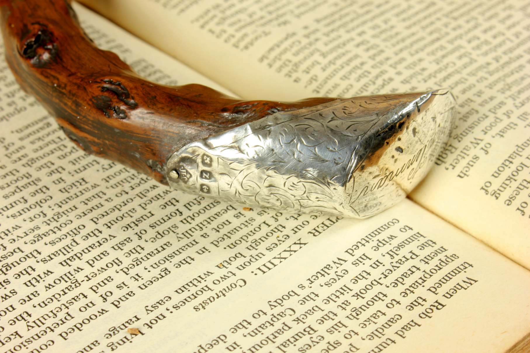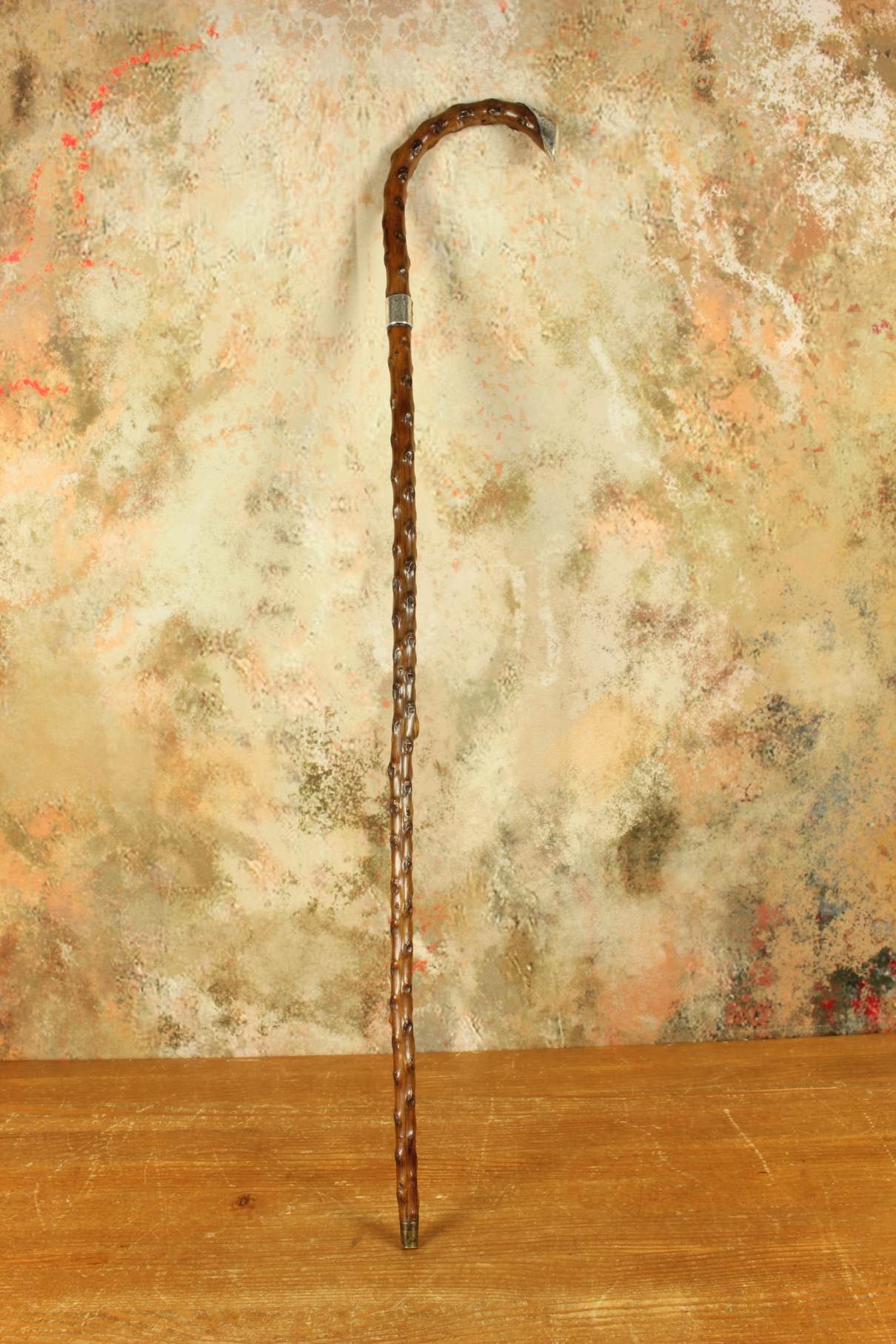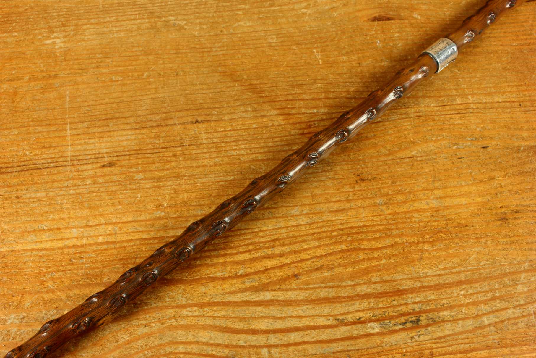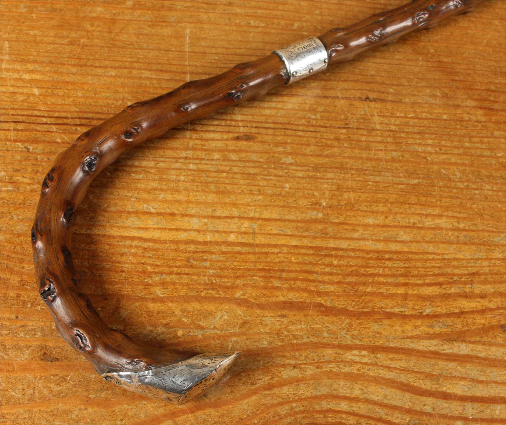 This antique walking cane which was made in 1899 from a beautiful piece of thorn wood has an ornately decorated hallmarked silver collar and handle cap which is also engraved with John Venman.
