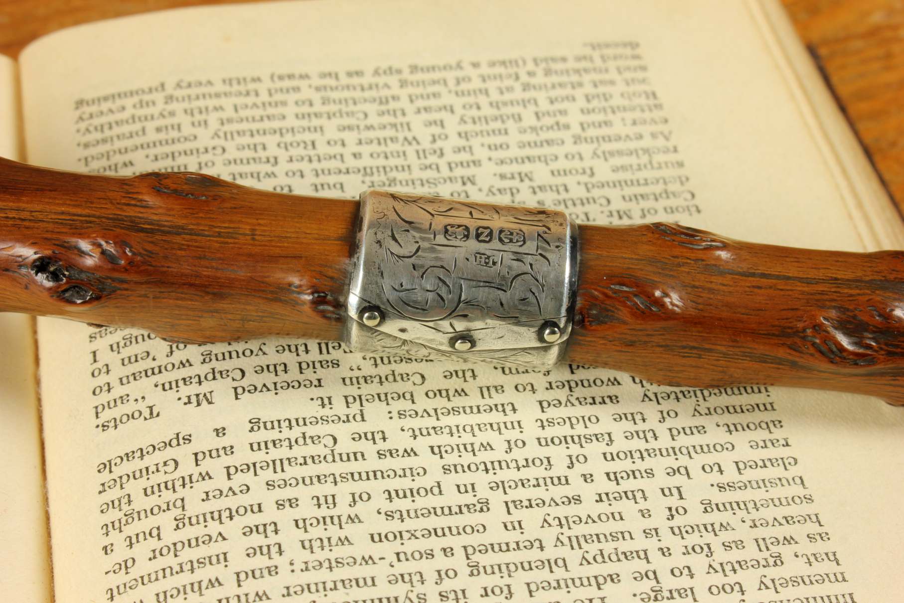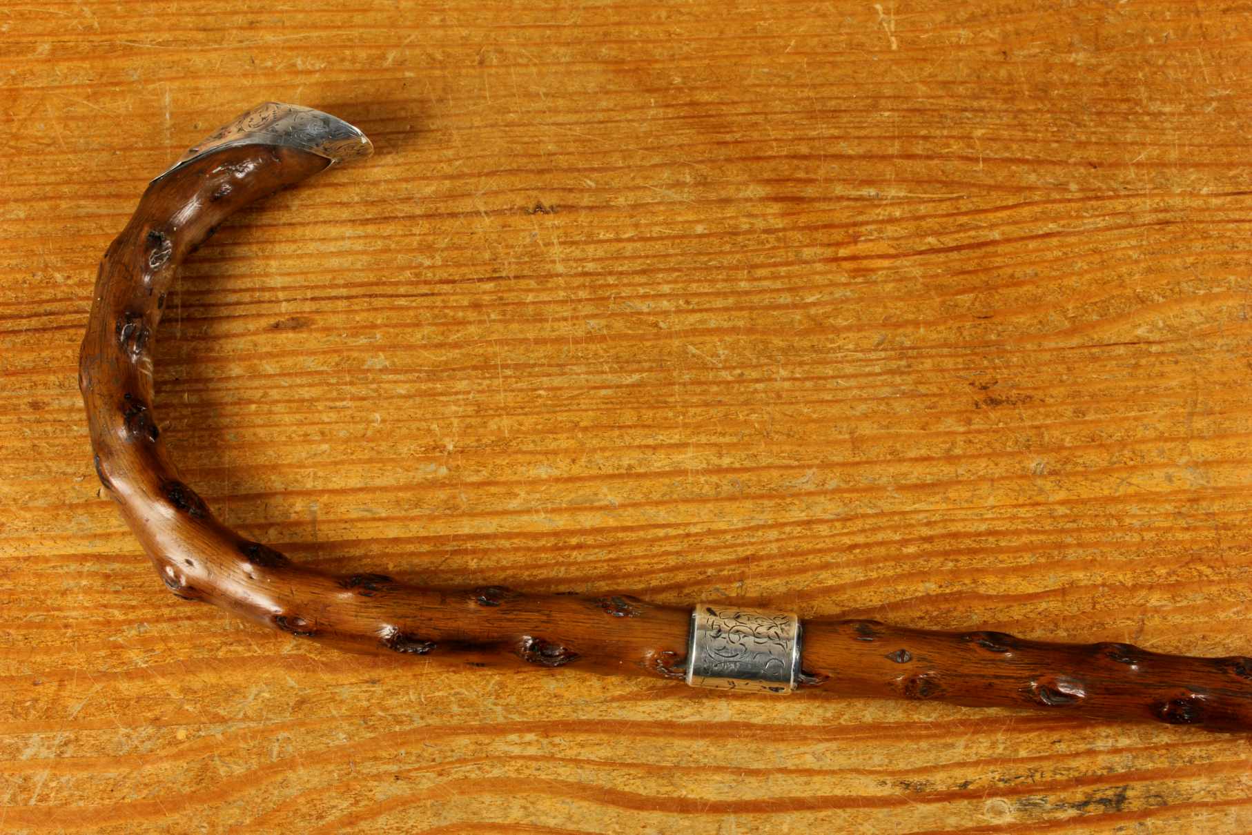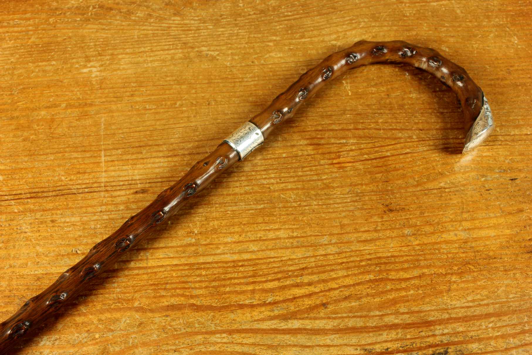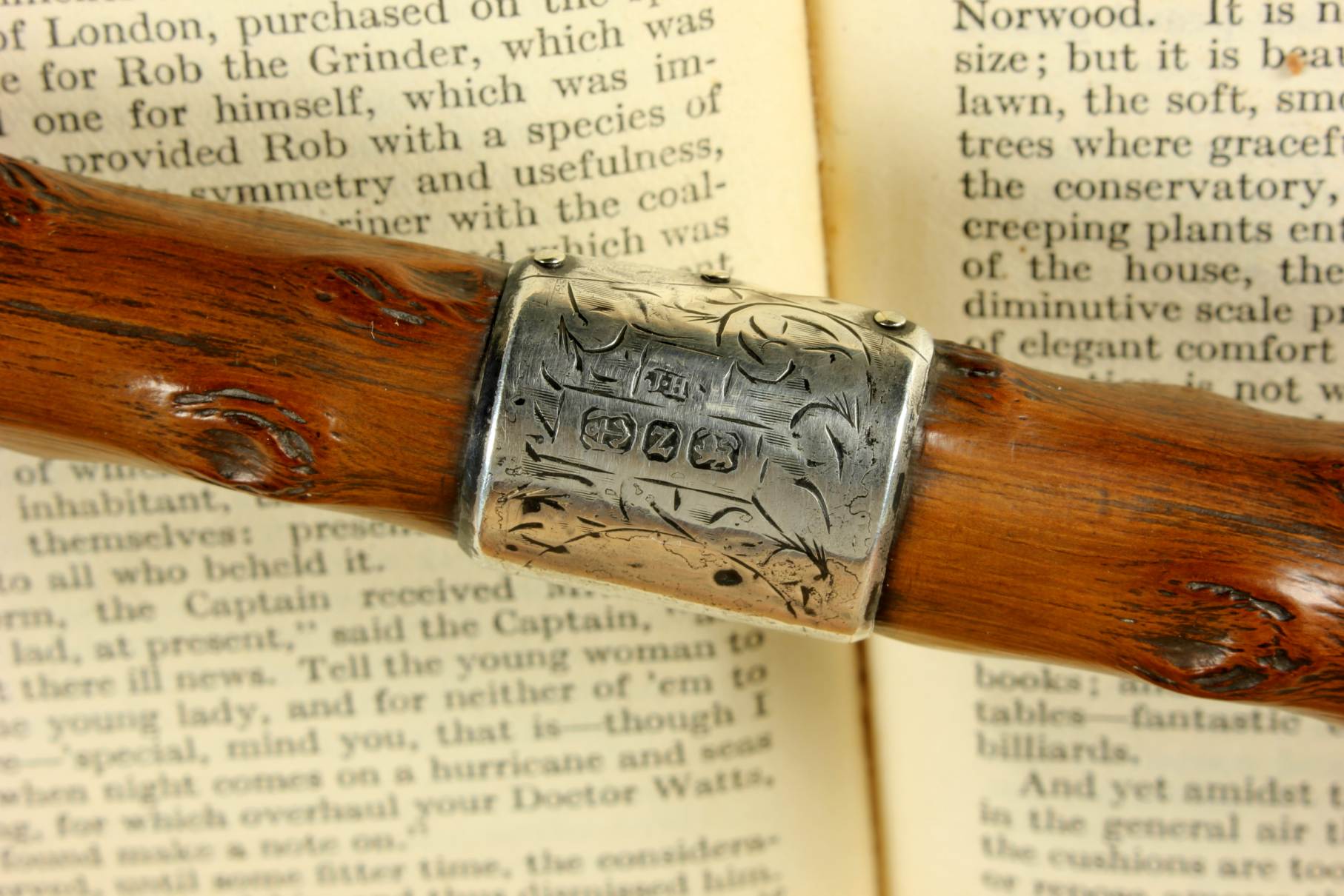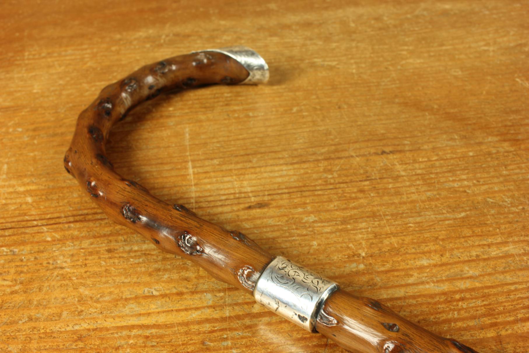 Condition: Very good usable antique condition with light signs of use in keeping with age. Some scratches and bruises to silver and general wear. There is a natural curve to the stick being made of thorn wood. Please see pictures.