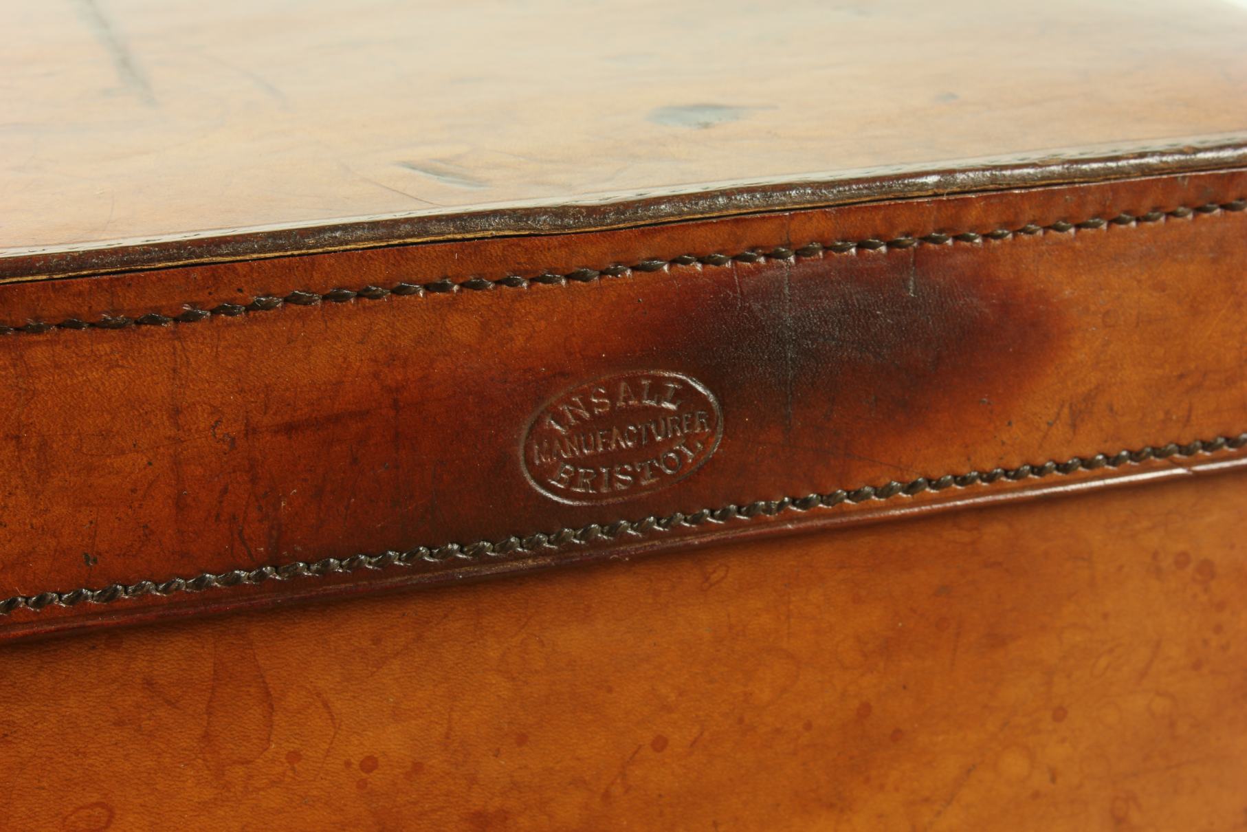 This antique attache case is strong and durable being made from high quality leather, has it's front lower corners shaped to fit inside the top lid, a stitched leather handle with sturdy brass fittings, two brass locks/clasps and is embossed to both ends of the lid with Insall Bristol Manufacturer.