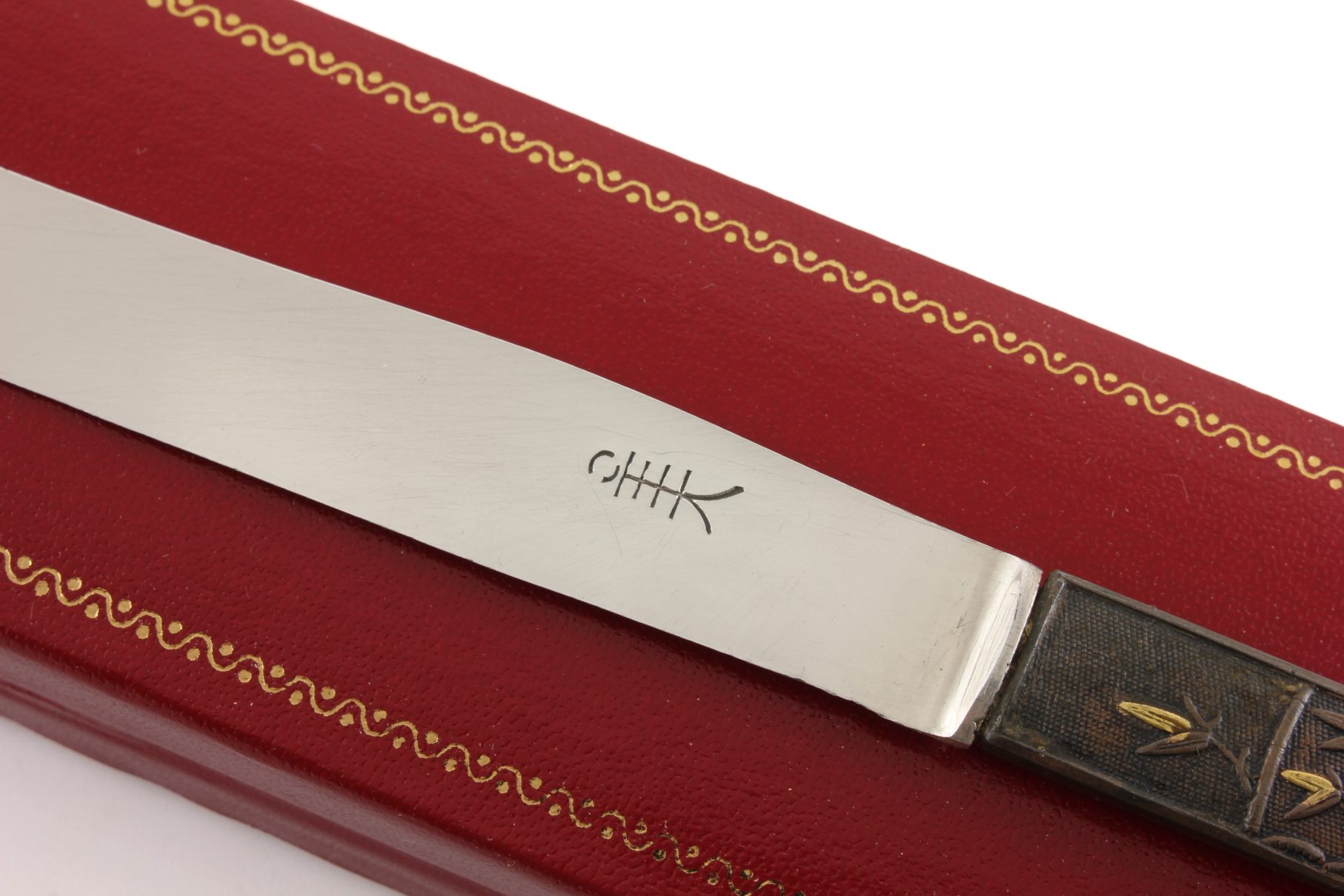 This antique Japanese letter opener which has a bronze Kozuka handle has a silver blade that is marked with a fish type character and dates from the Meiji period.