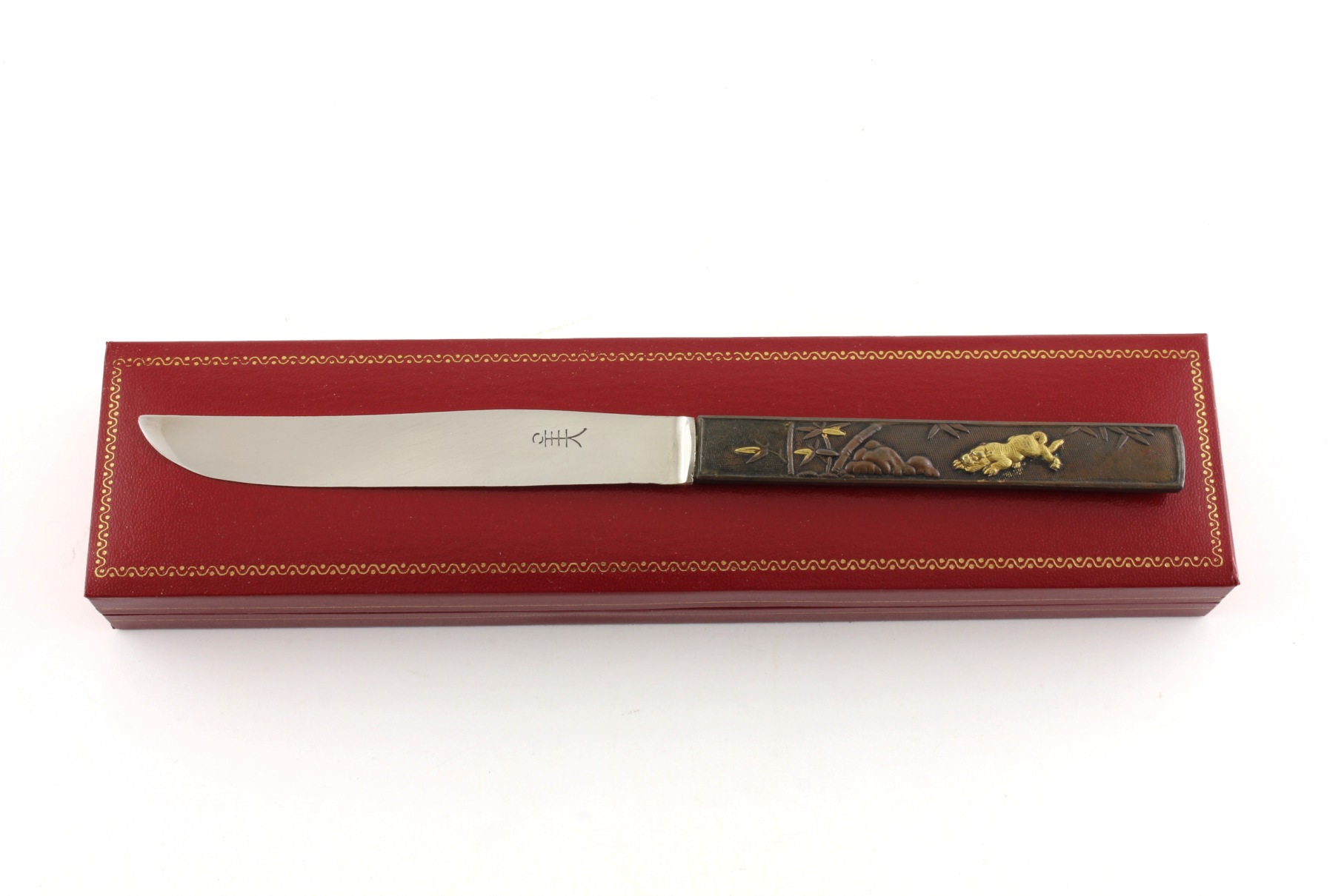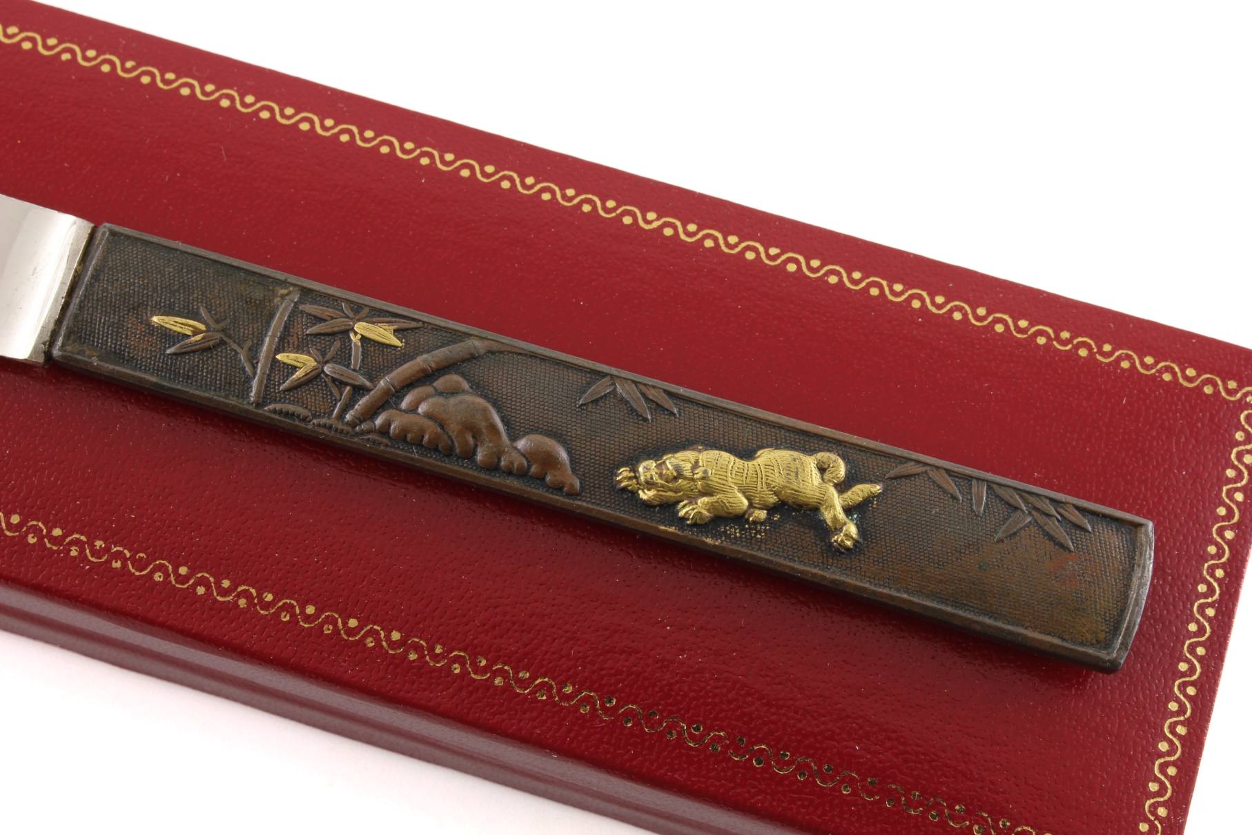 The bronze handle is decorated to both sides with tigers and foliage which are highlighted with real gold.