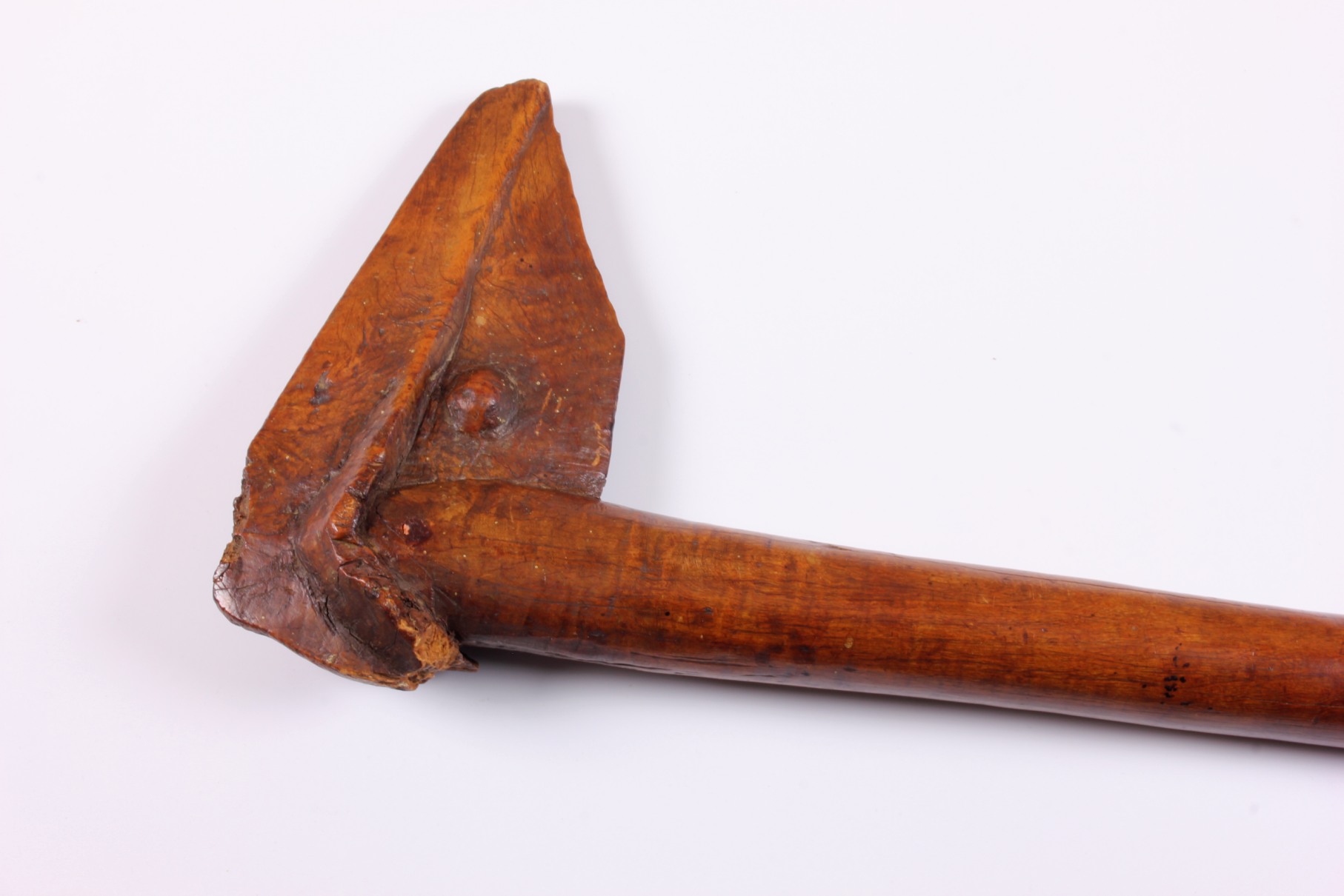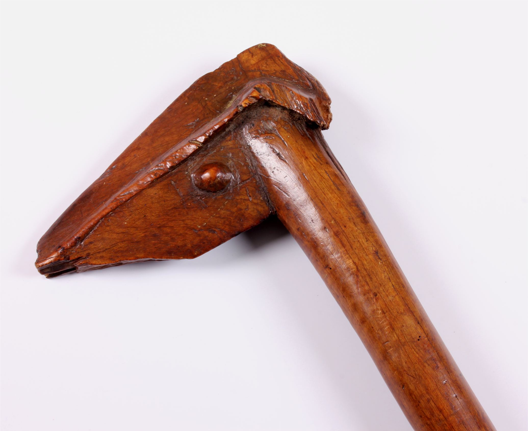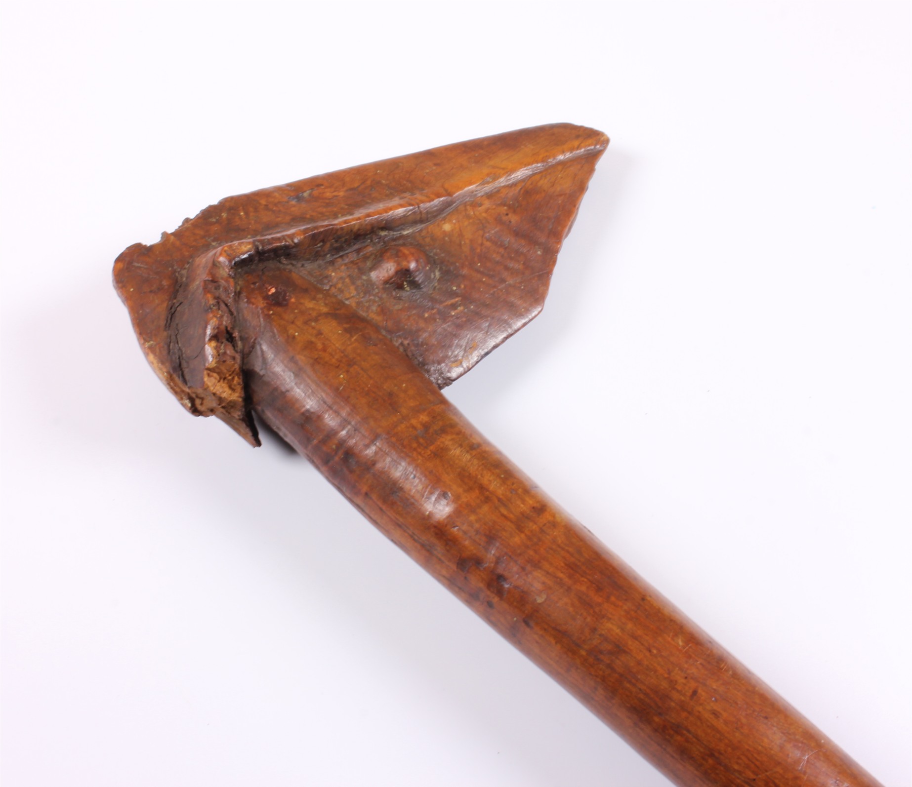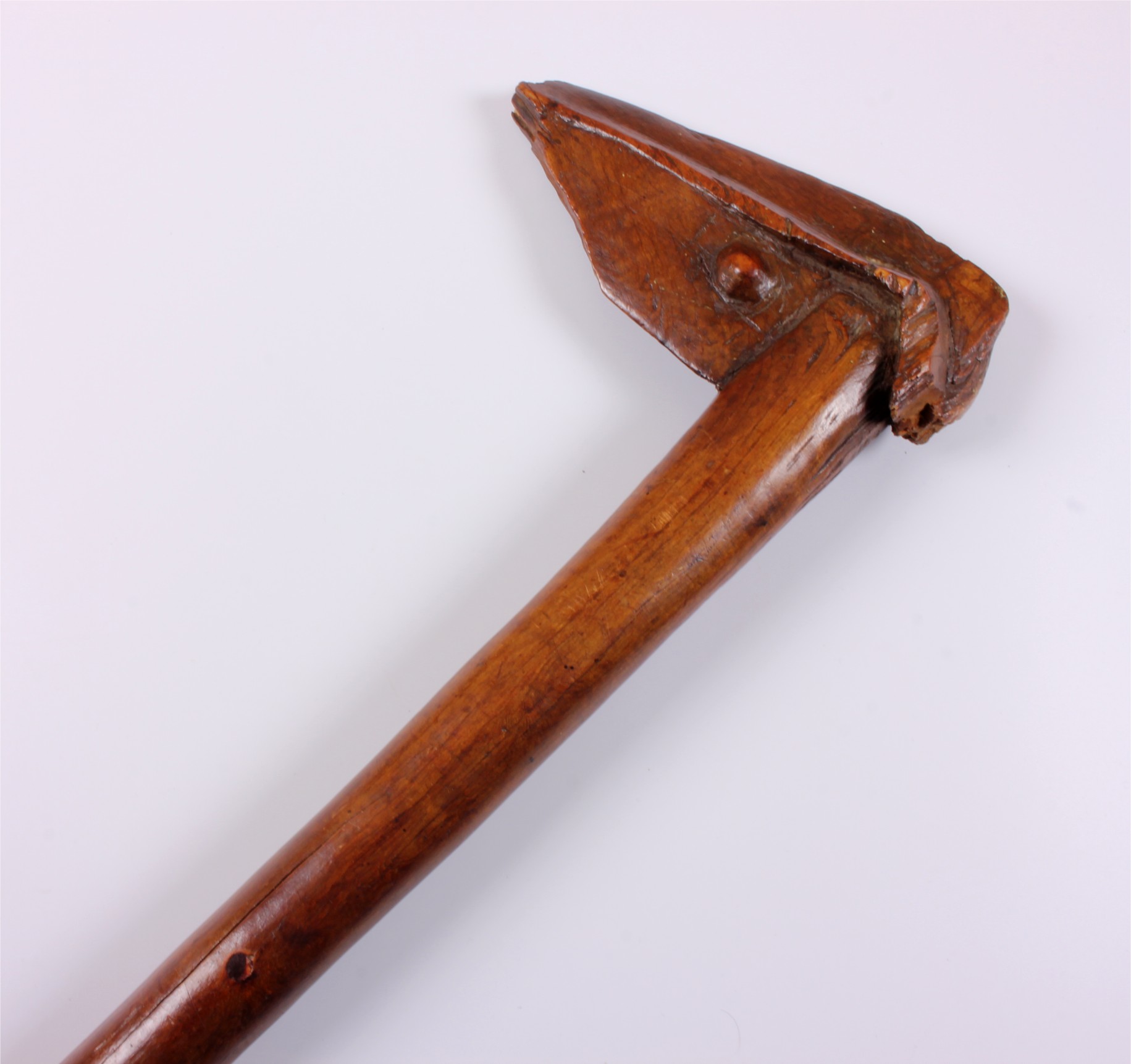 This antique Go Porowa Ra Maru club which is hand carved with a pointed head to resemble a bird's head / beak also has the usual stepped handle and has a rich patina.