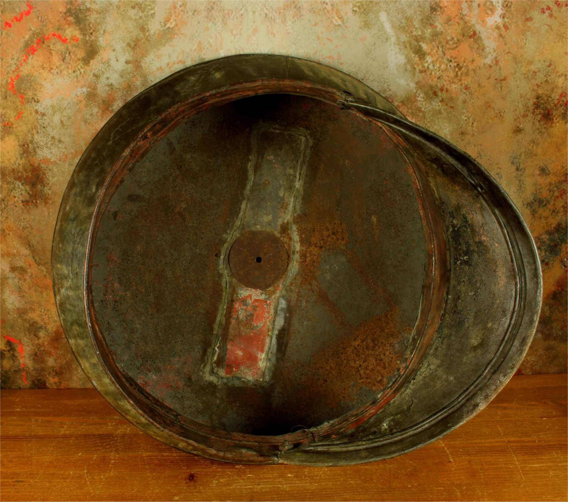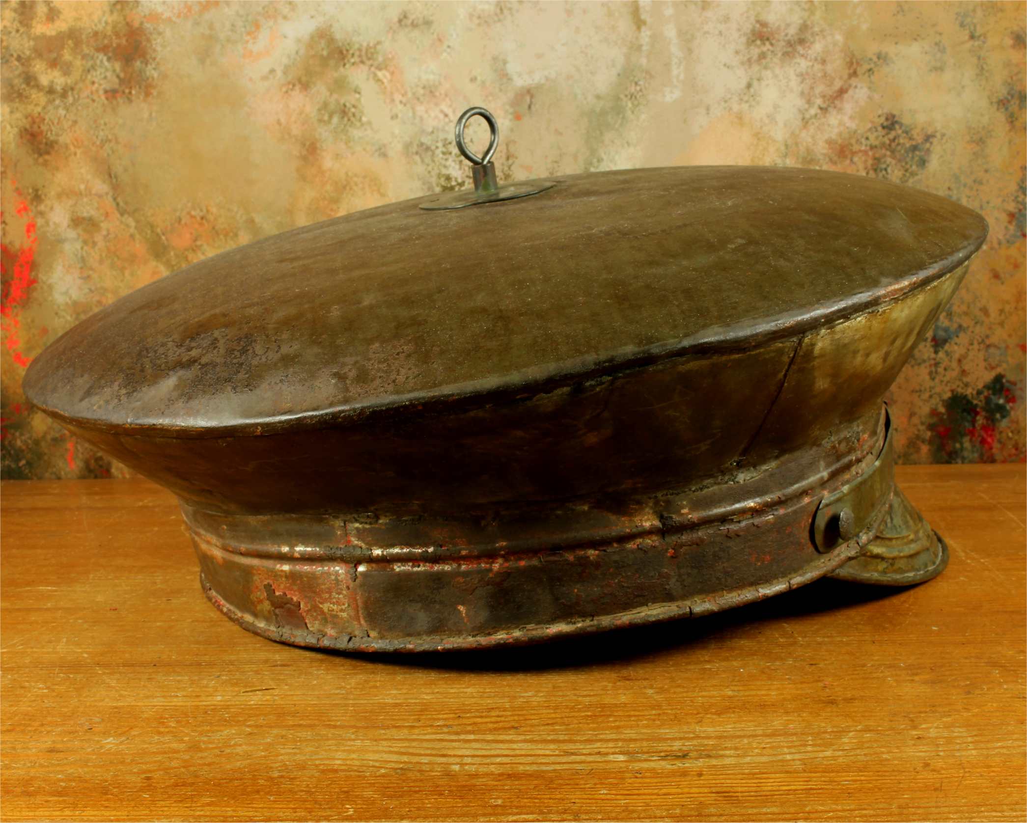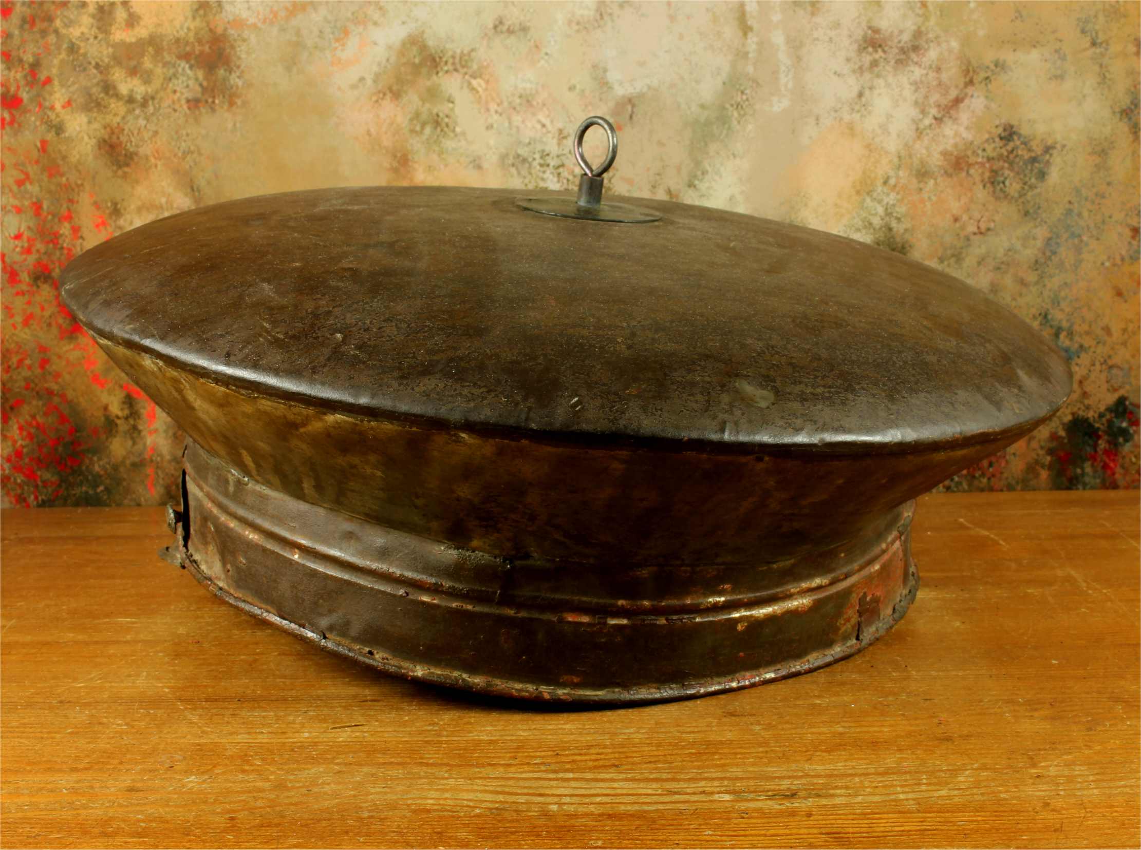 Condition: Very good used antique condition with signs of use and wear in keeping with age. Has a wonderful weathered look. Some wear, dents and splits. Can be hung from a chain using the later hook. Please see pictures.