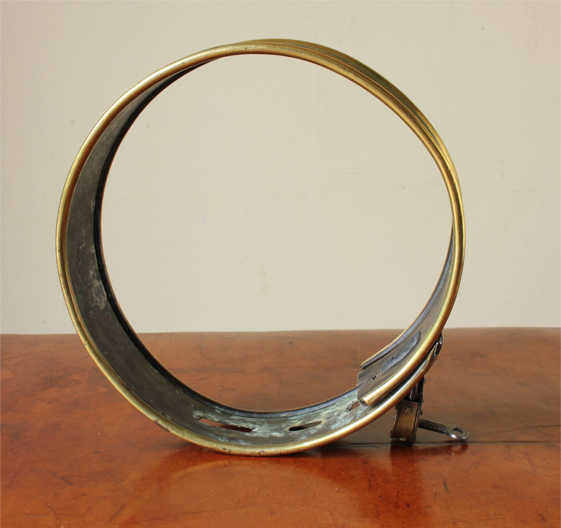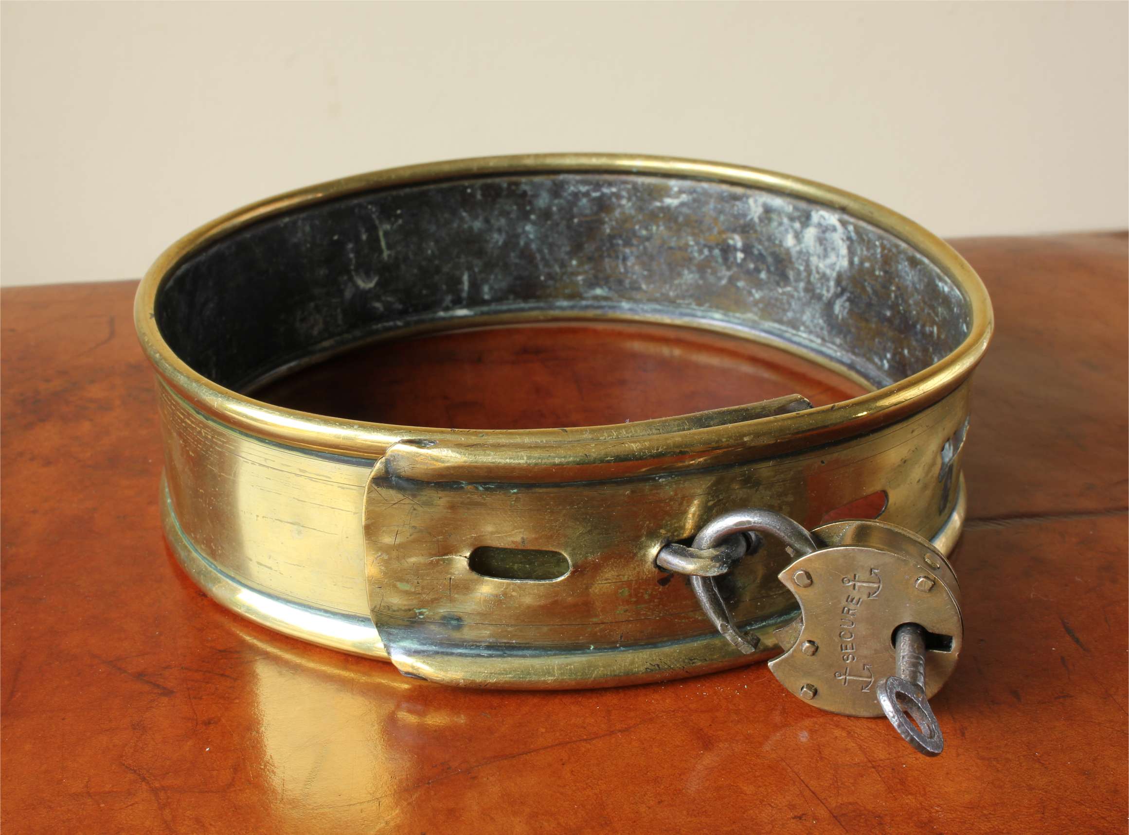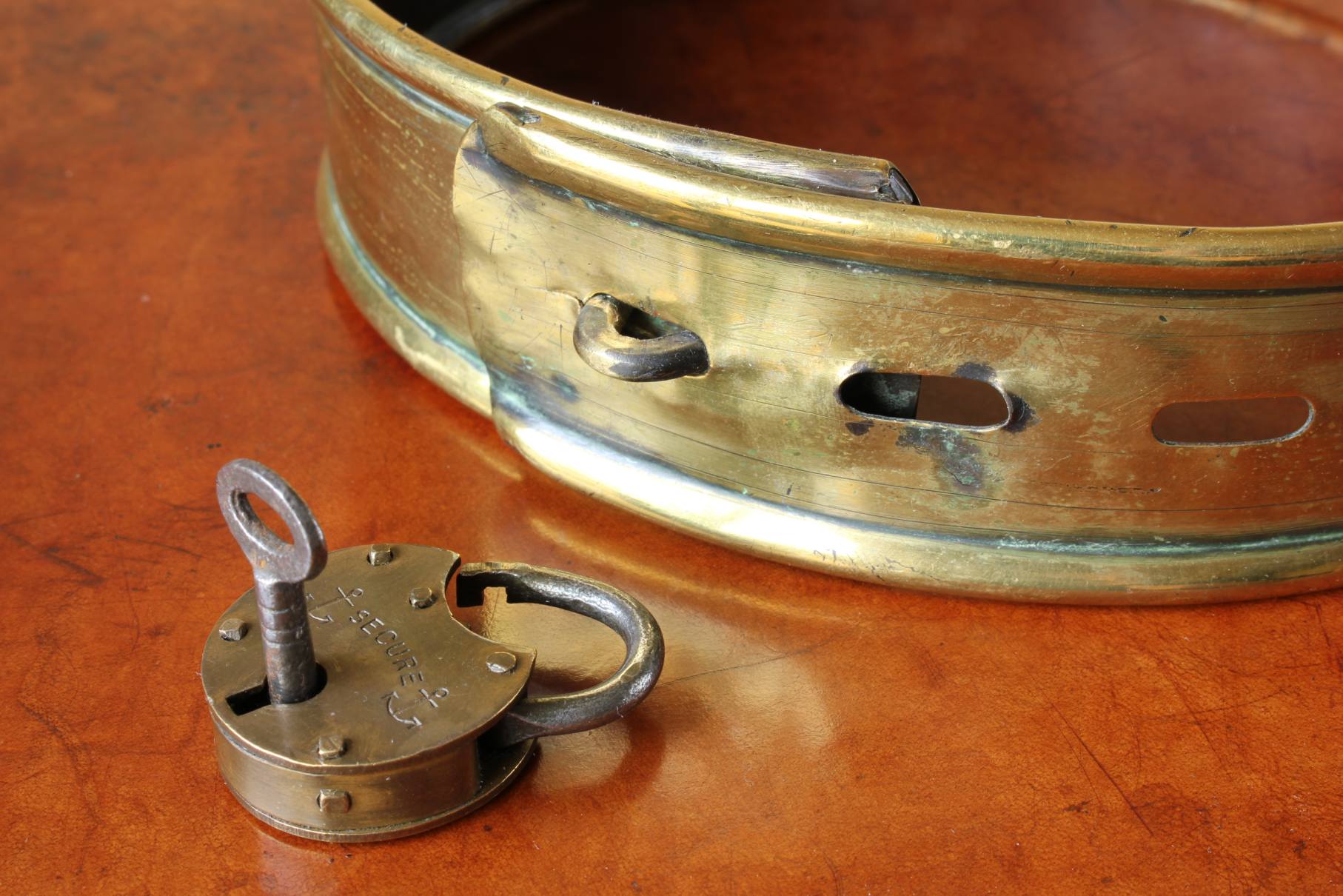 This large Victorian dog collar which is made of brass comes with rolled rims, is adjustable with four slots and dates from the 19th century.