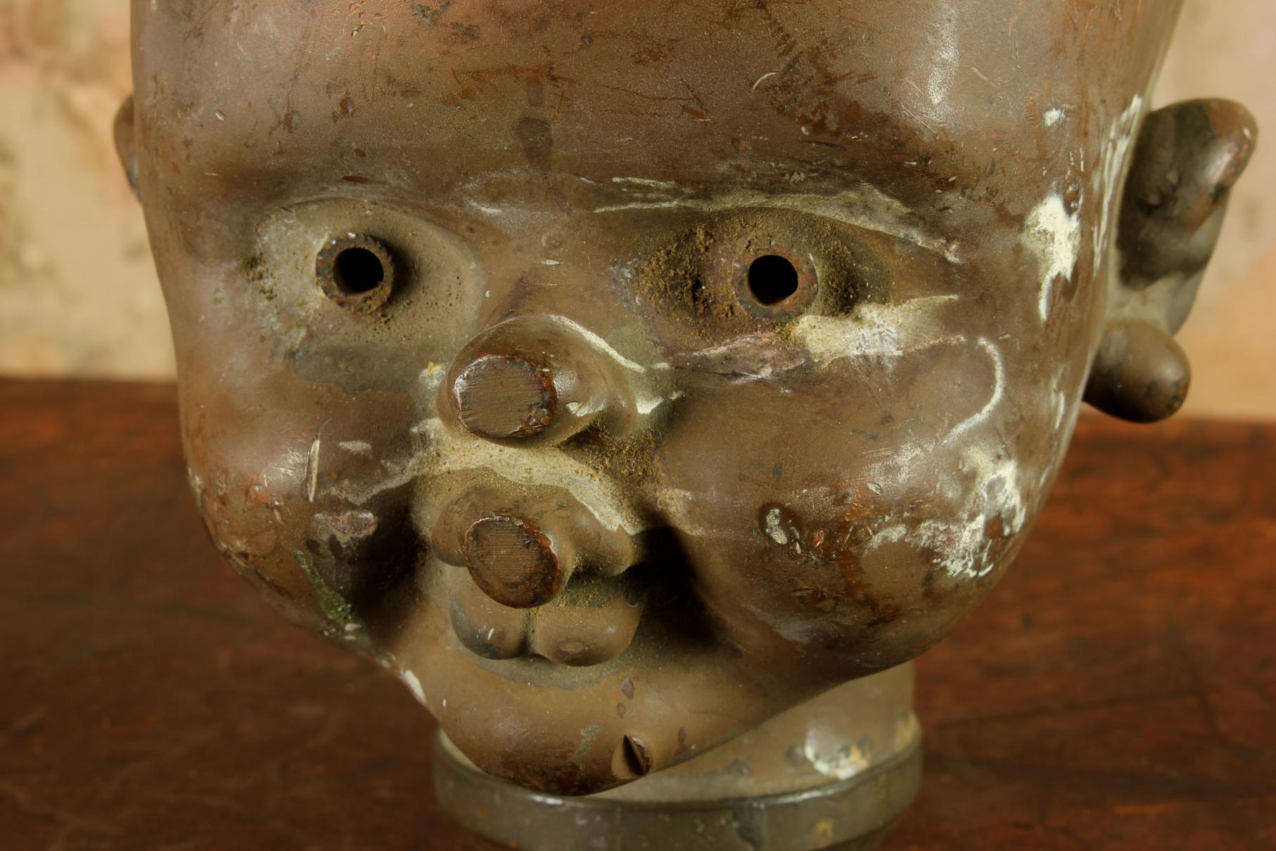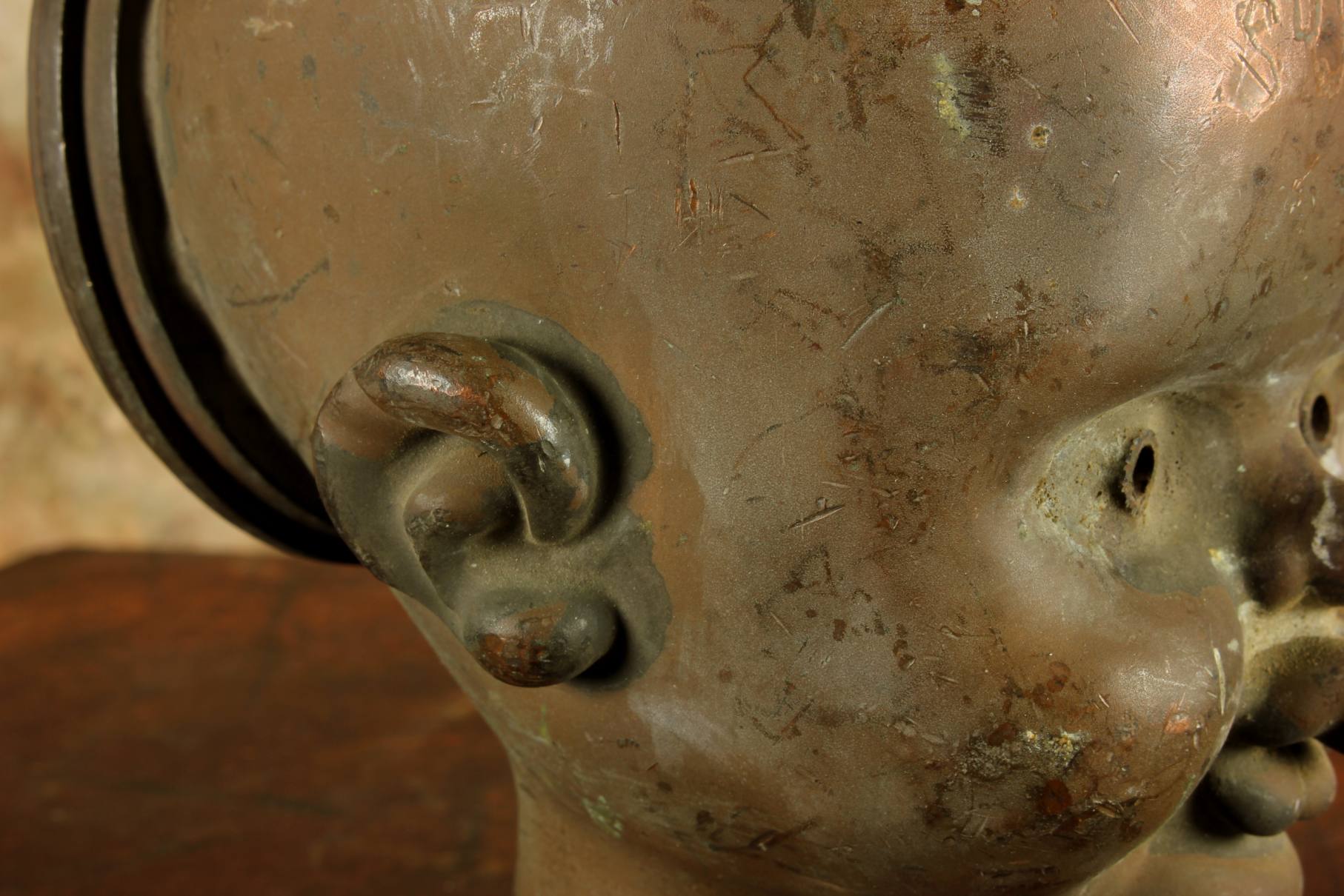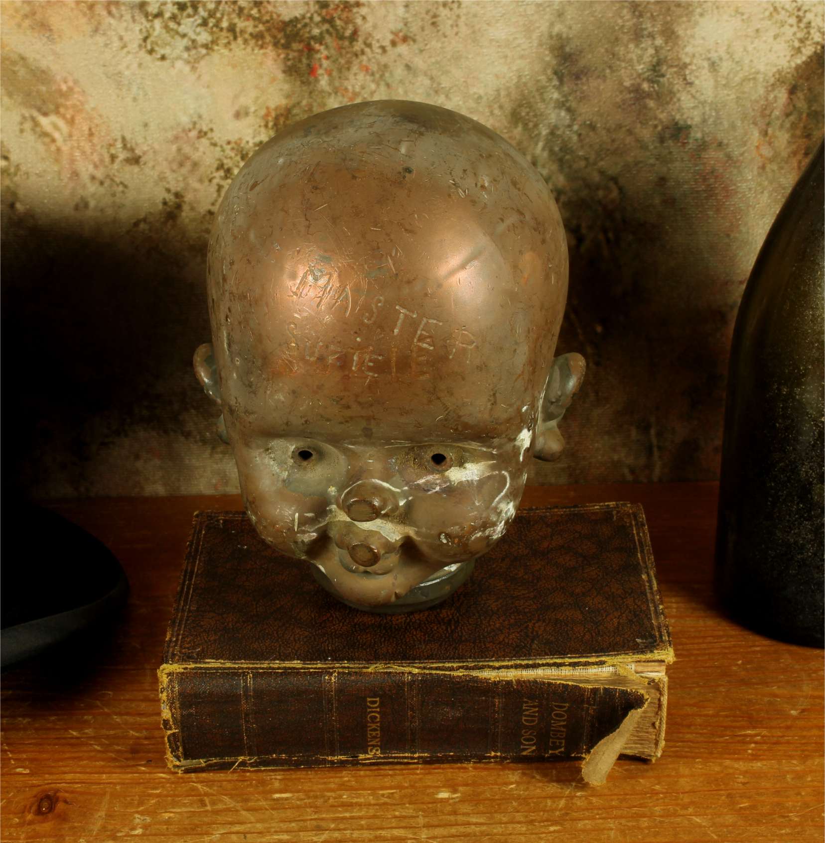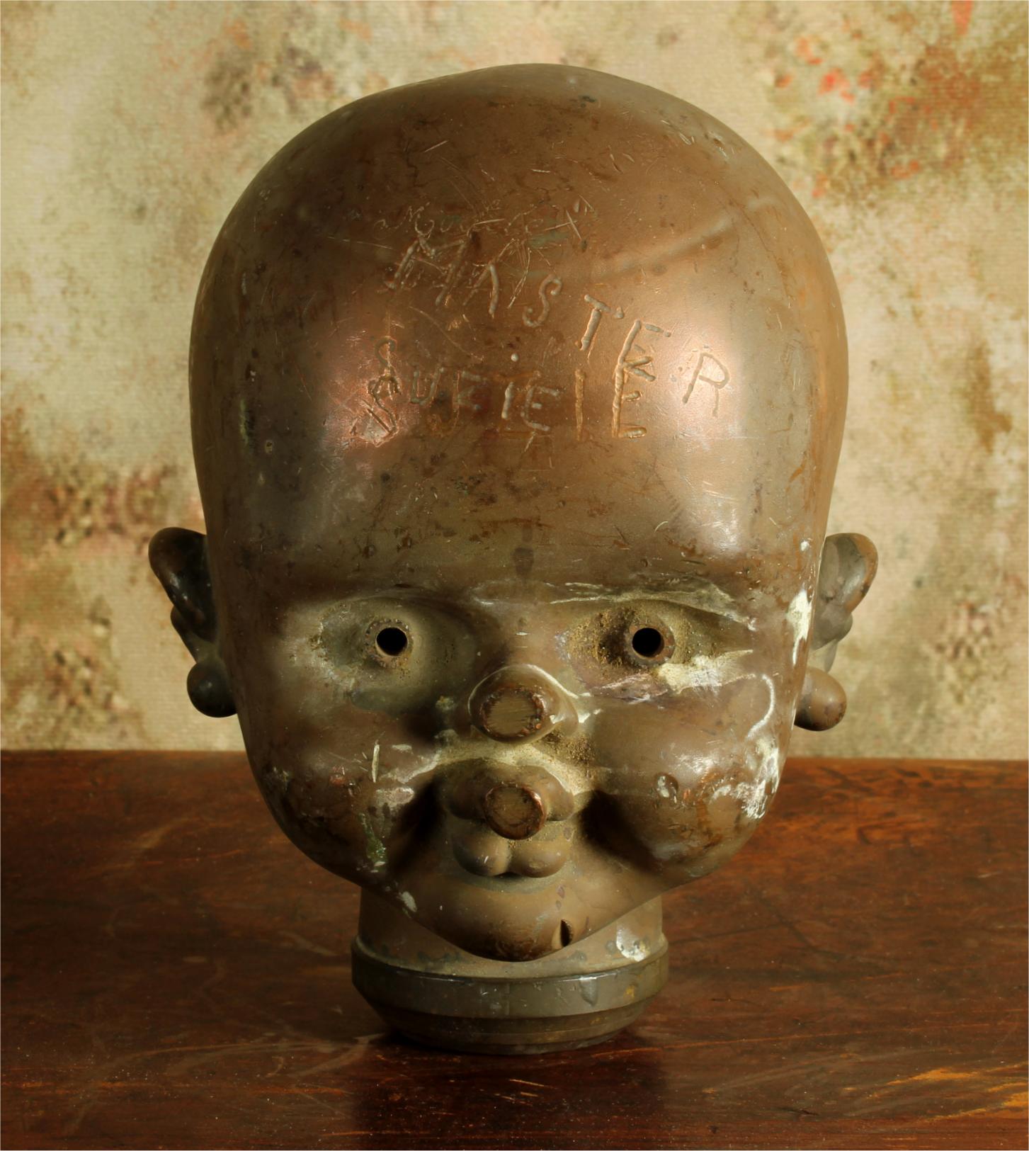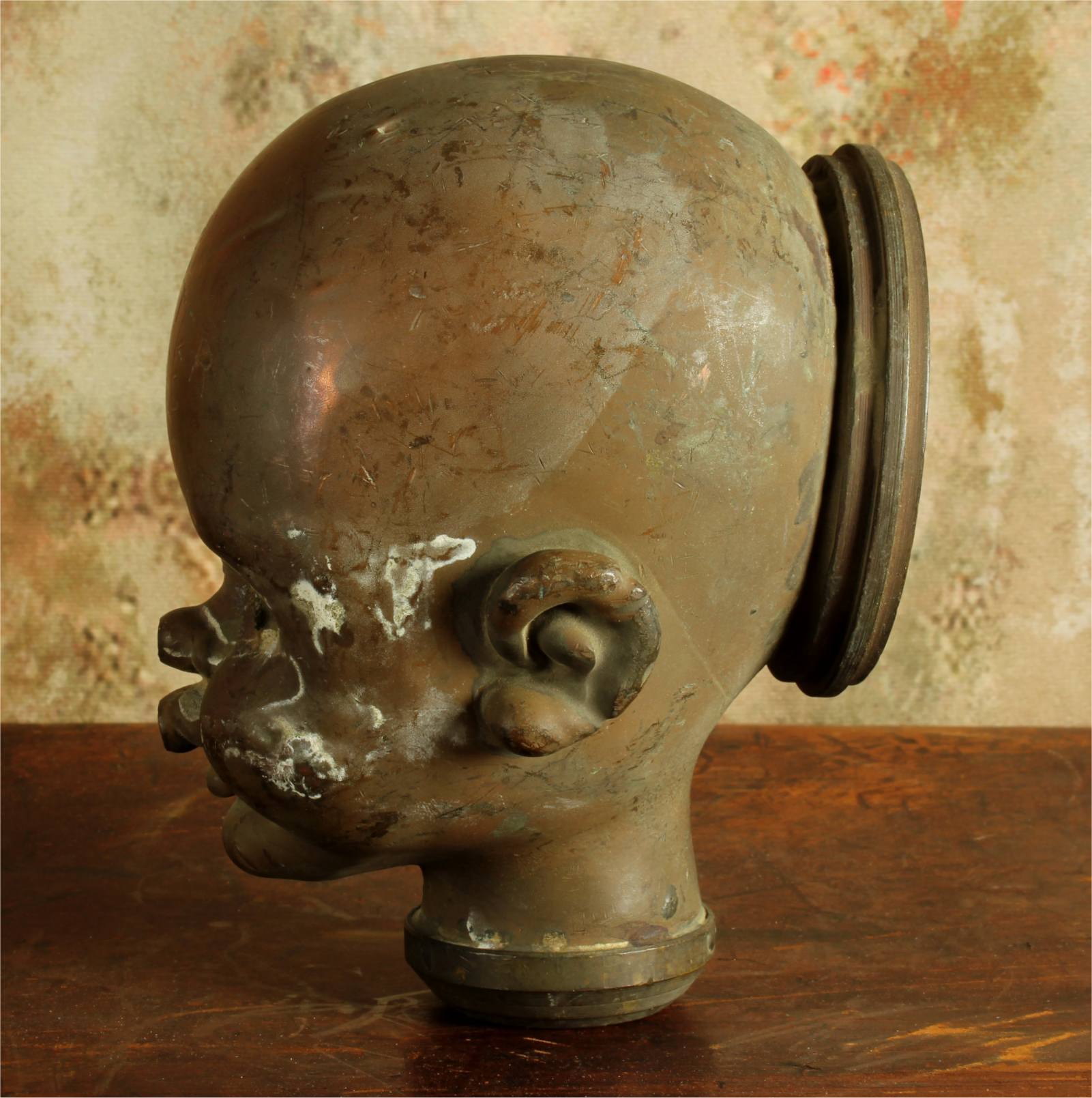 This large size doll head mould which dates from the mid 20th century is made of heavy copper and came from Bella Doll factory in Perpignan, France.