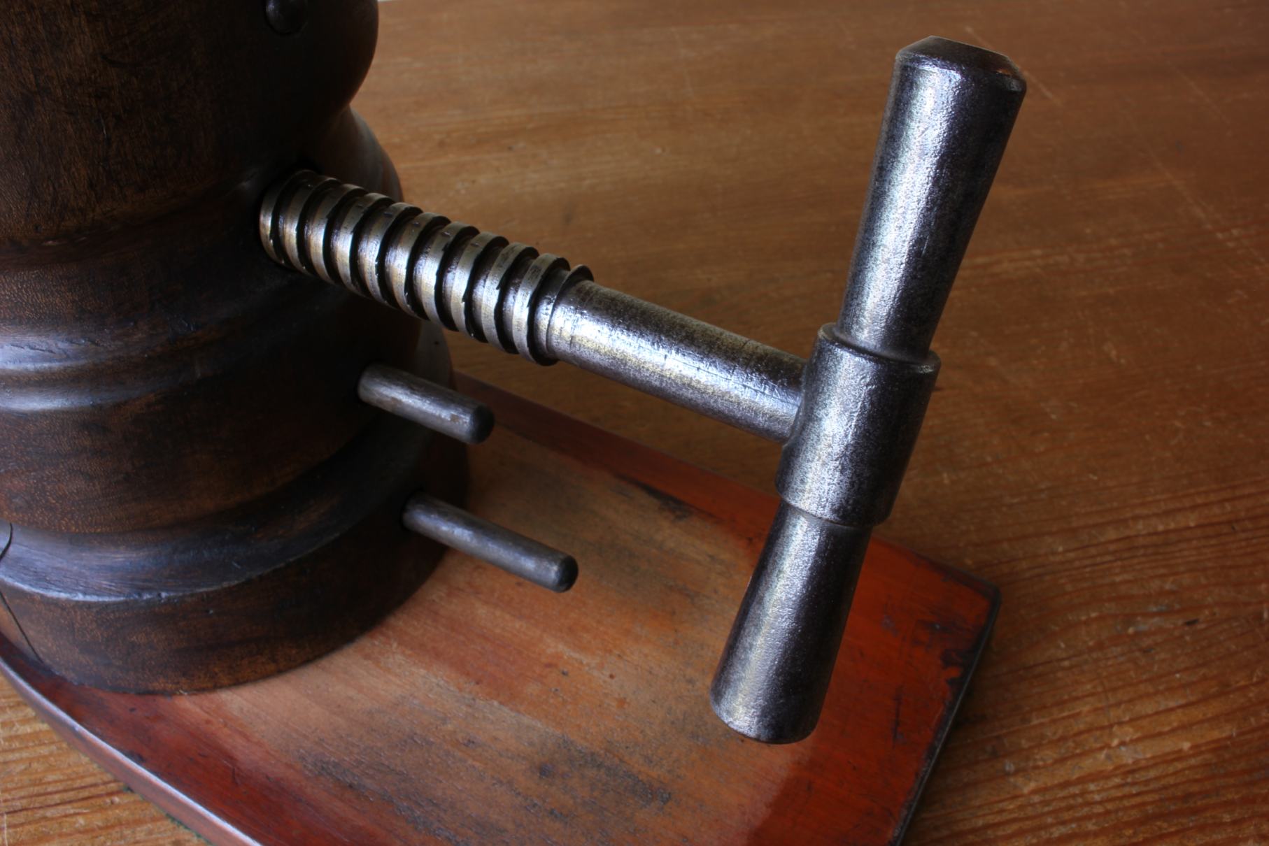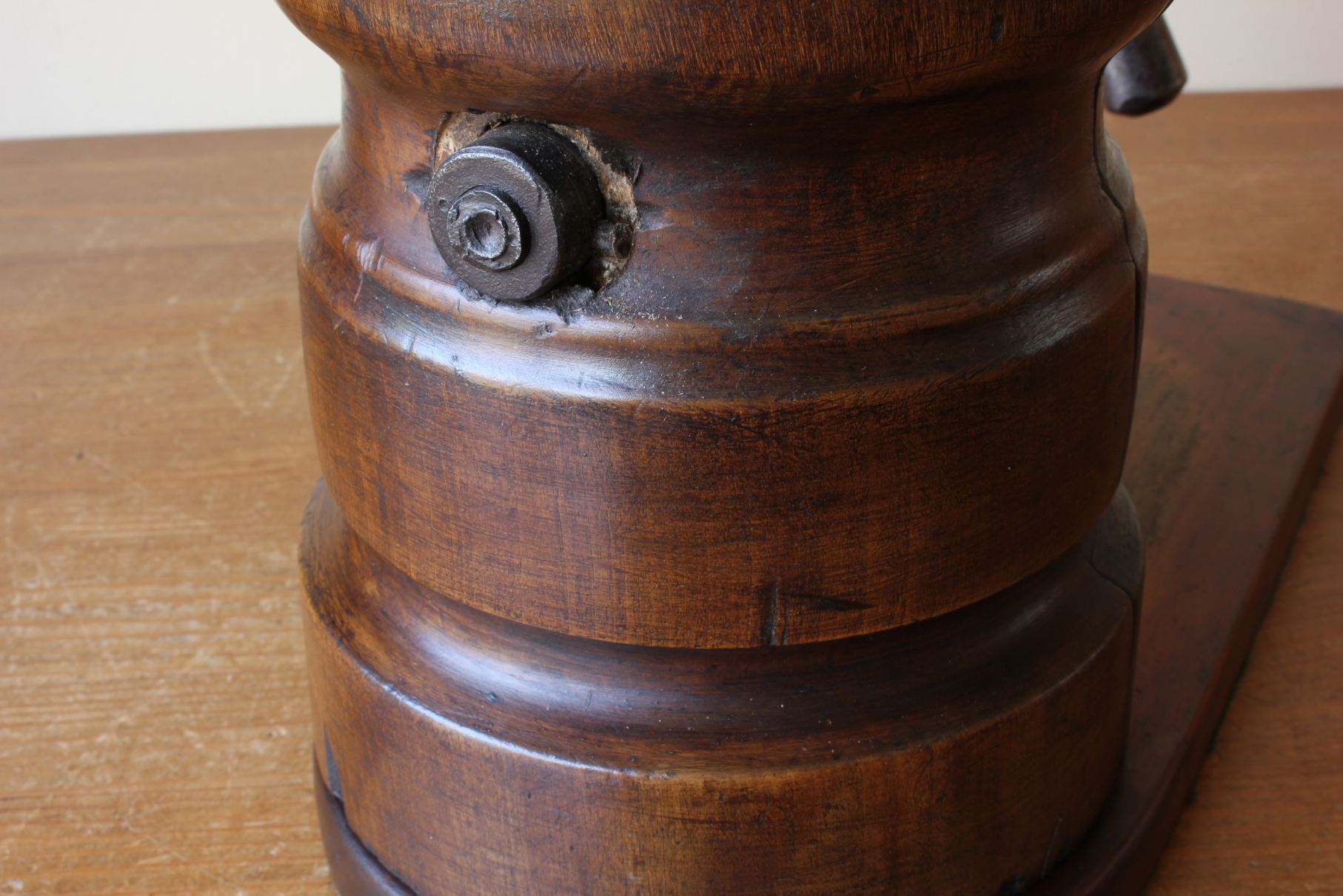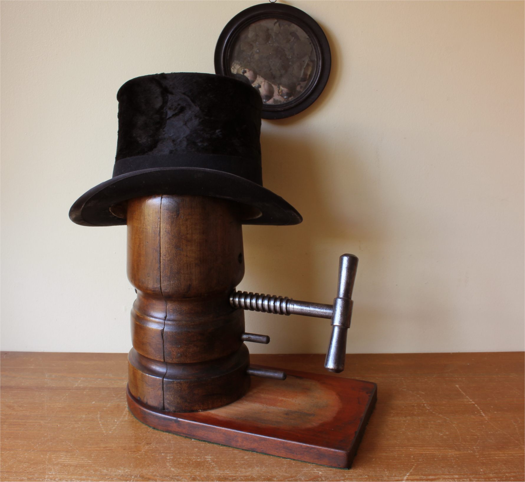 This handsome Milliner's mechanical hat stretcher which dates from c1900 sits on it's wooden base and has a large metal handle which opens and closes the wooden hat section to adjust the size when turned.