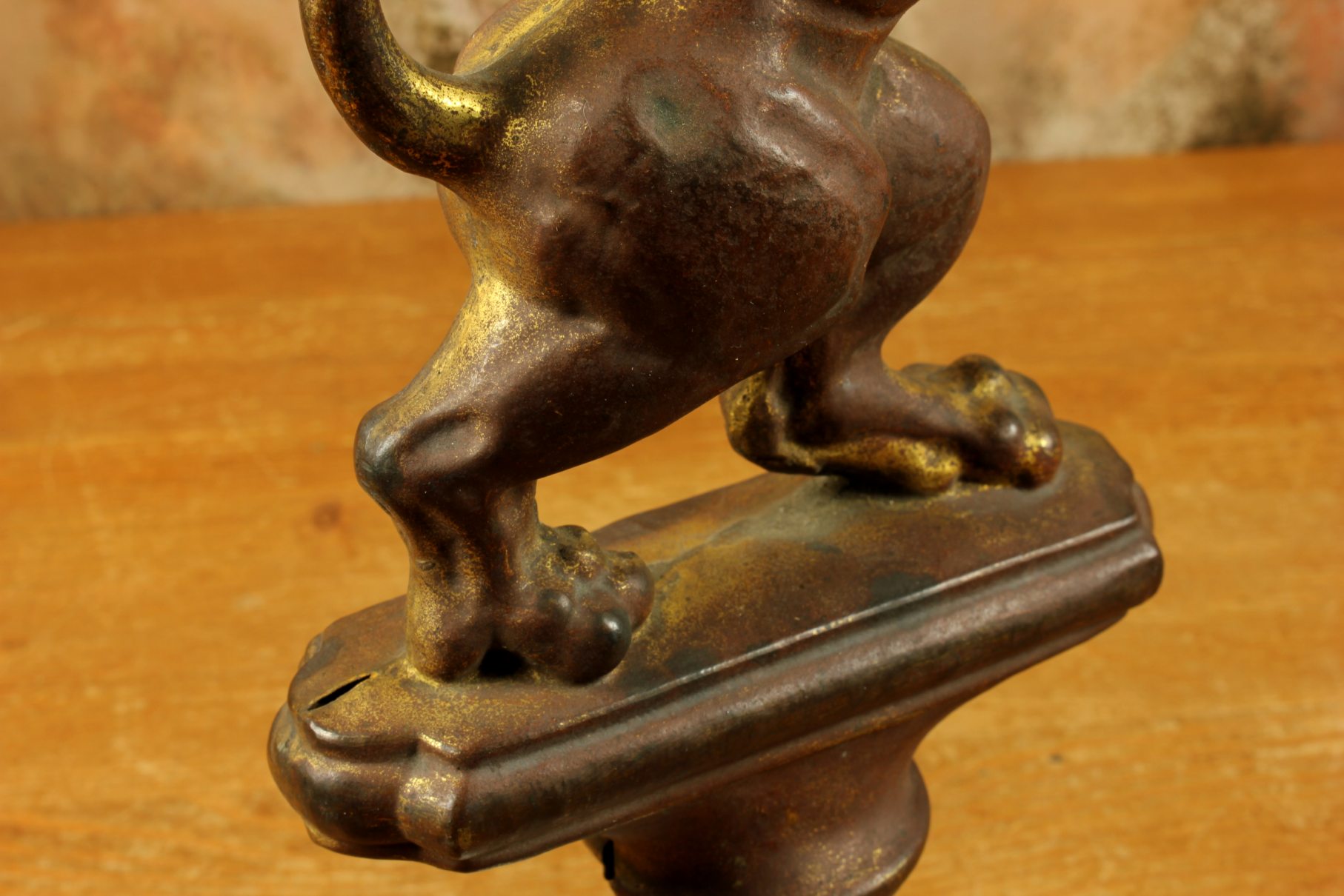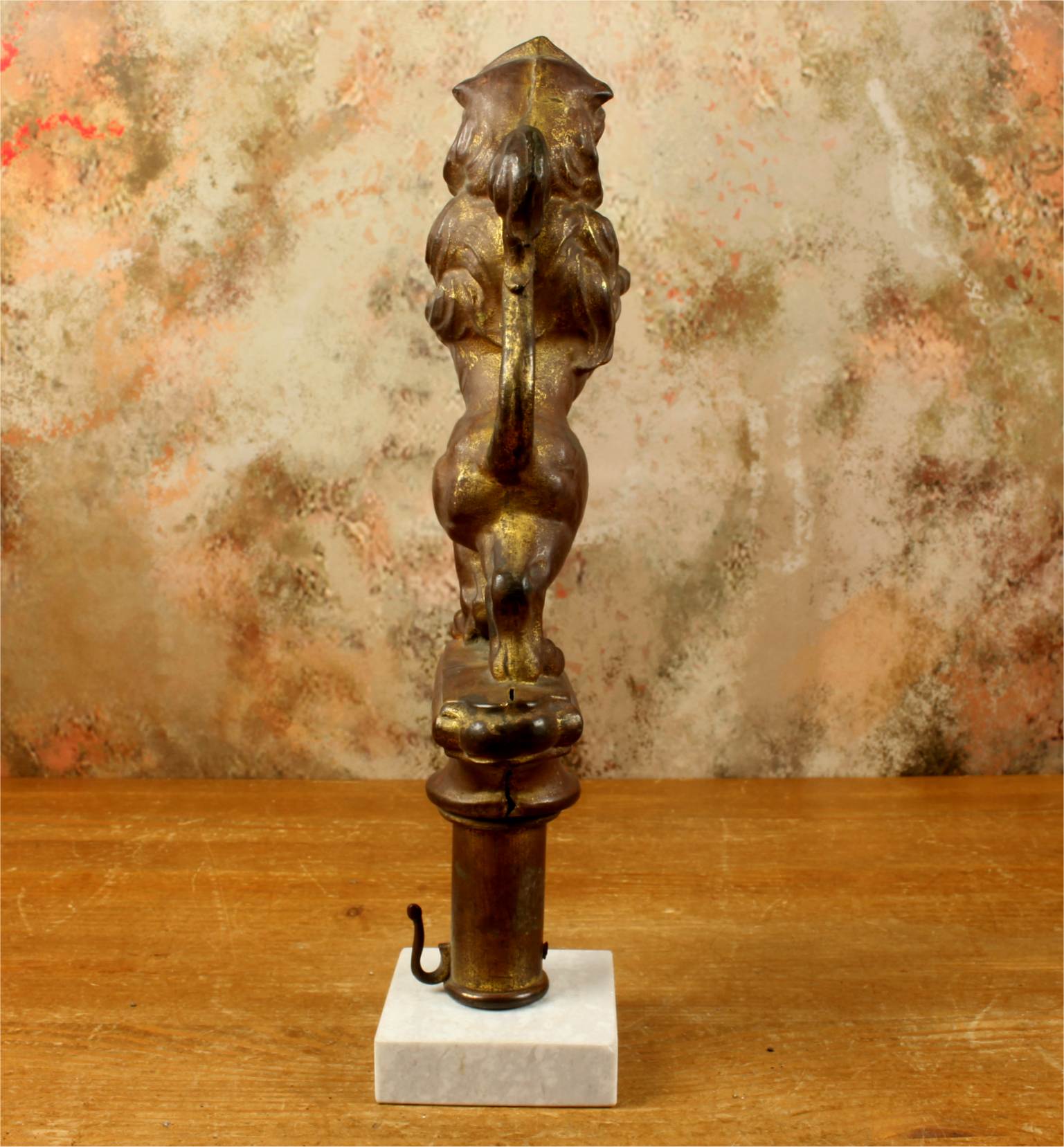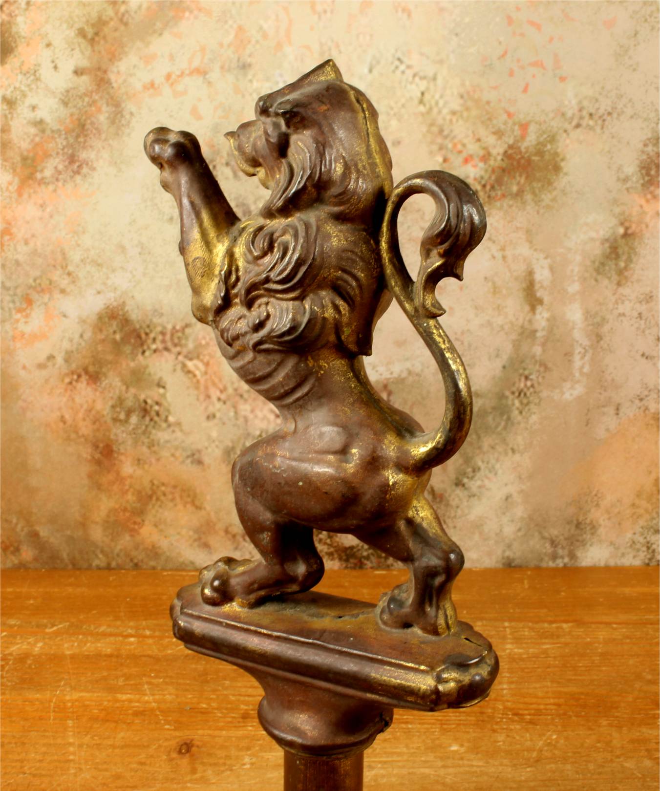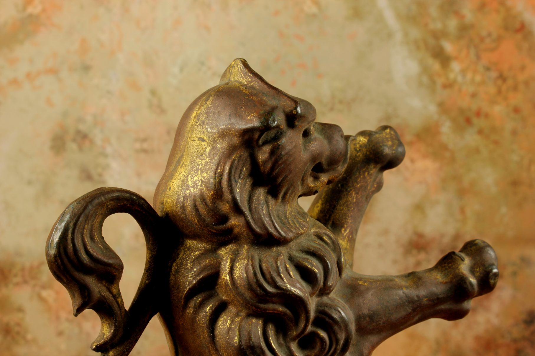 This brass lion figure which is stood on it's two back legs has a flowing mane, long curled tail, has a banner hanging hook and has a nice aged patina with remains of it's original gold gilding.