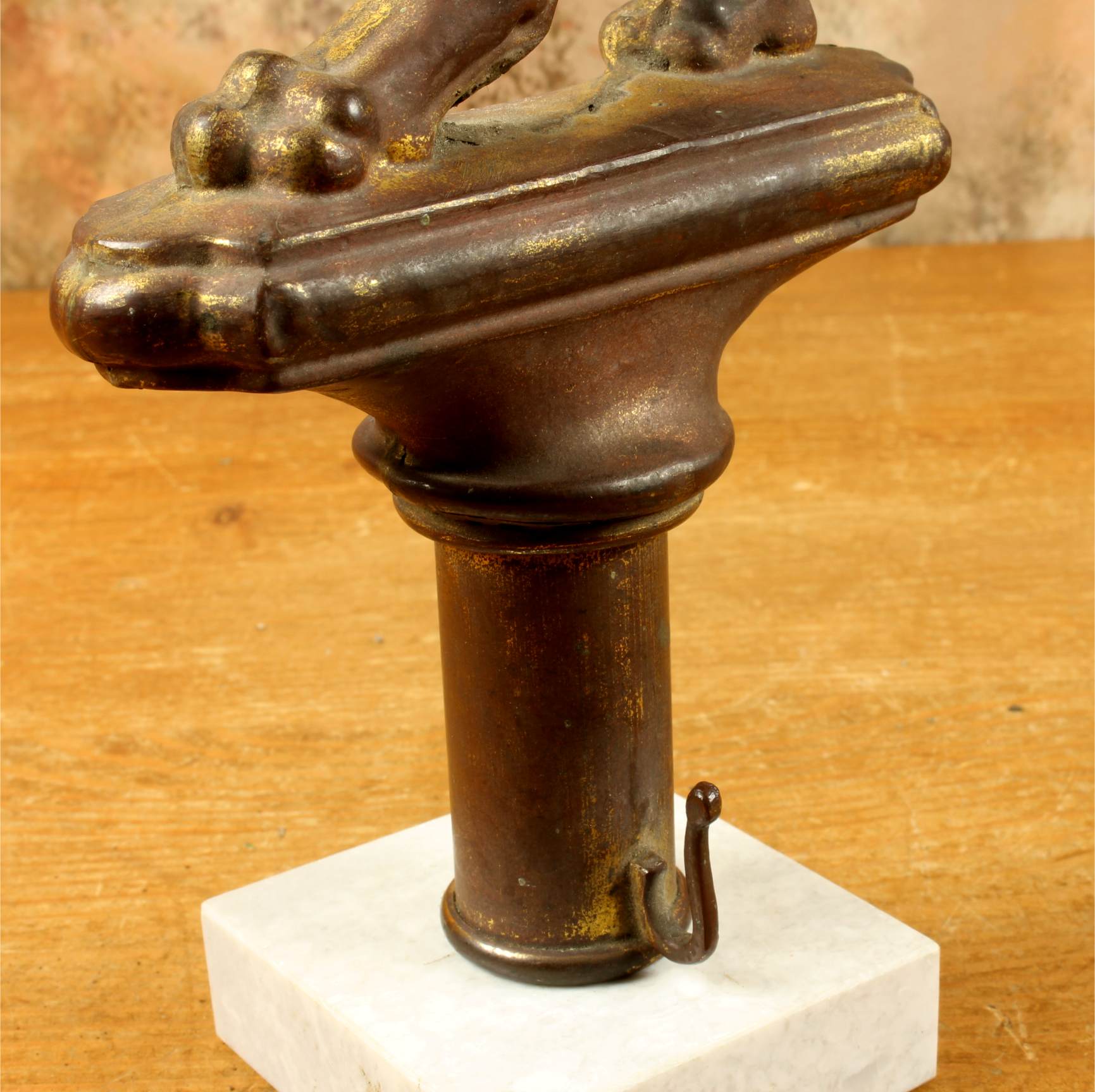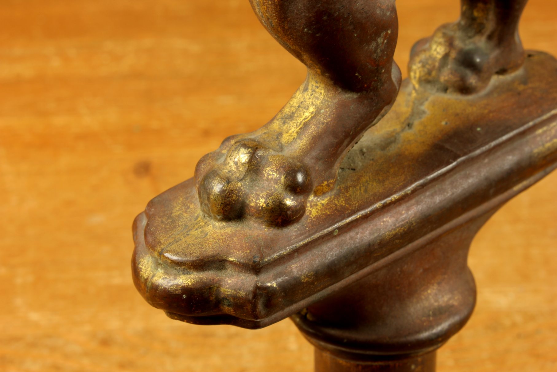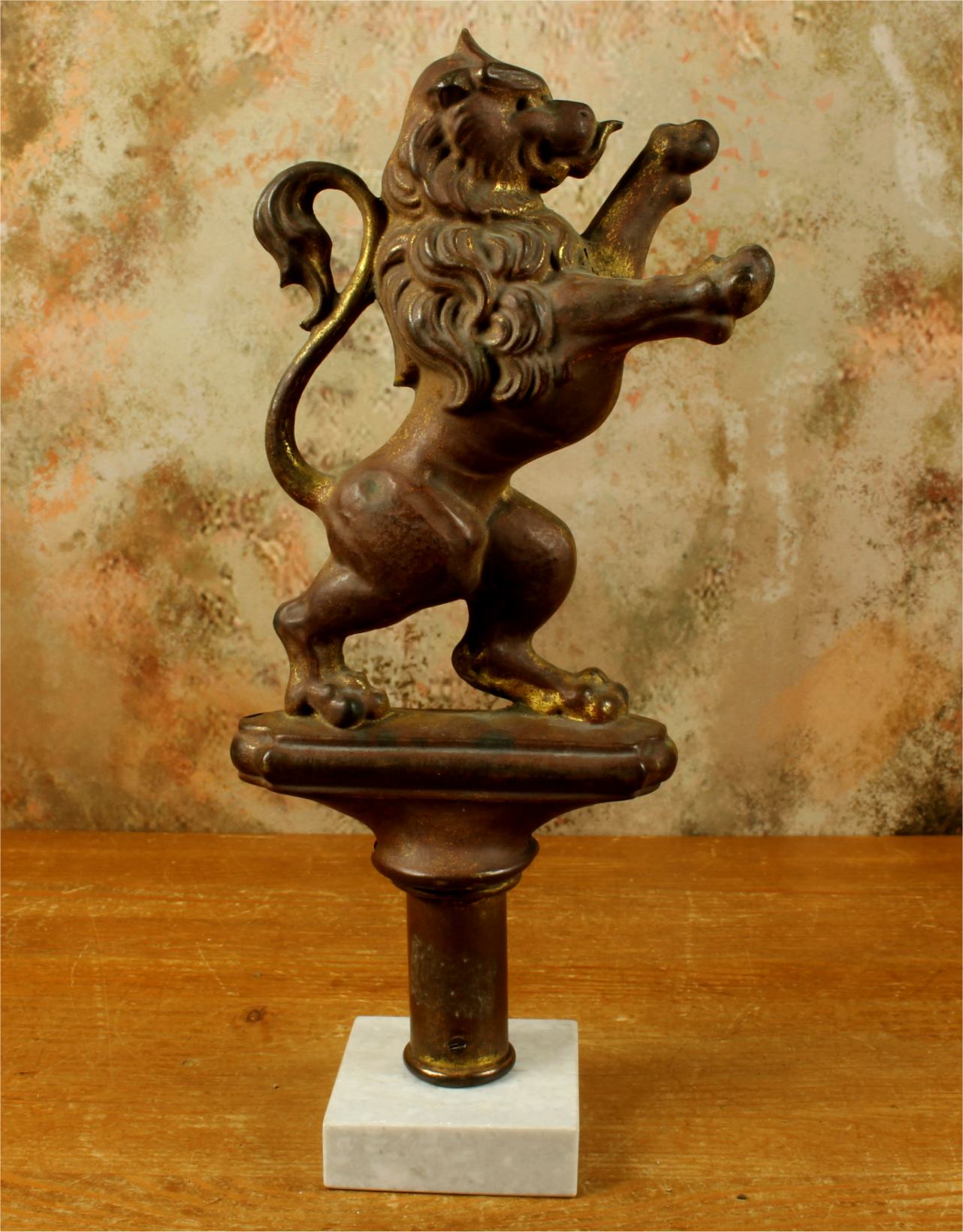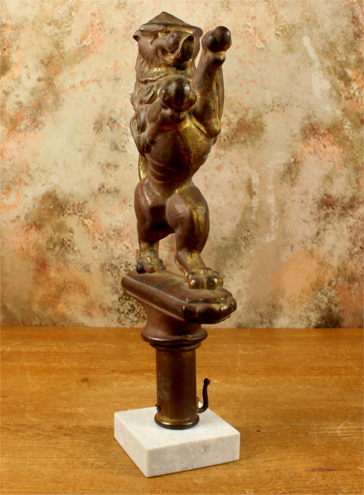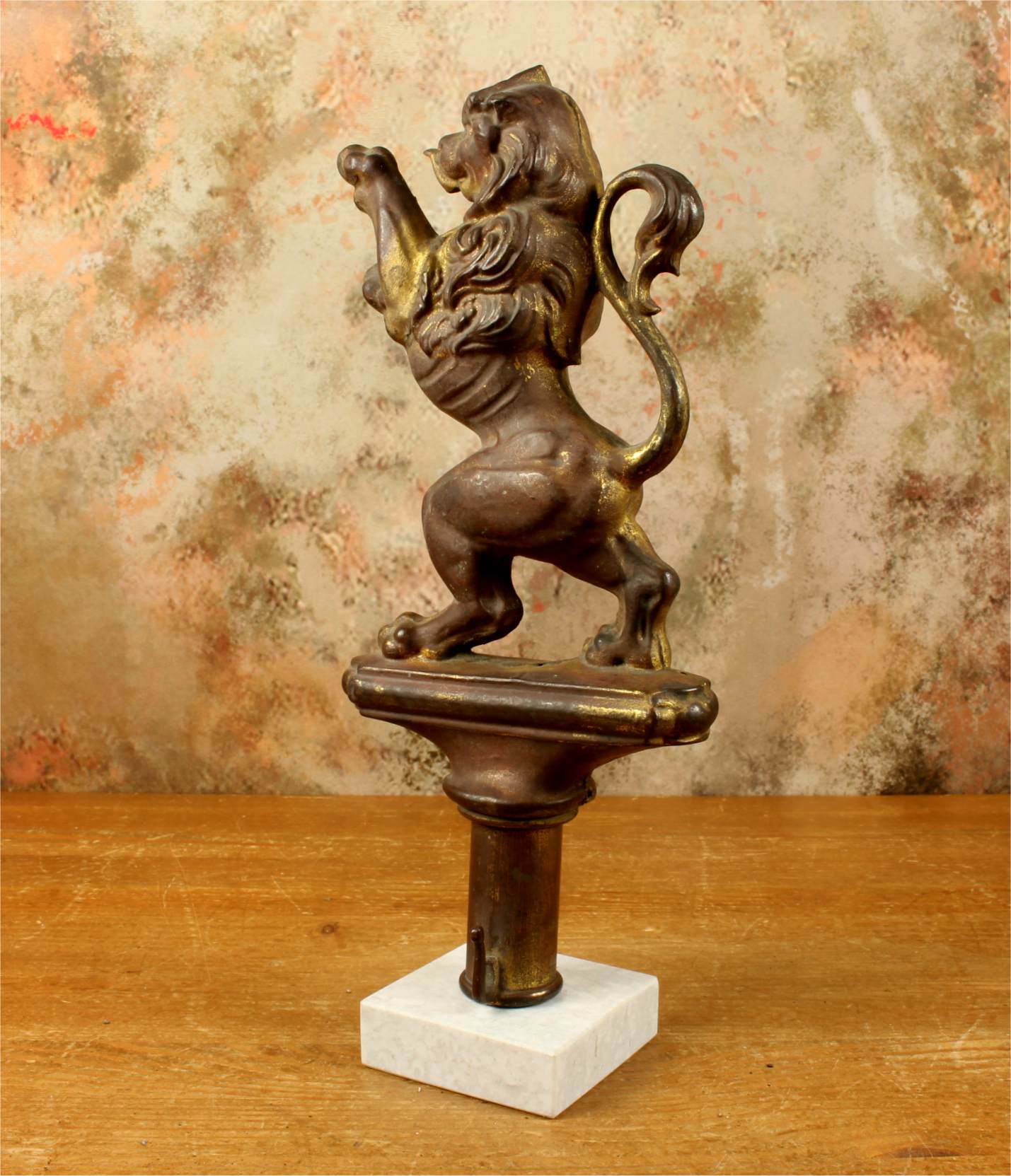 This brass lion figure which is stood on it's two back legs has a flowing mane, long curled tail, has a banner hanging hook and has a nice aged patina with remains of it's original gold gilding.