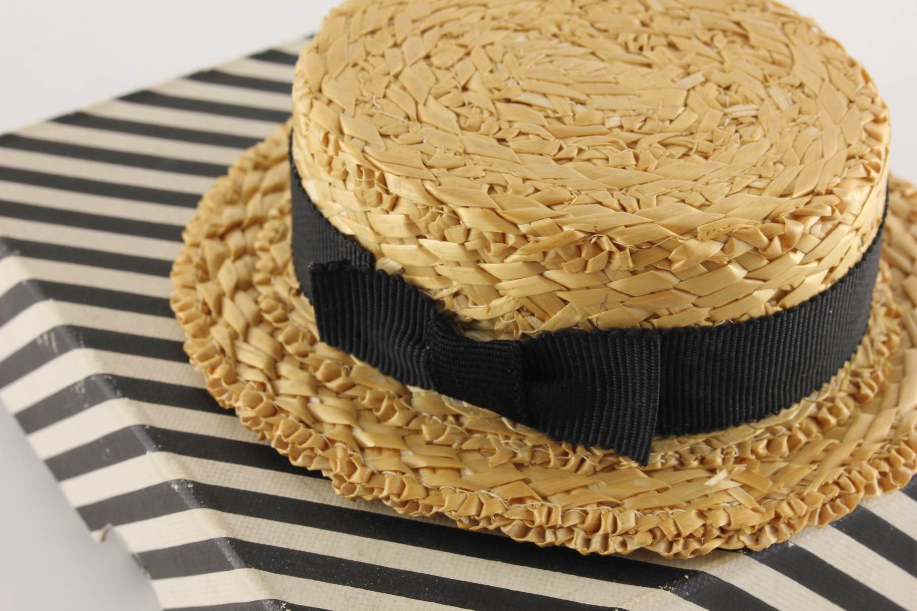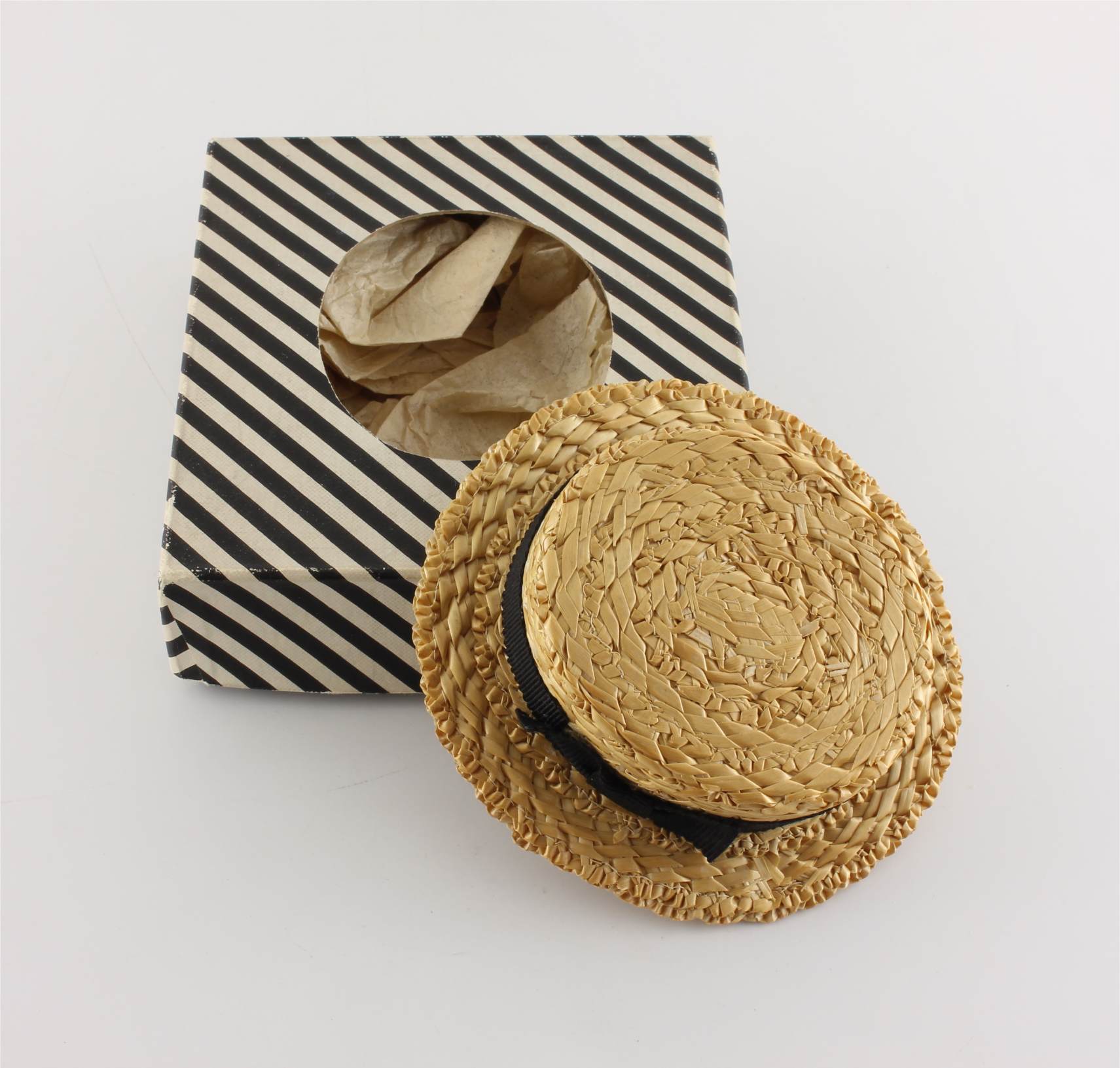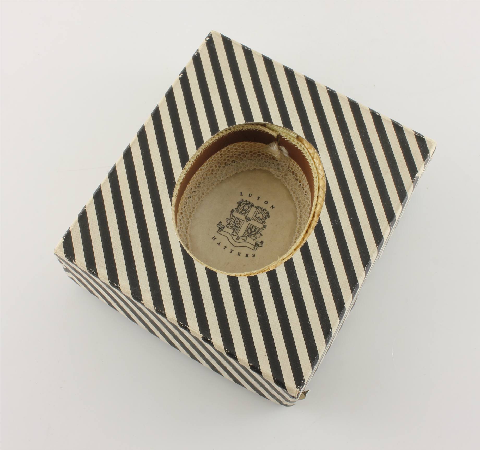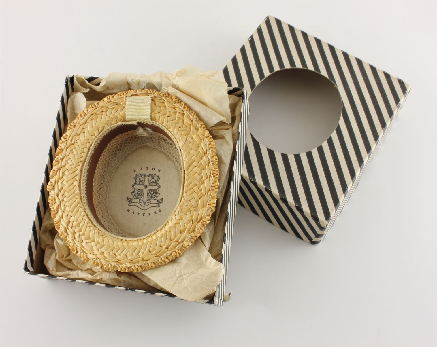This vintage miniature straw boater which is marked Luton Hatters to the inside silk lining is nicely made using real straw, has a leather head band and comes in it's original box.