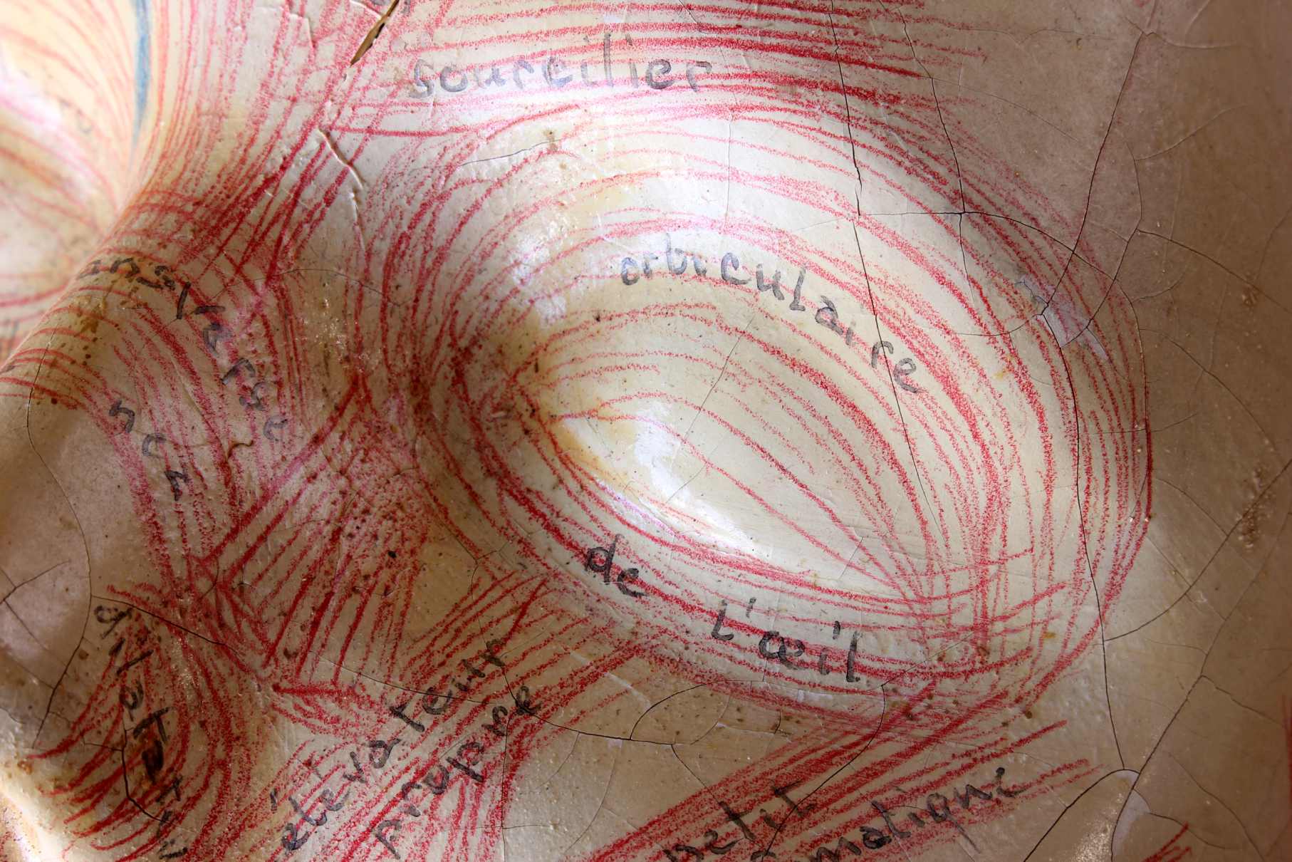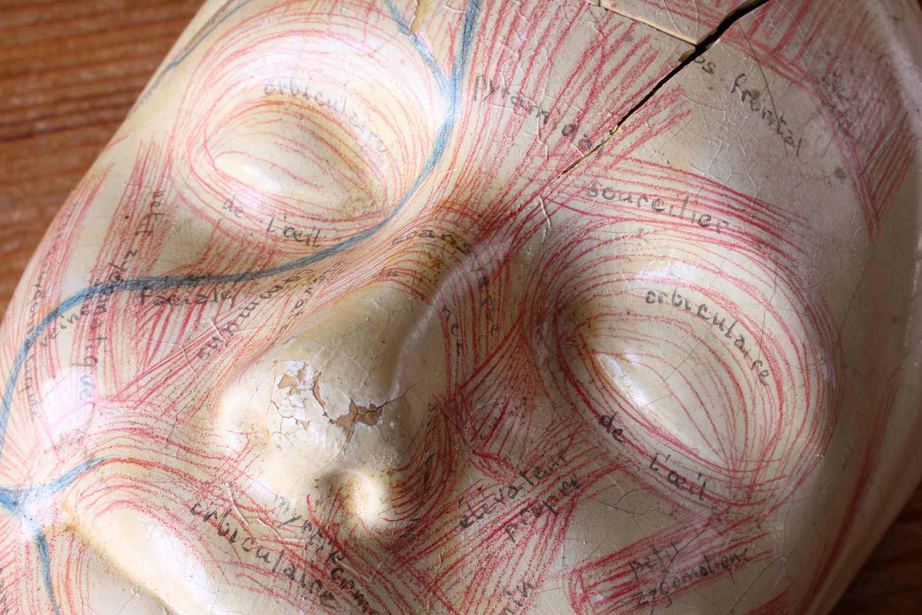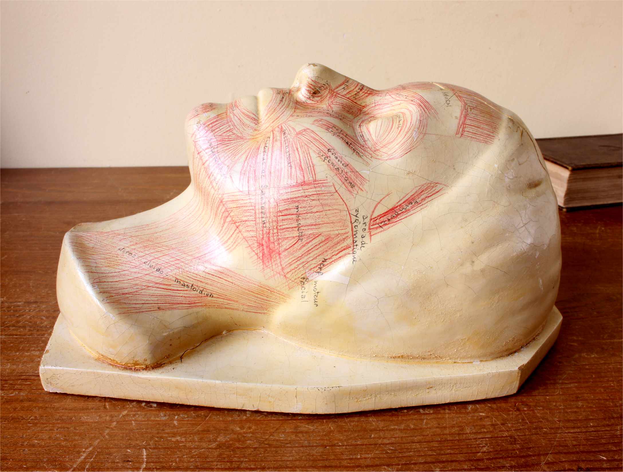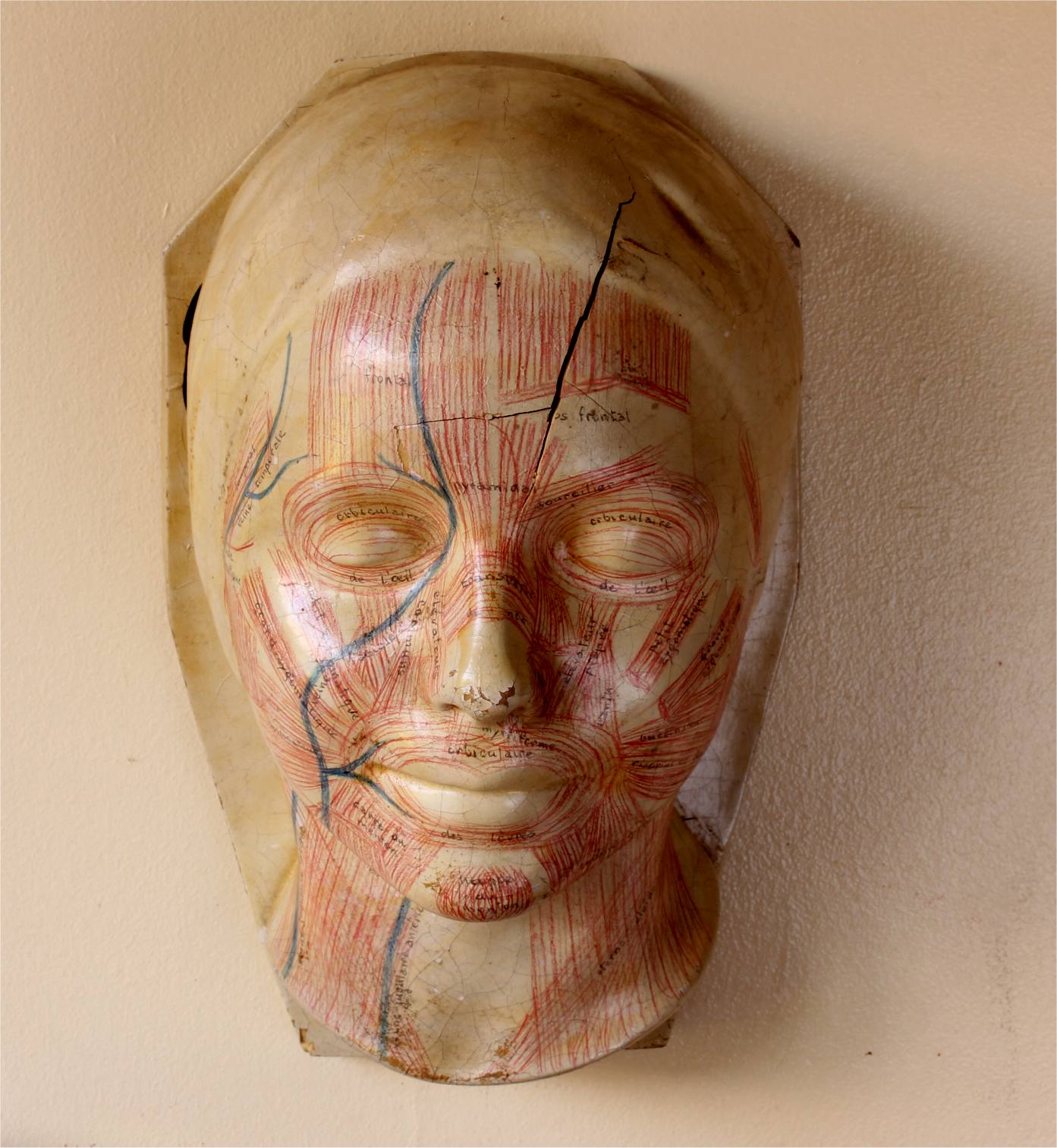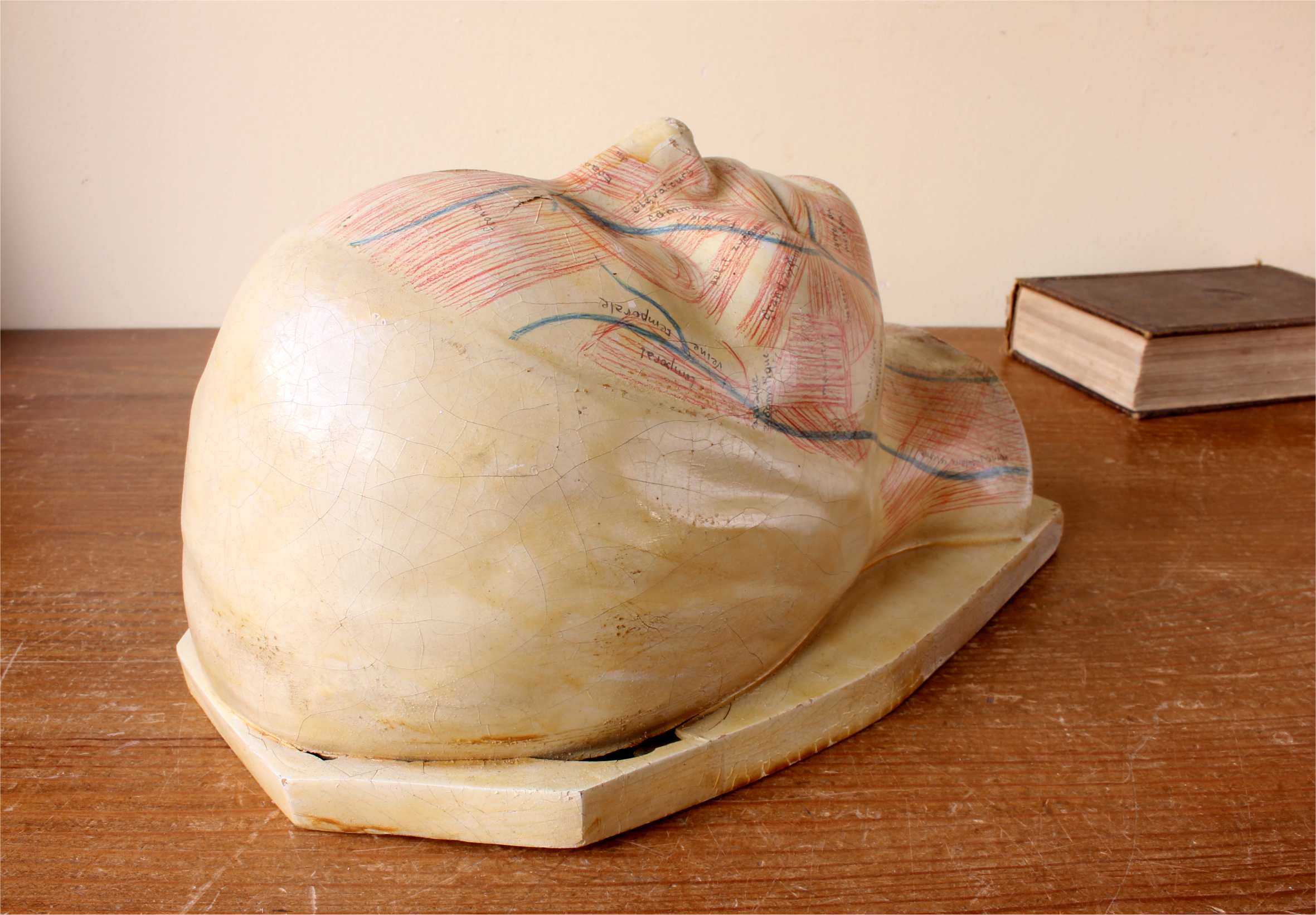 This educational anatomical model of a head which is made of hardened rubber is skilfully hand painted to show the facial muscles and primary veins in a human face with annotated notes.