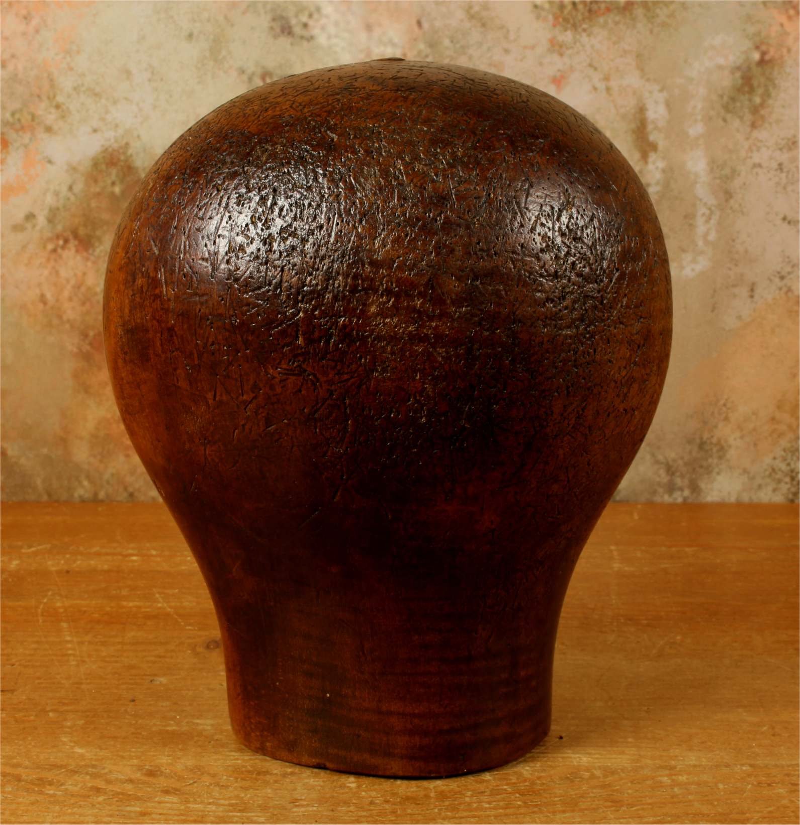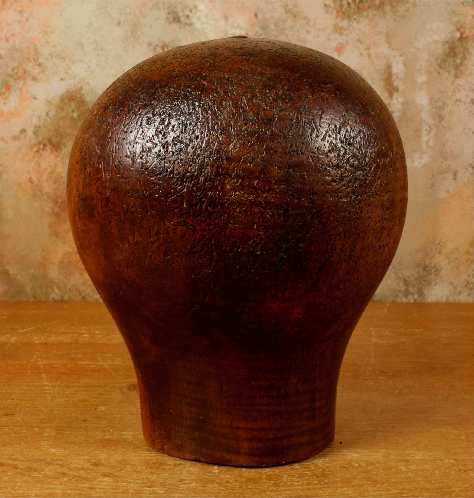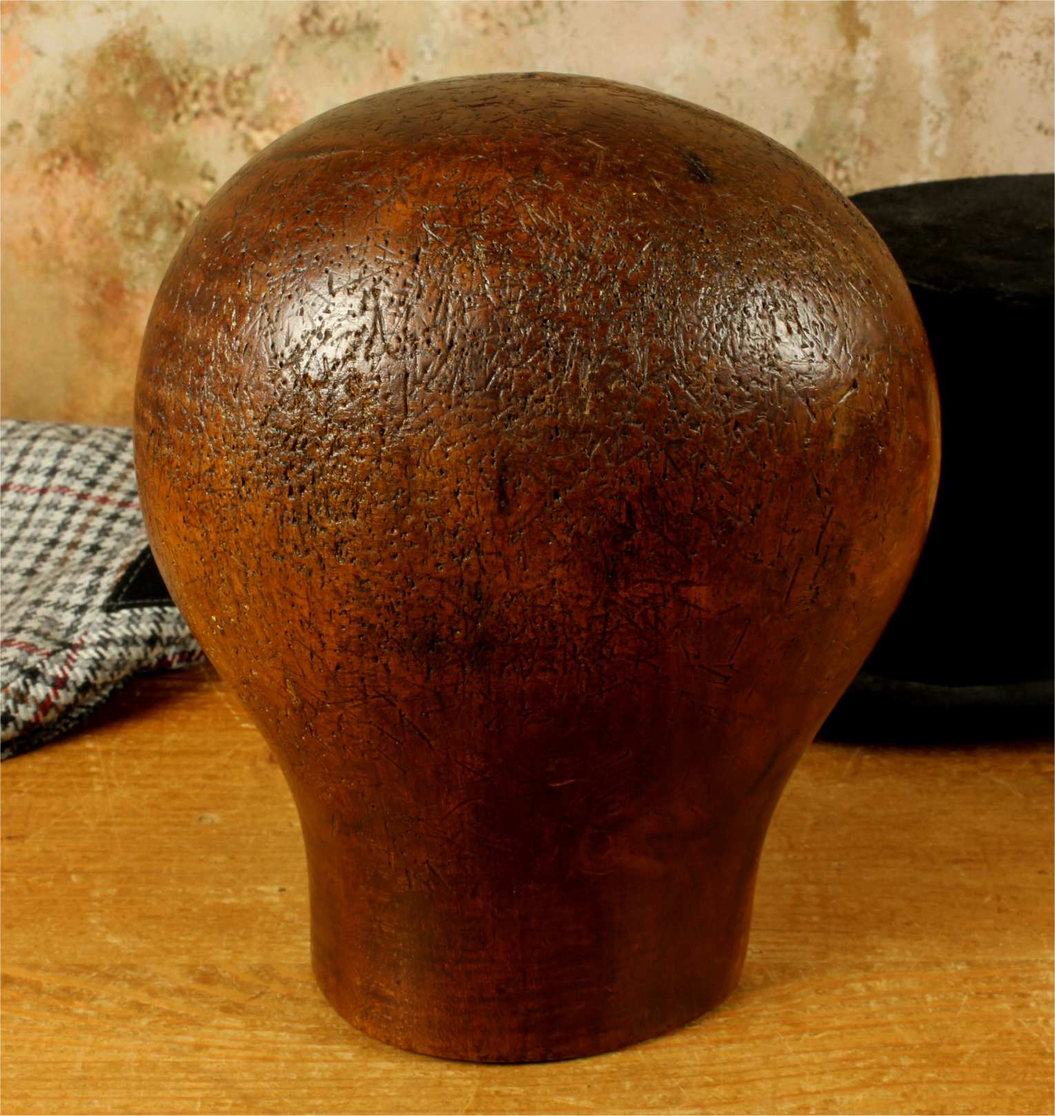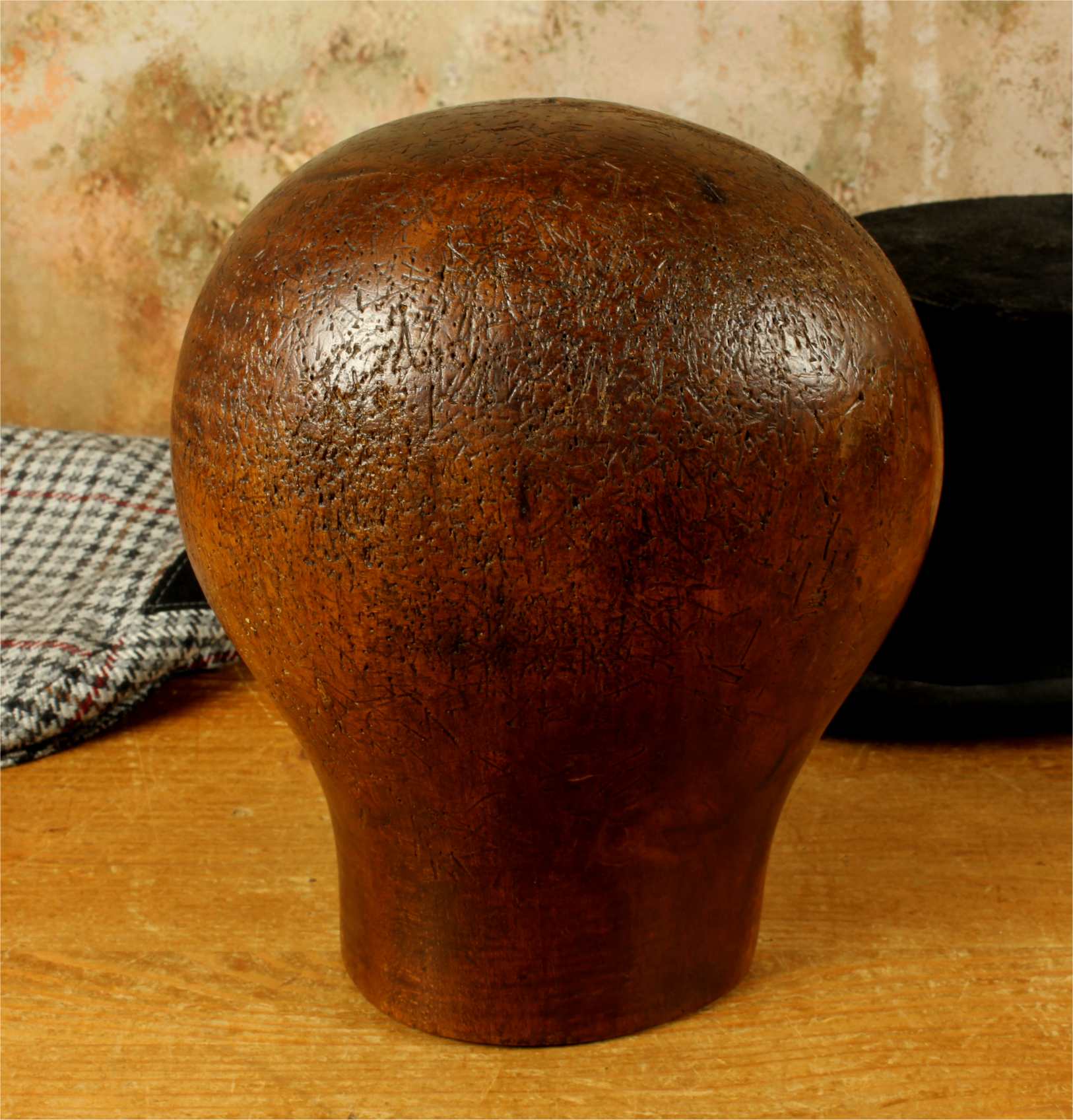 This hat block has accumulated lots of pin holes and wear over the years leaving a wonderful look and would be ideal for displaying hats, wigs and other headwear.