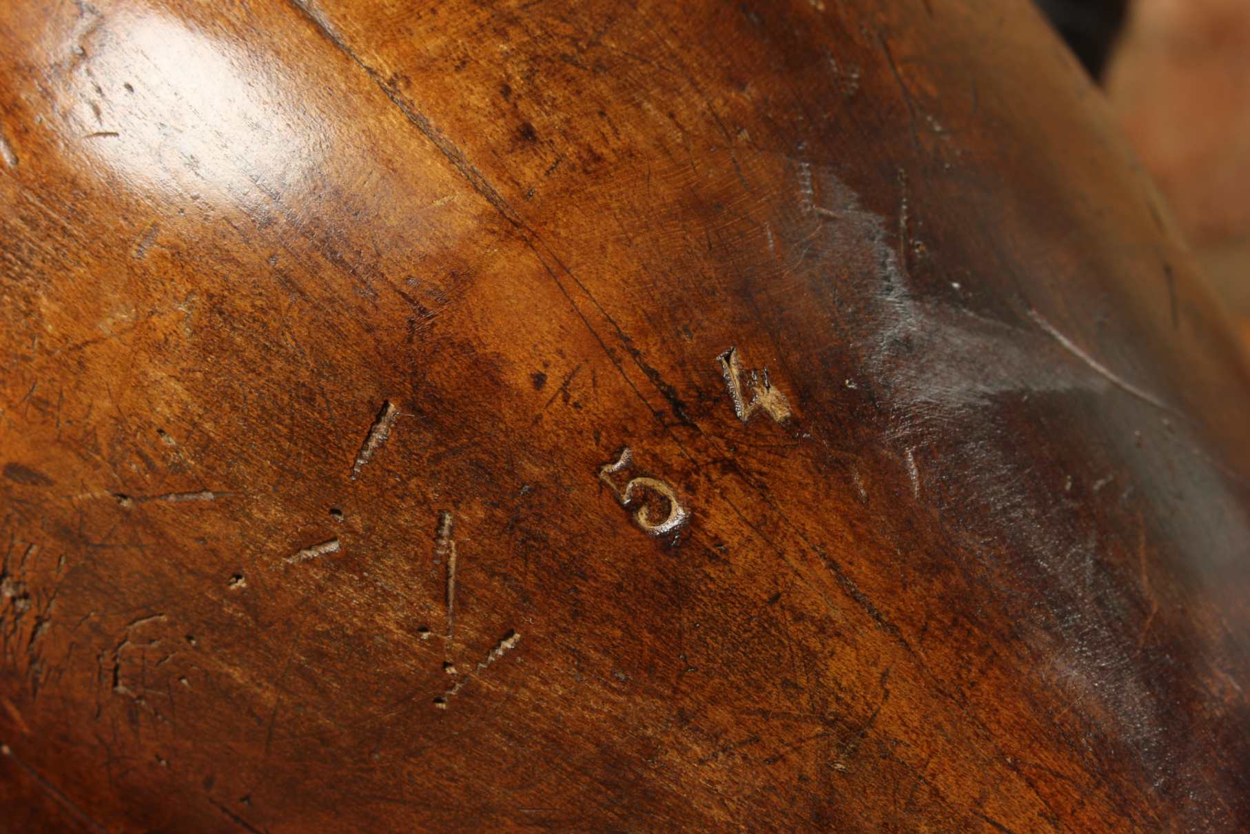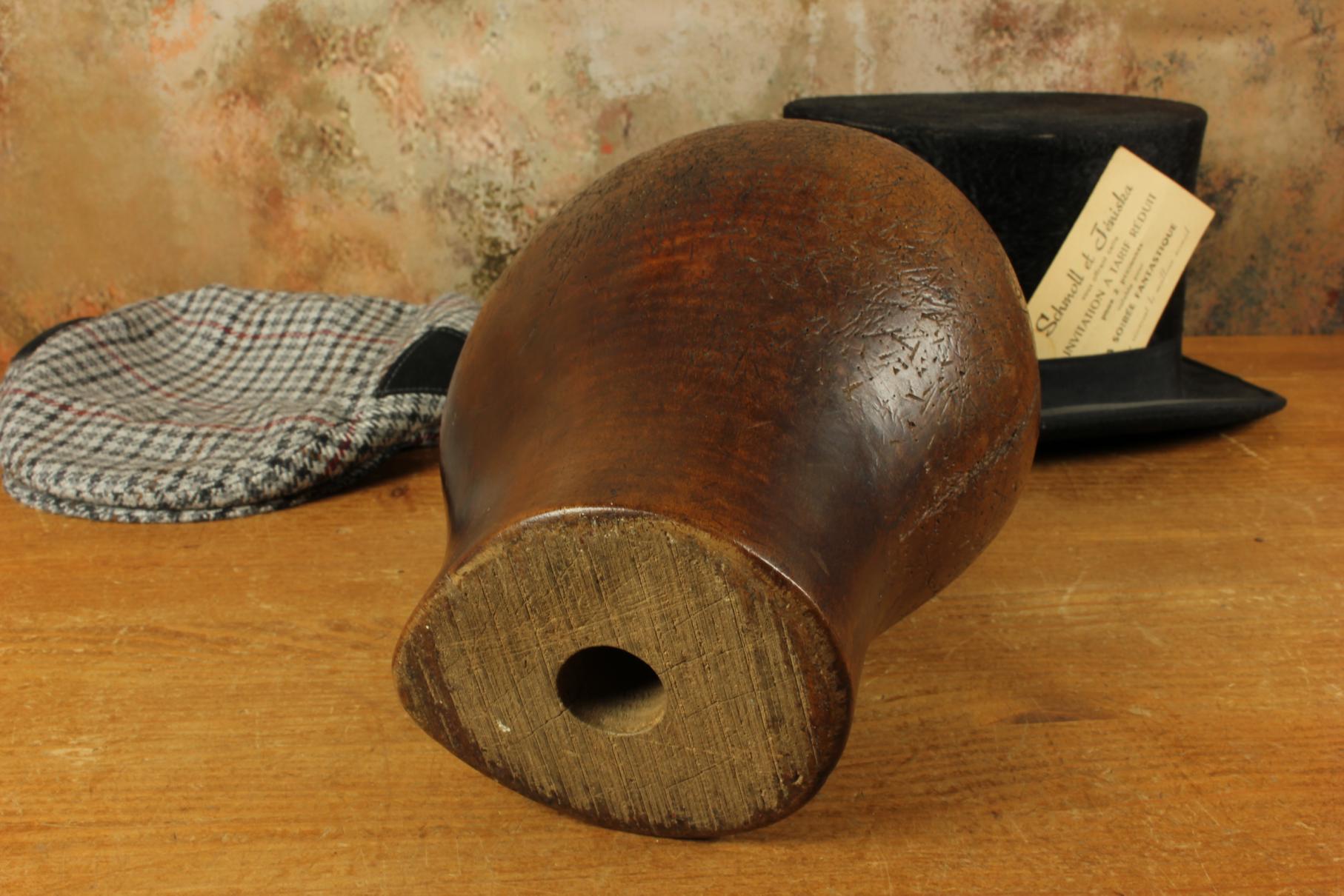 This stunning antique head shaped wooden hat block which originates from France dates from the late 19th century, is embossed to the front with the number 54 and has a beautiful dark brown patina.