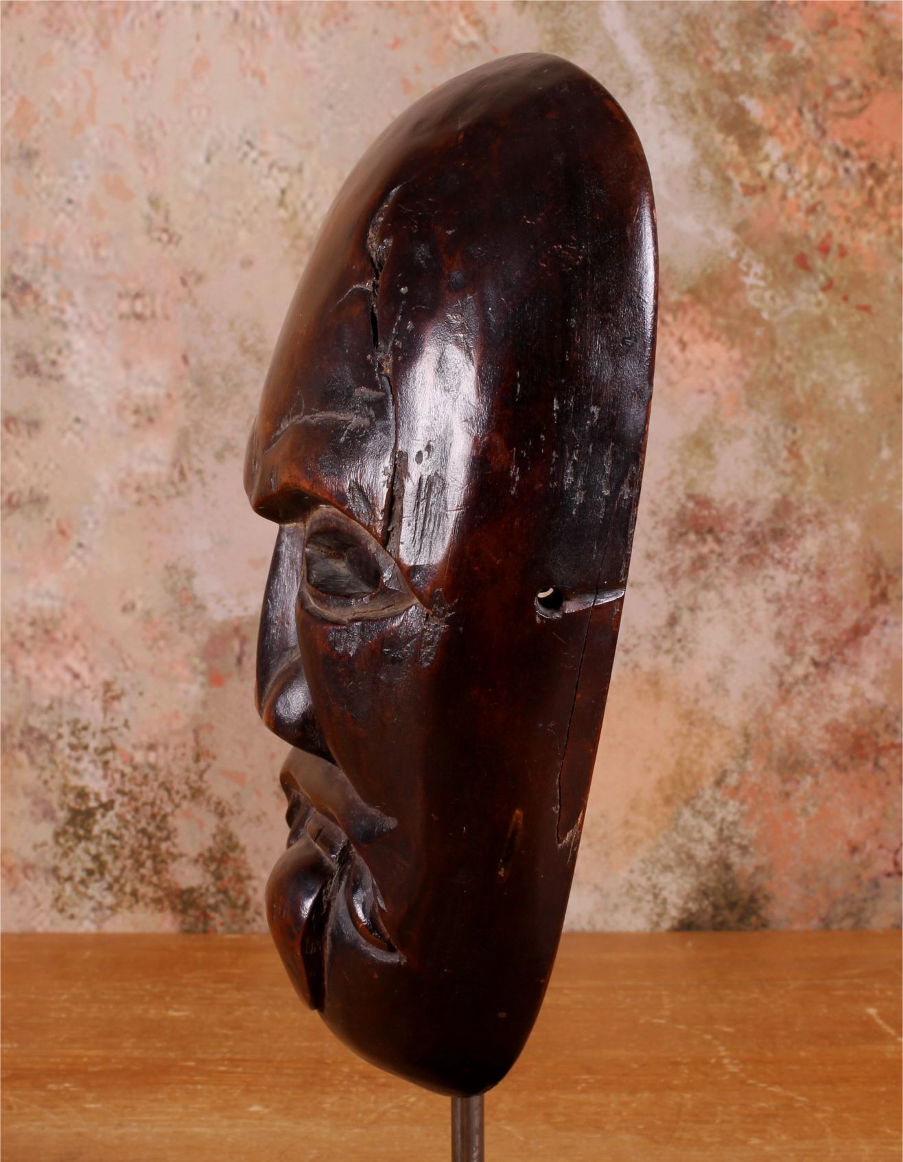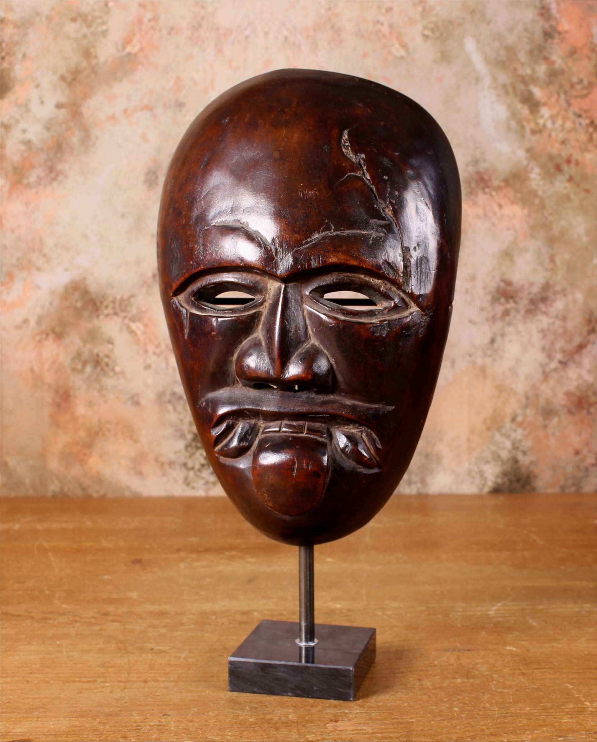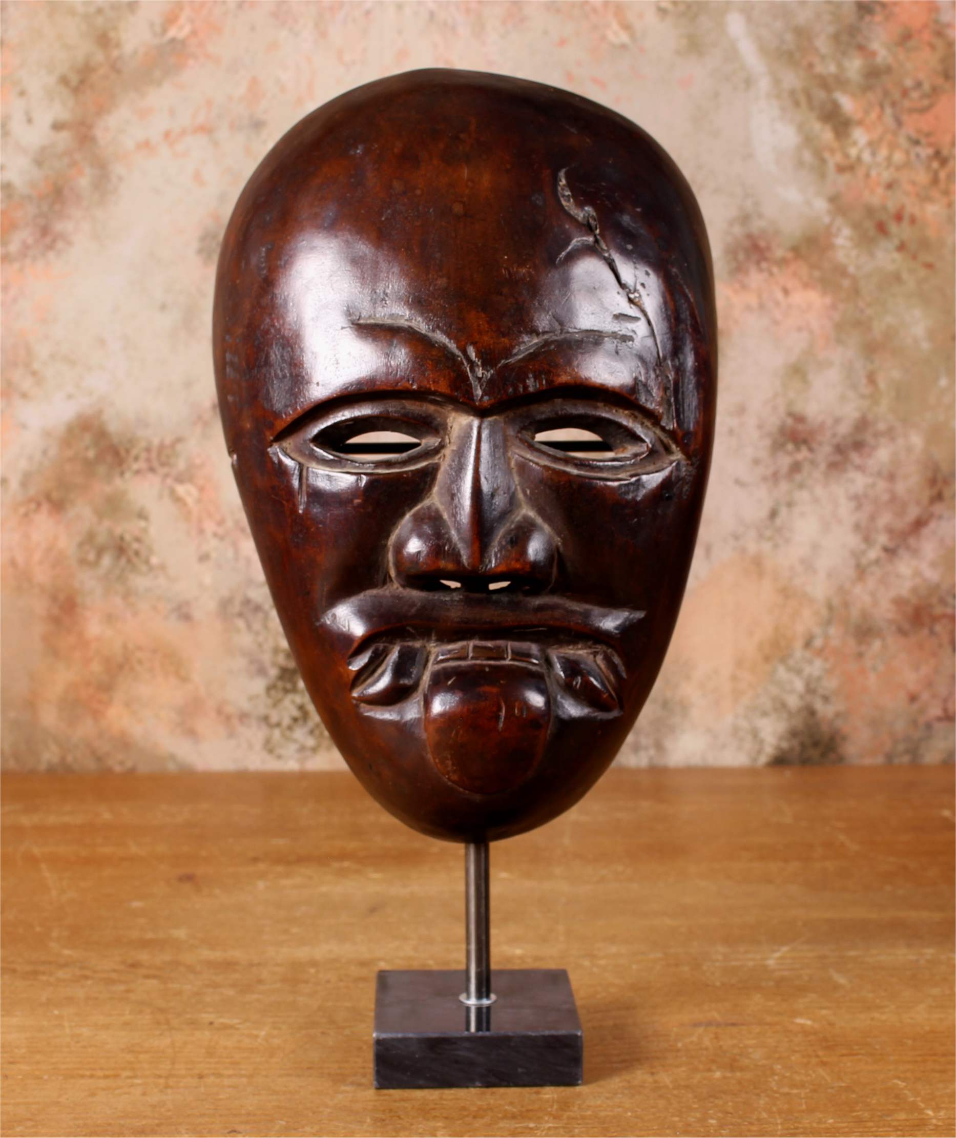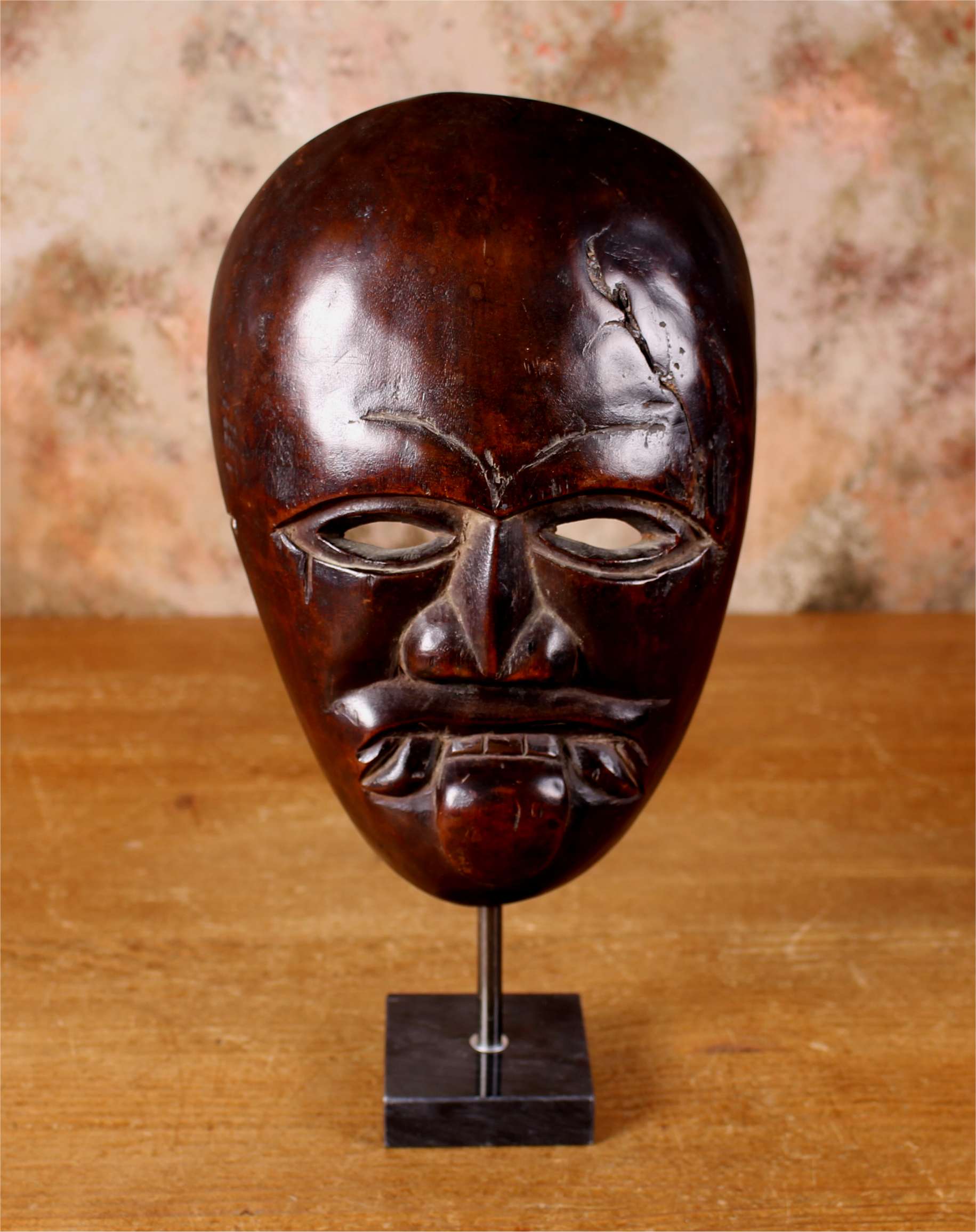 This mask which has a beautiful dark patina looks wonderful on the later metal and marble display stand.