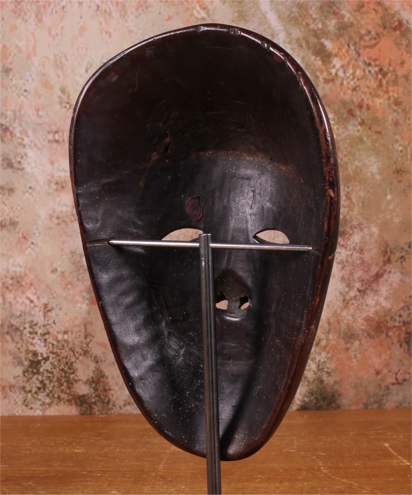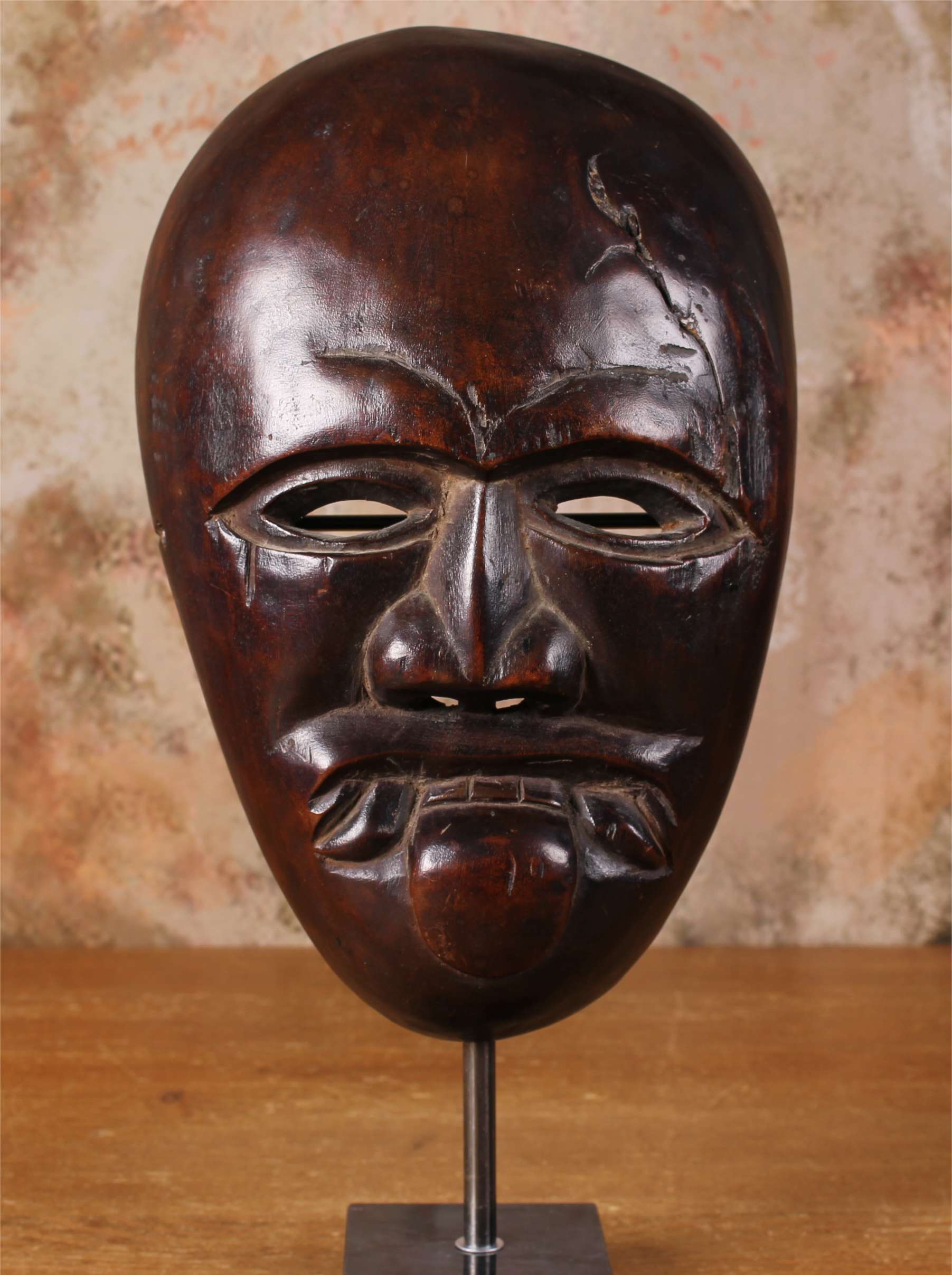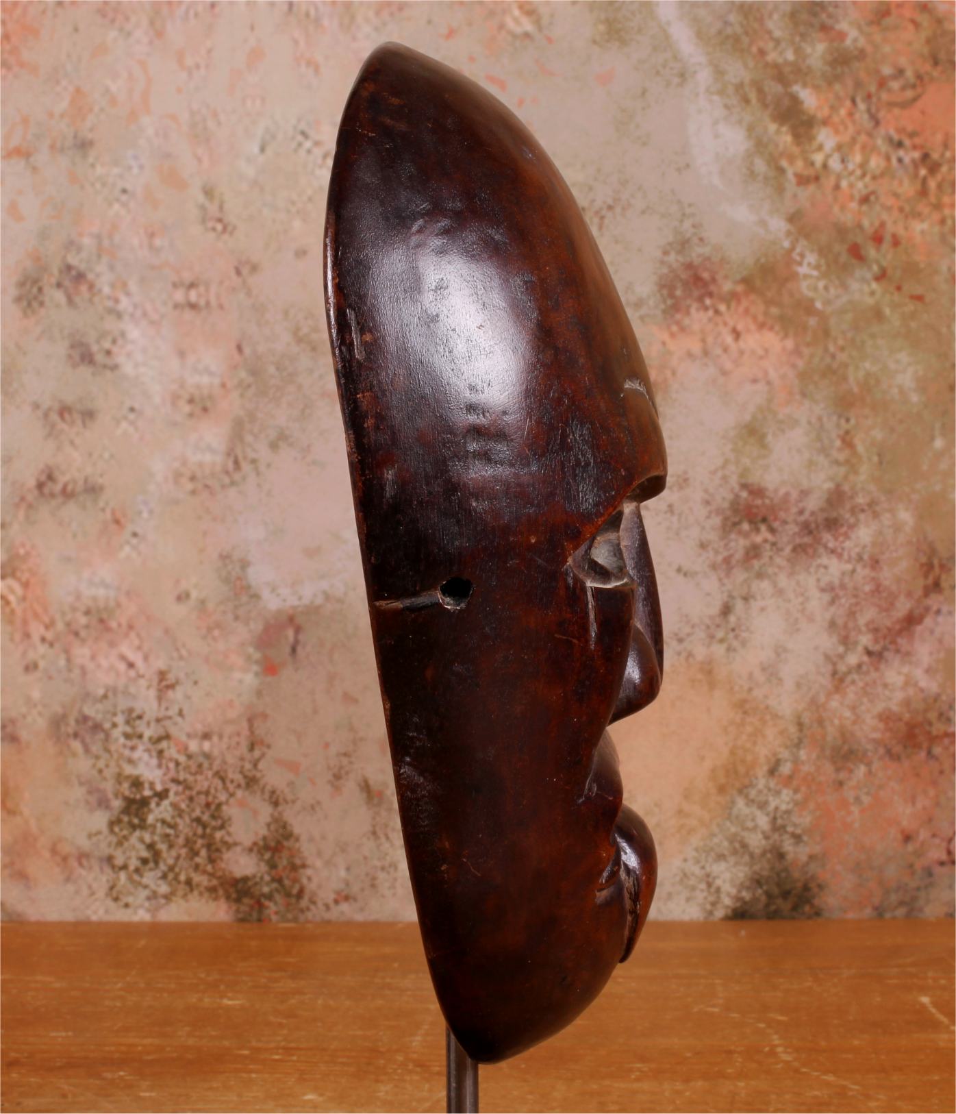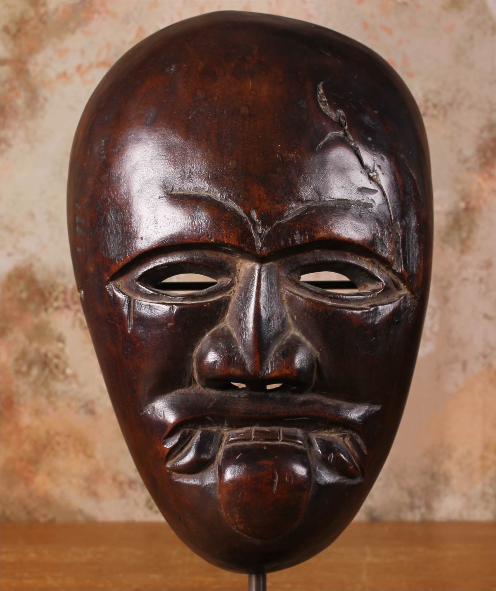 This mask which has a beautiful dark patina looks wonderful on the later metal and marble display stand.