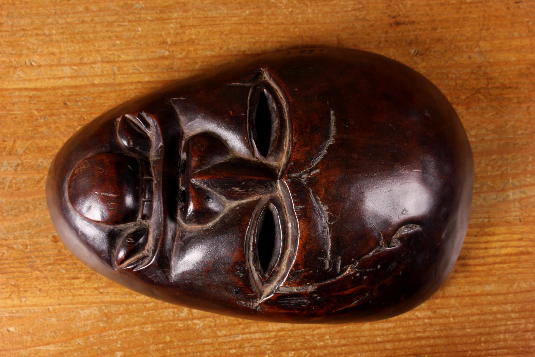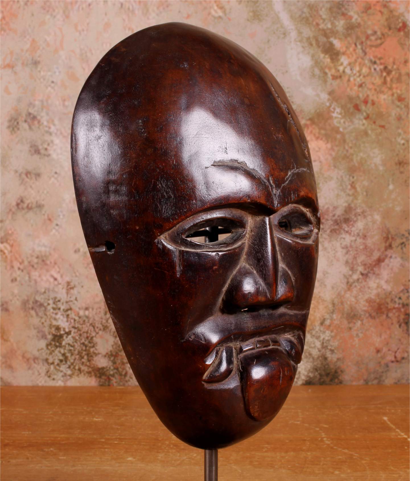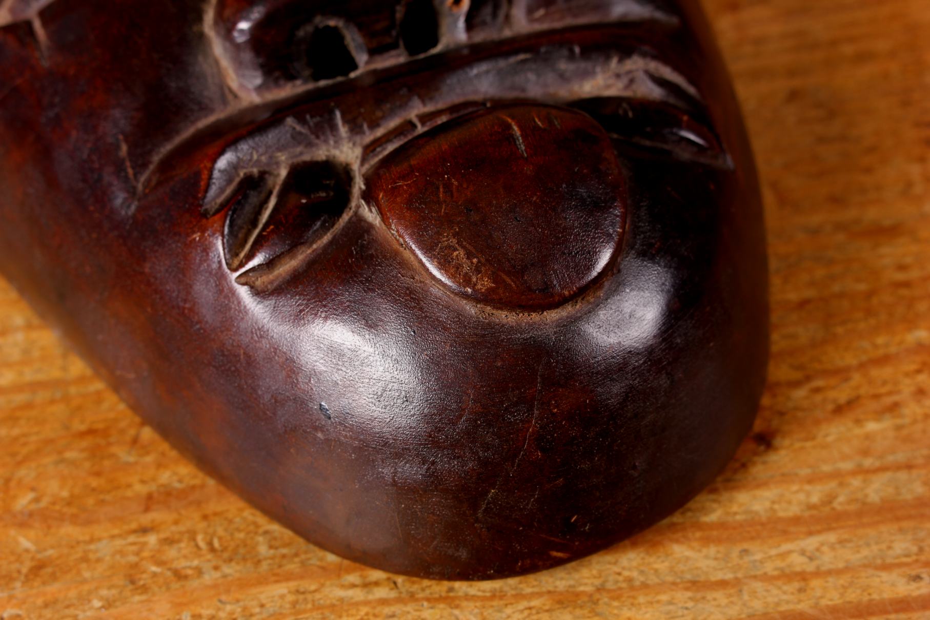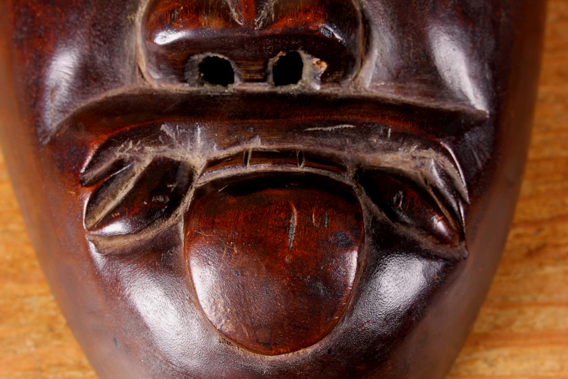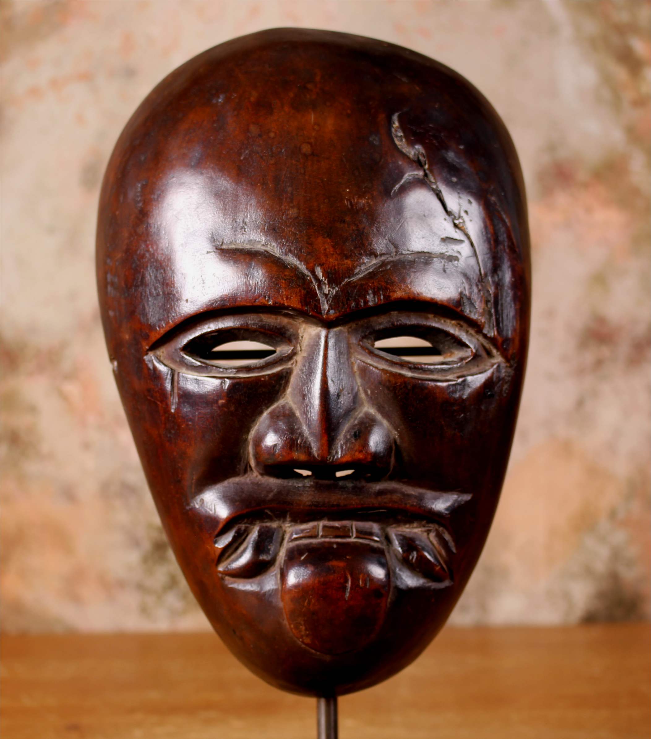 This antique demon mask is nicely hand carved in wood with a prominent tongue and fangs which most likely depicts a protective deity or a local demon/spirit intended to ward off evil.