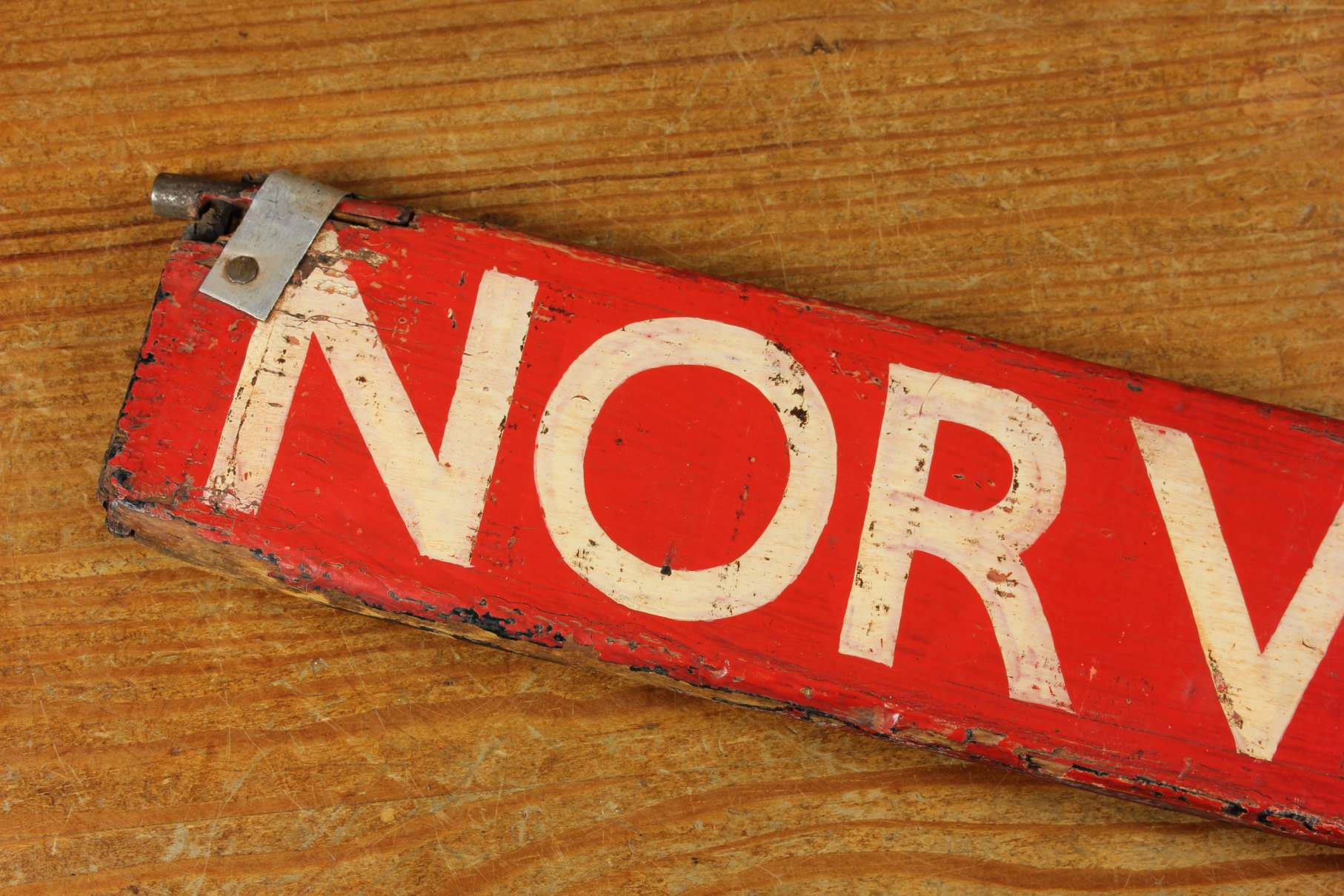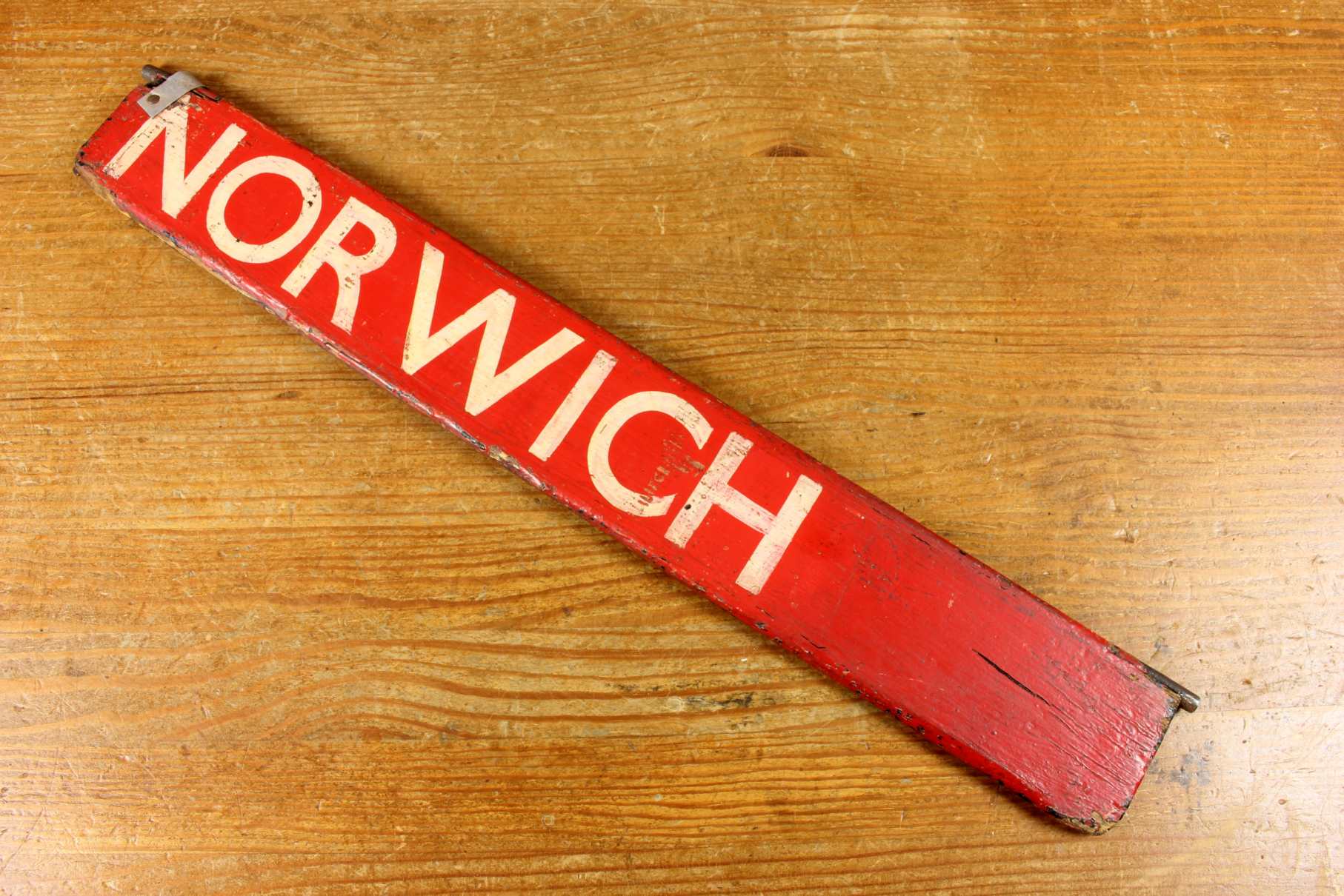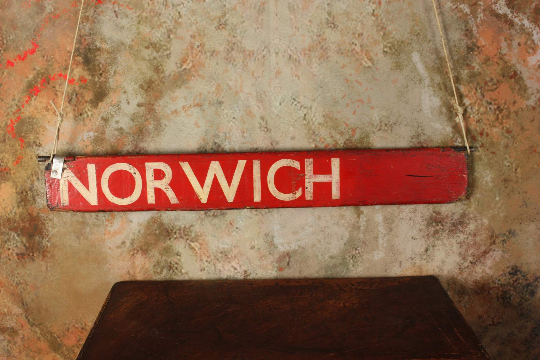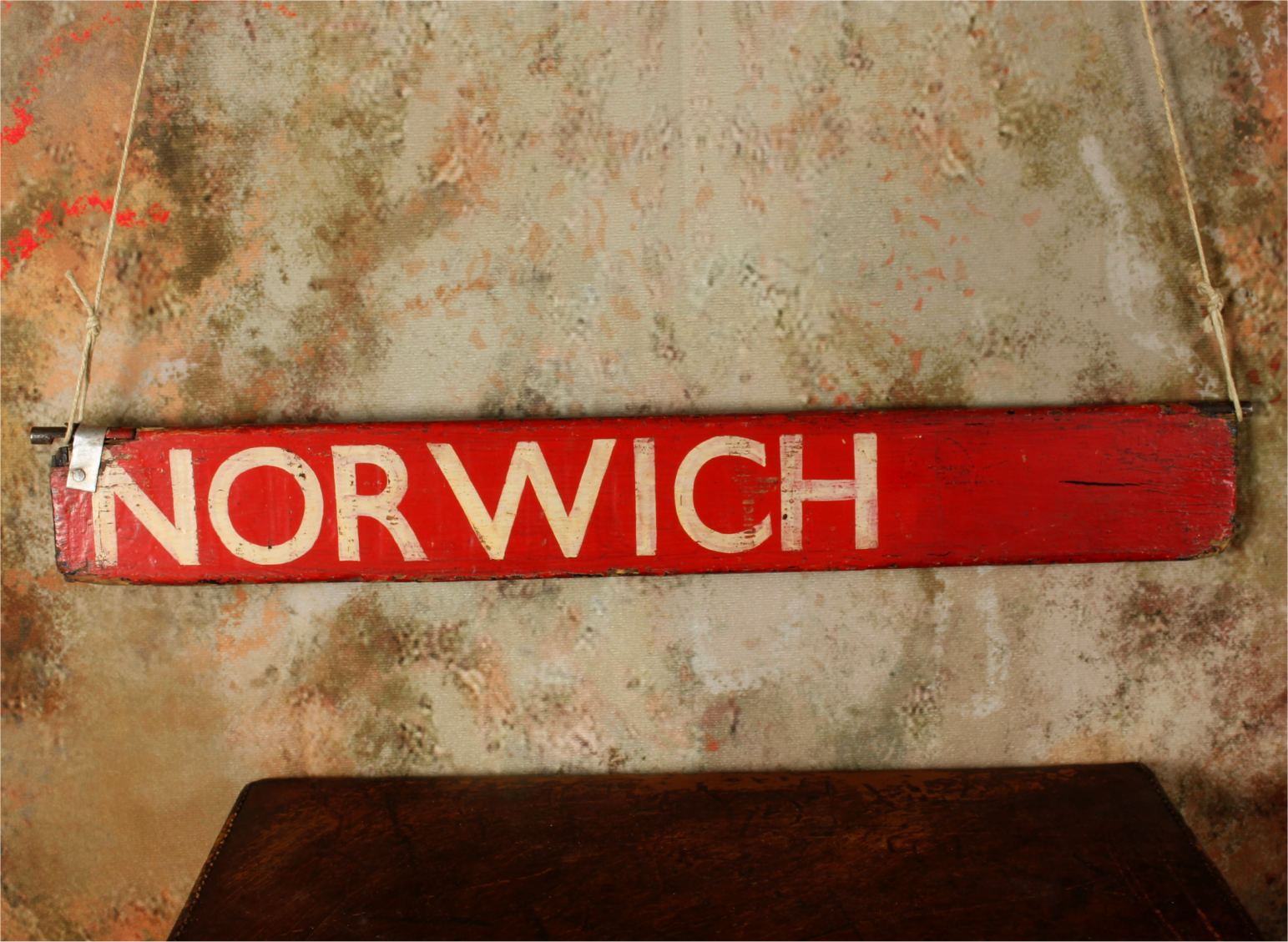 This original c1930 train station destination sign which came from Liverpool Street Station is made of wood and has a red background with the name of the destination station Norwich in hand painted lettering to one side.
