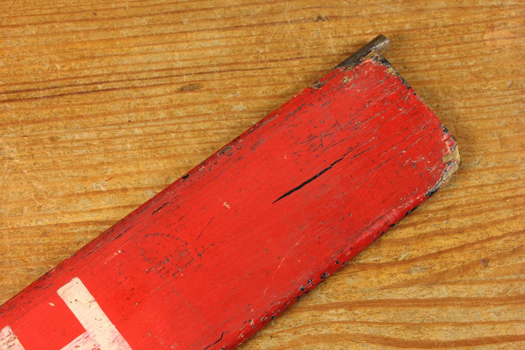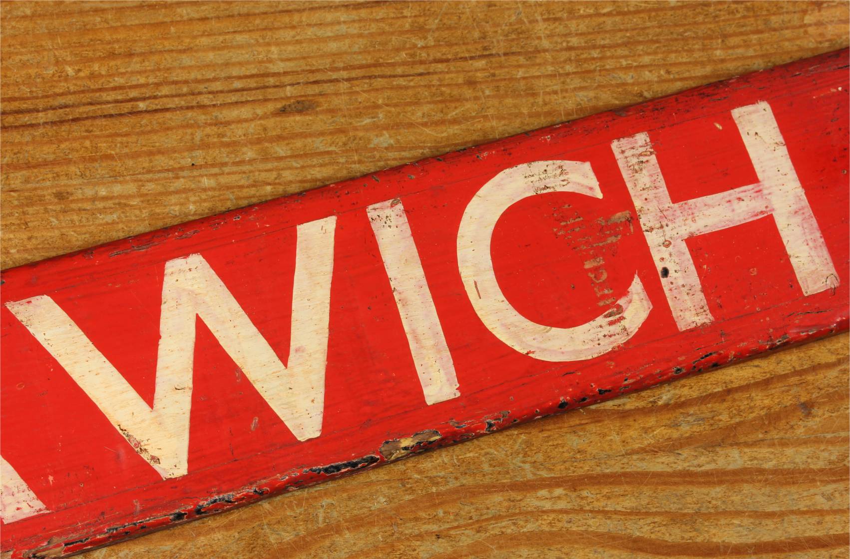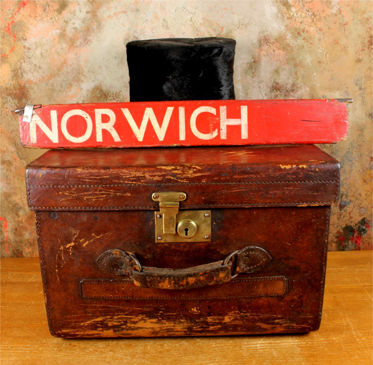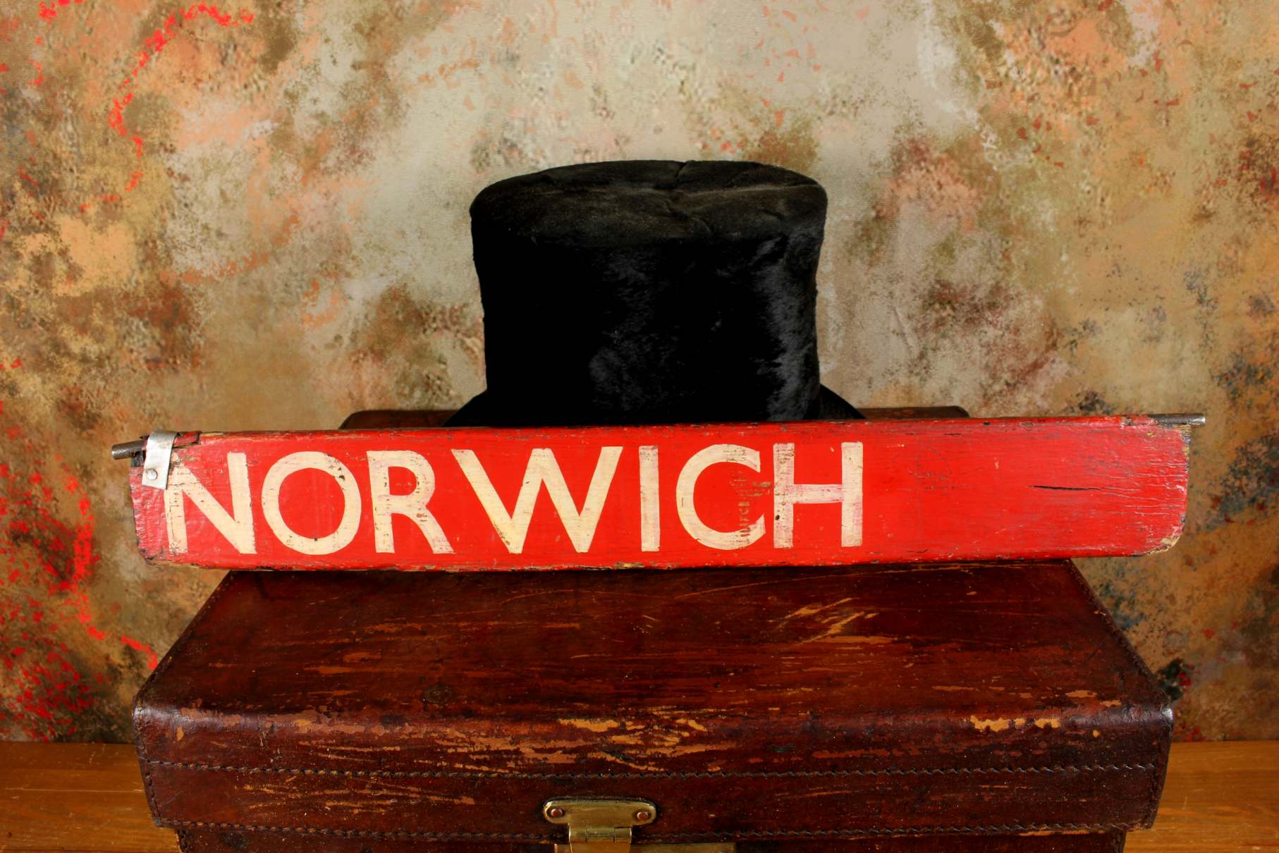 This original c1930 train station destination sign which came from Liverpool Street Station is made of wood and has a red background with the name of the destination station Norwich in hand painted lettering to one side.