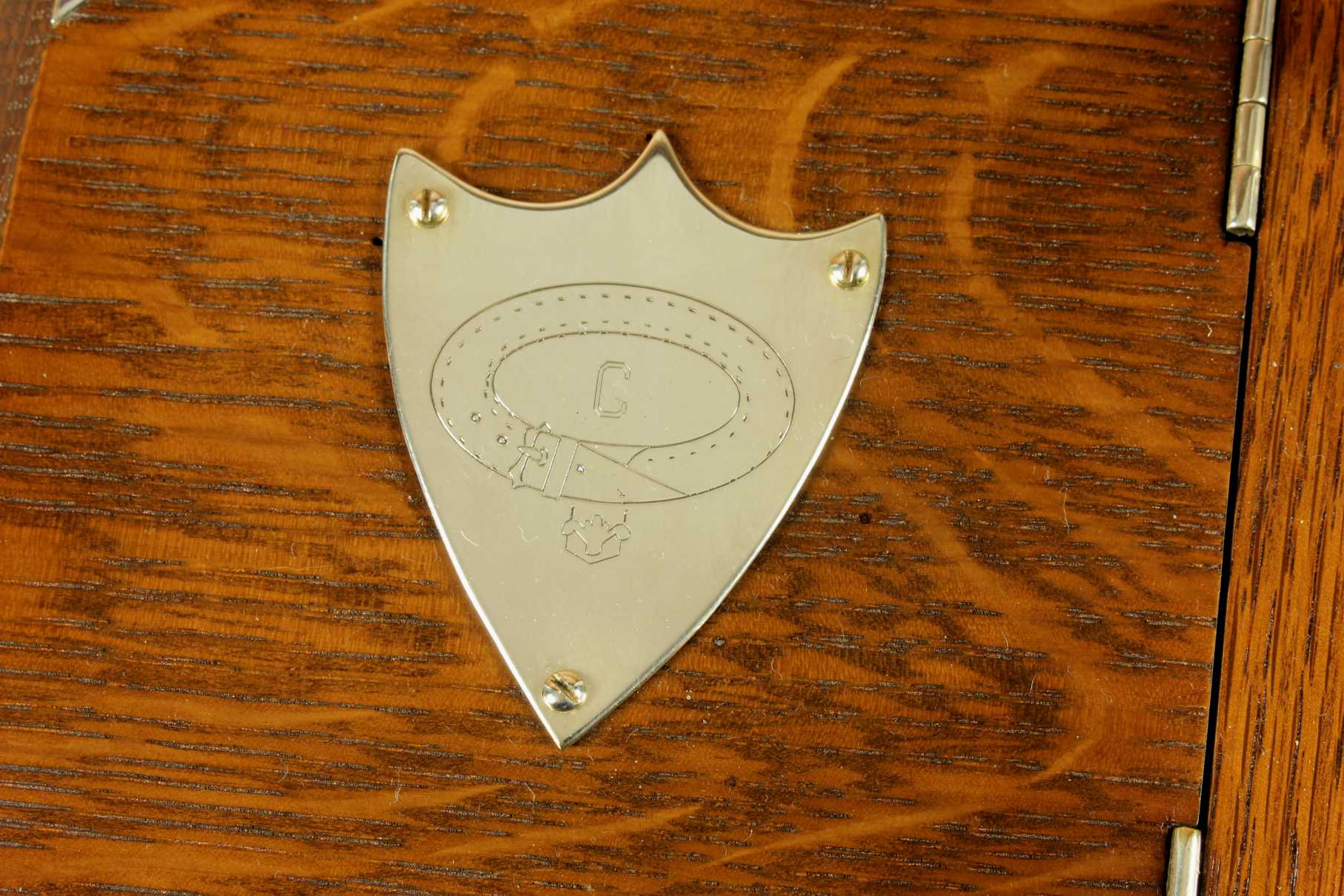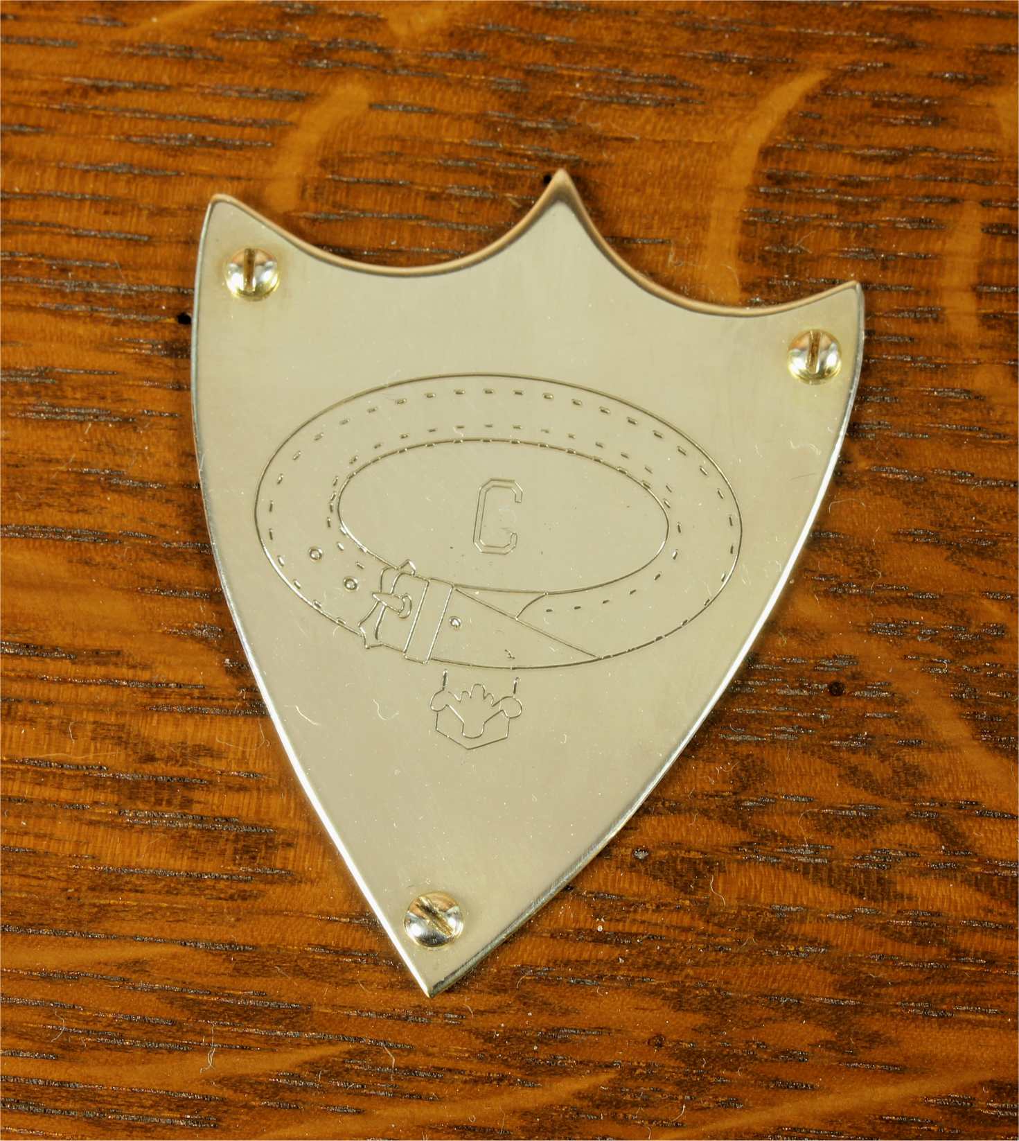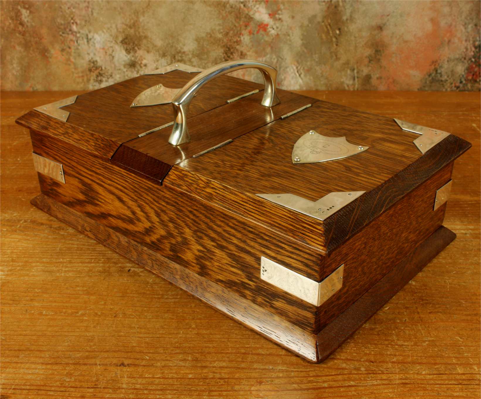 This oak box has hallmarked fittings to the top and edges which date to 1920. The top is also fitted with two silver plate shields which bear a monogrammed crest and the letter C.