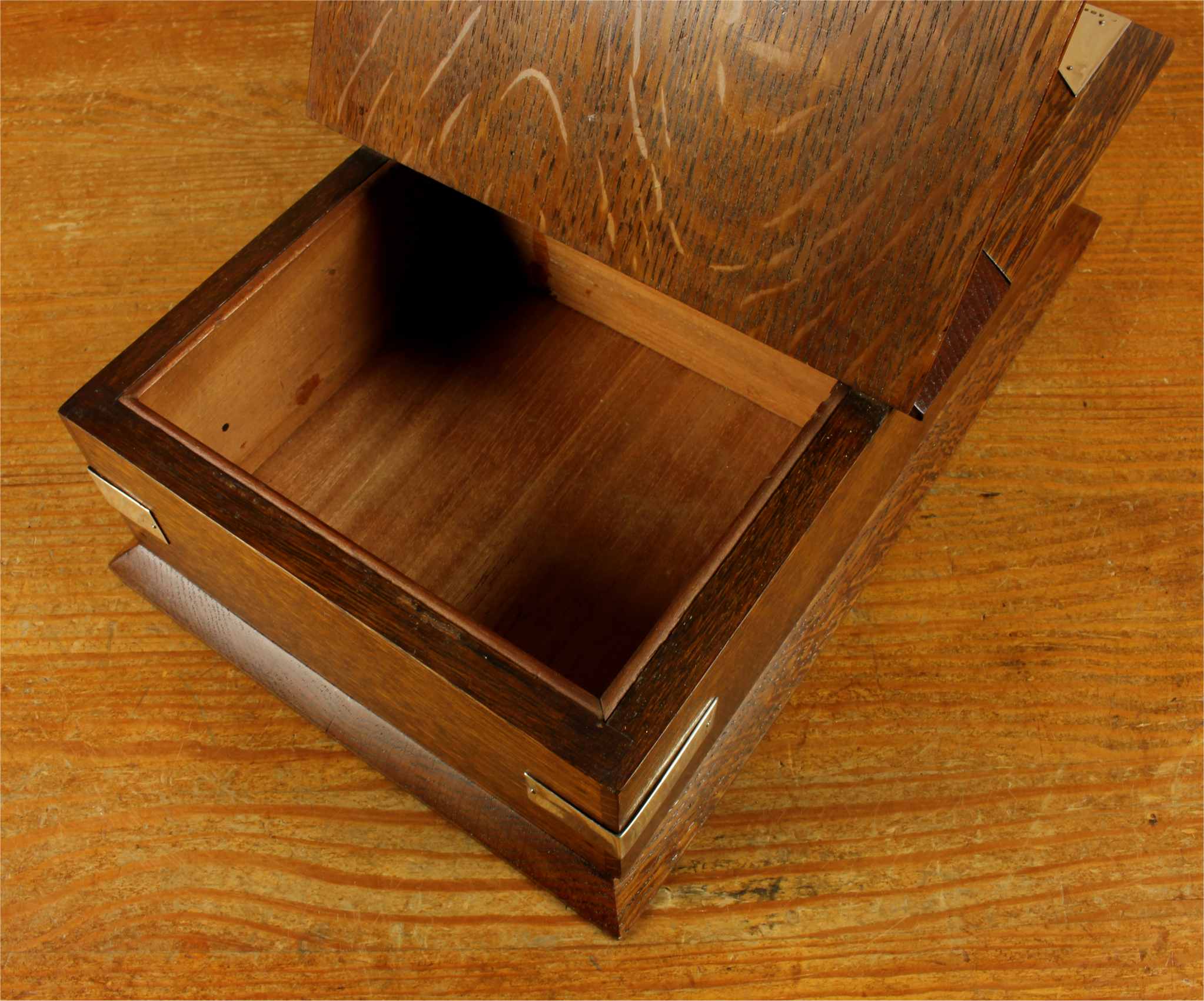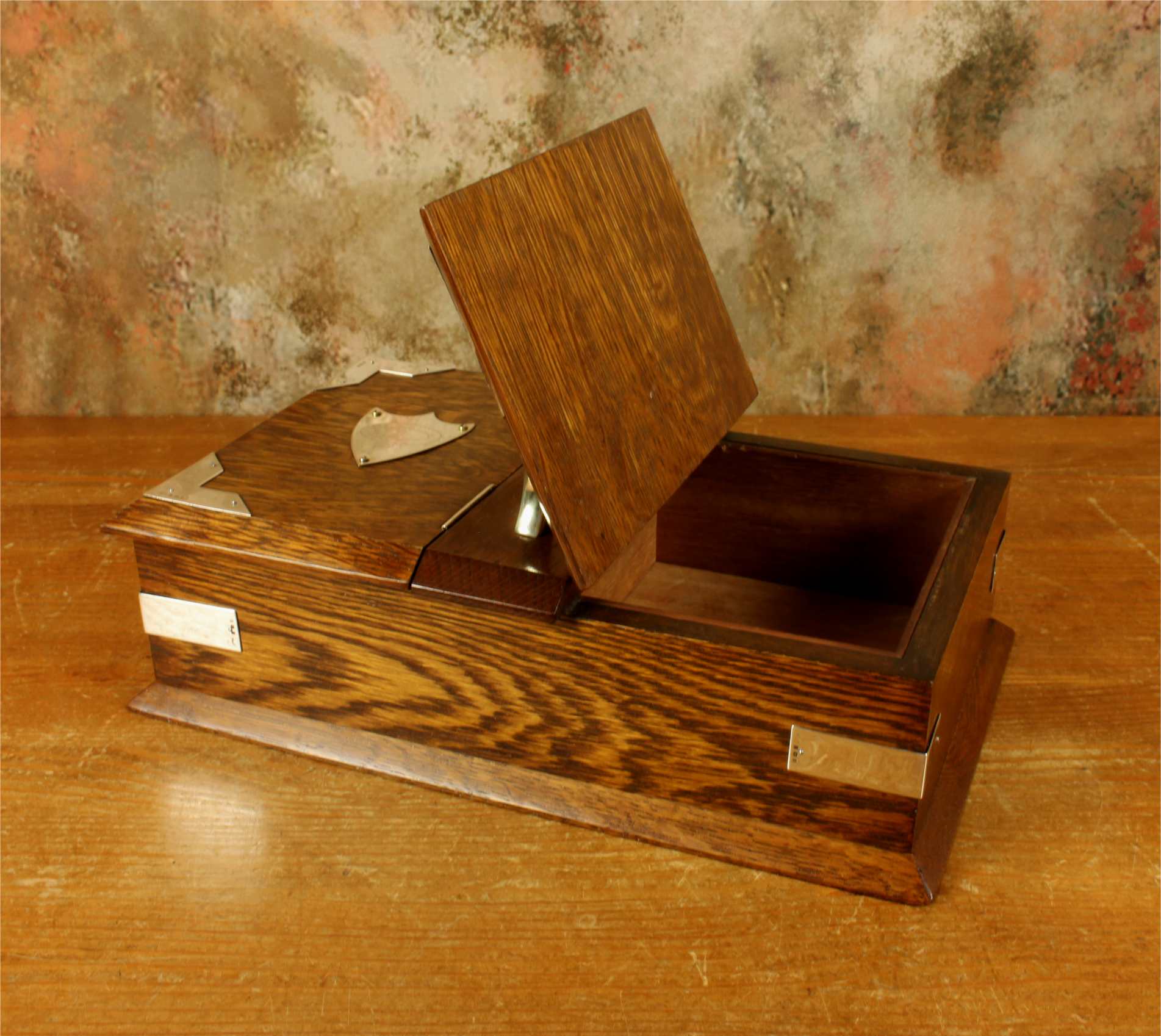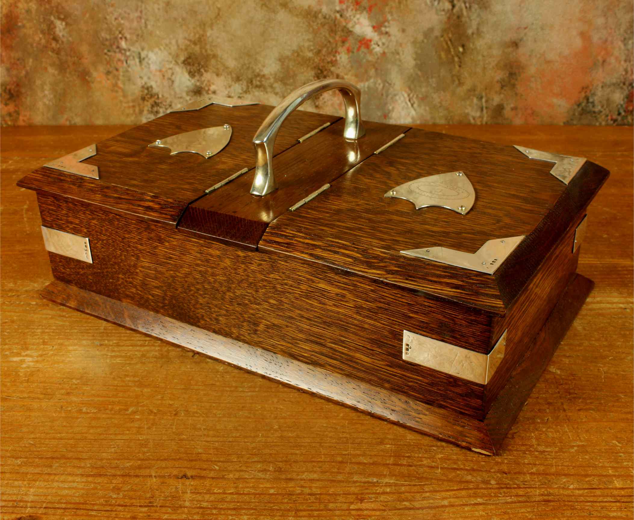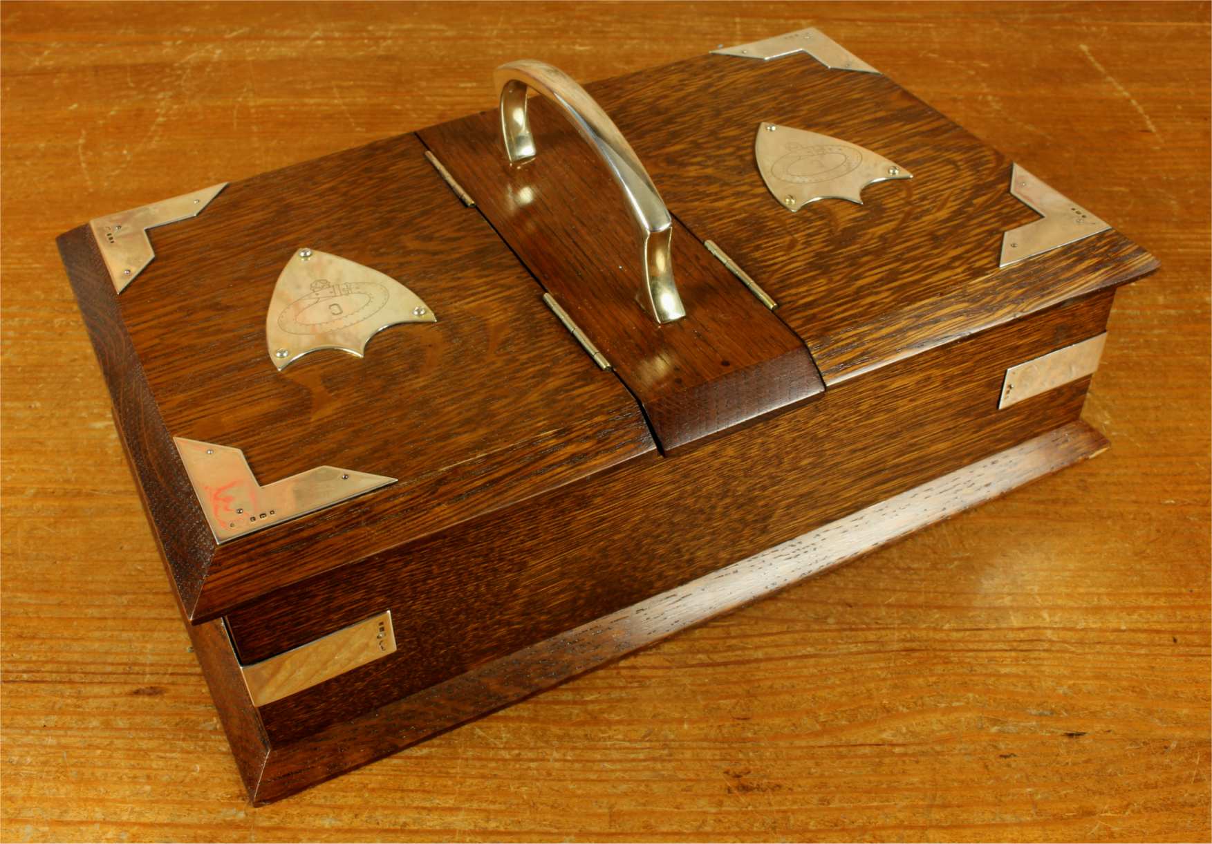 This oak box has hallmarked fittings to the top and edges which date to 1920. The top is also fitted with two silver plate shields which bear a monogrammed crest and the letter C.