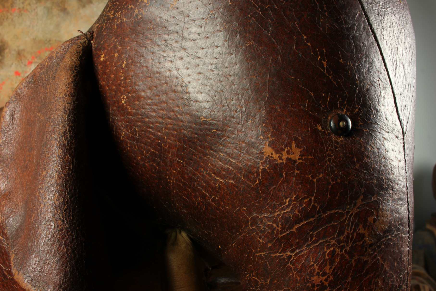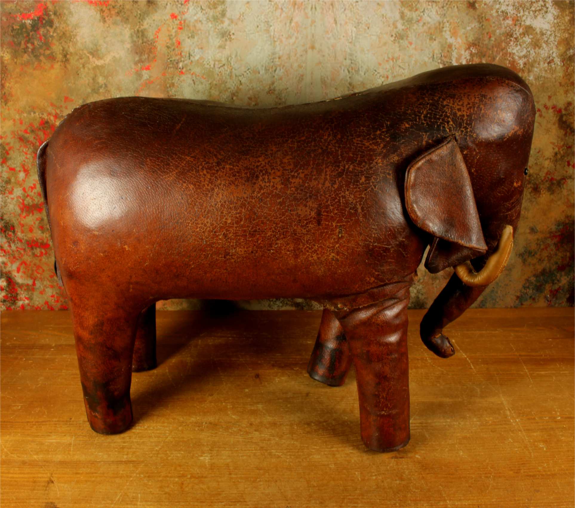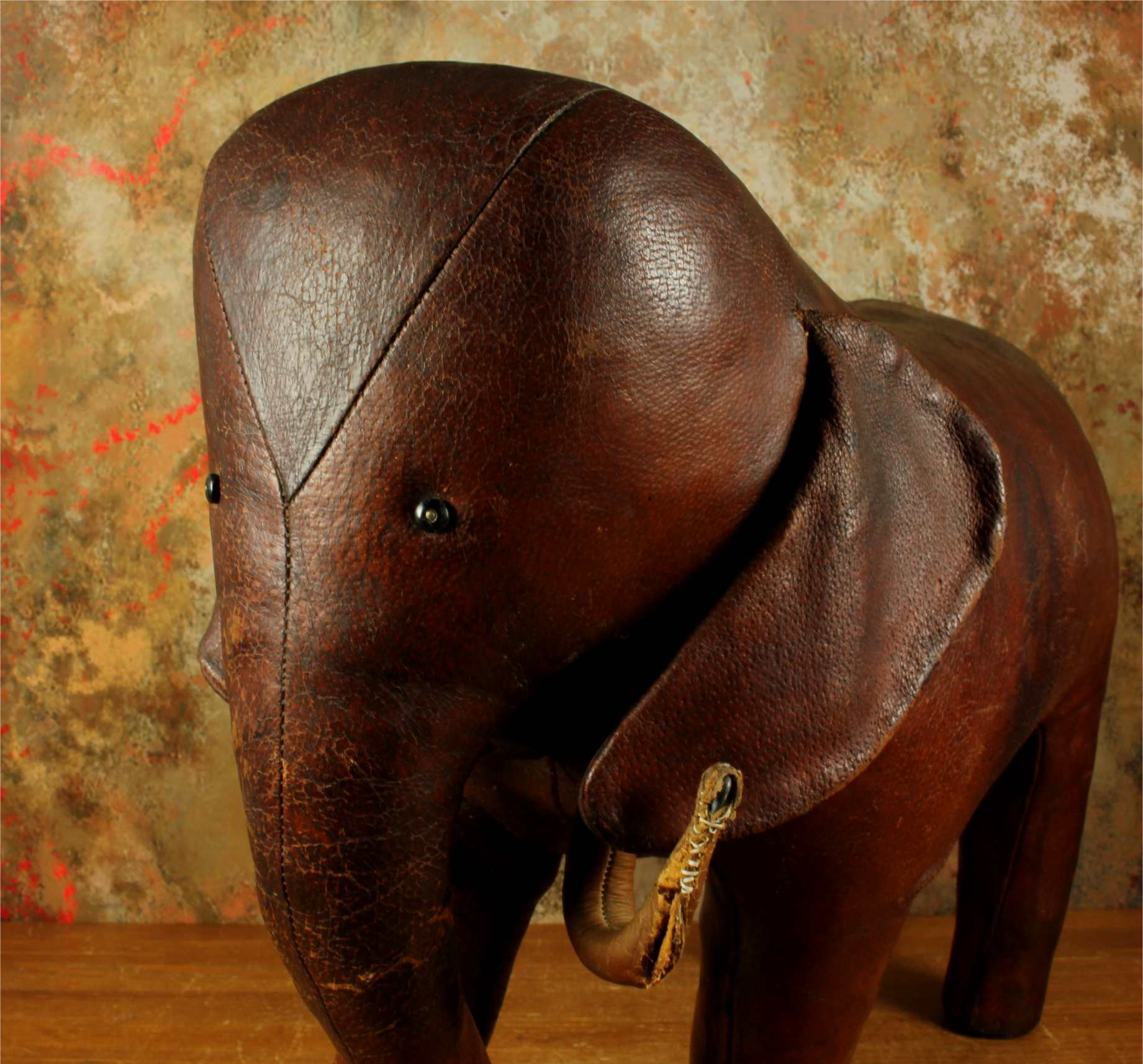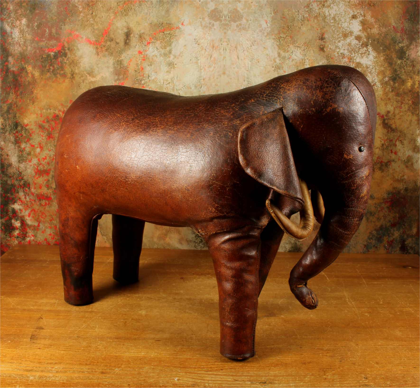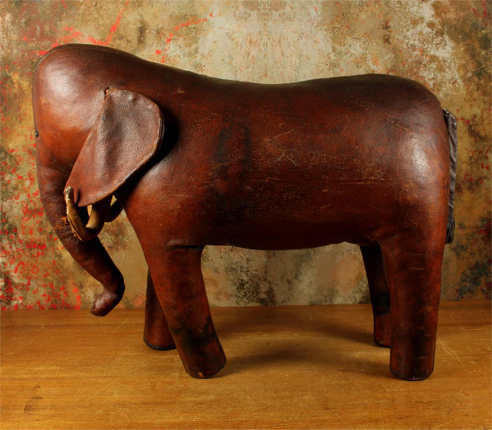 Omersa designed and made leather animals from c1959 and the elephant was the first piece he designed. These were sold exclusively through Liberty of London in the UK and Abercrombie and Fitch in USA.