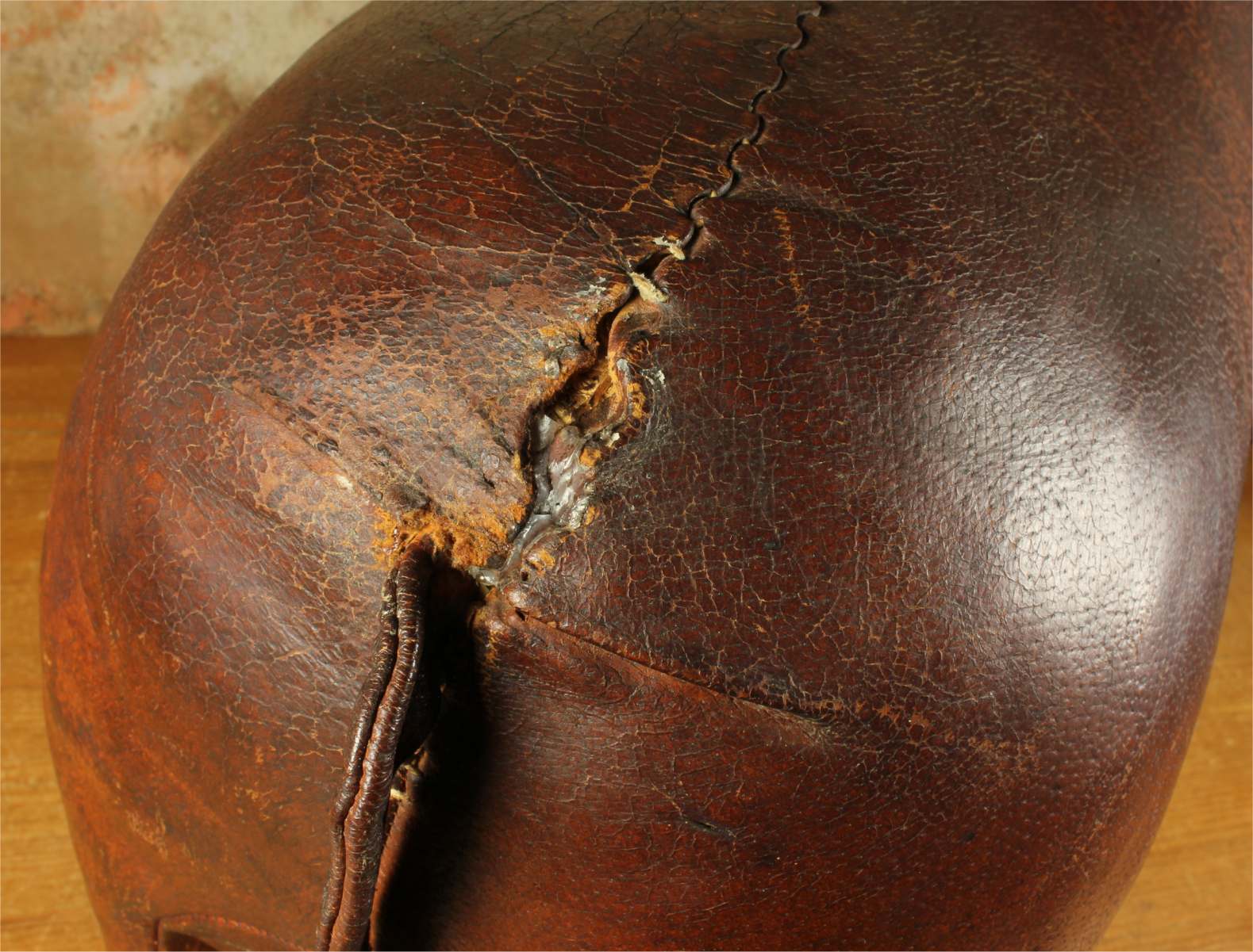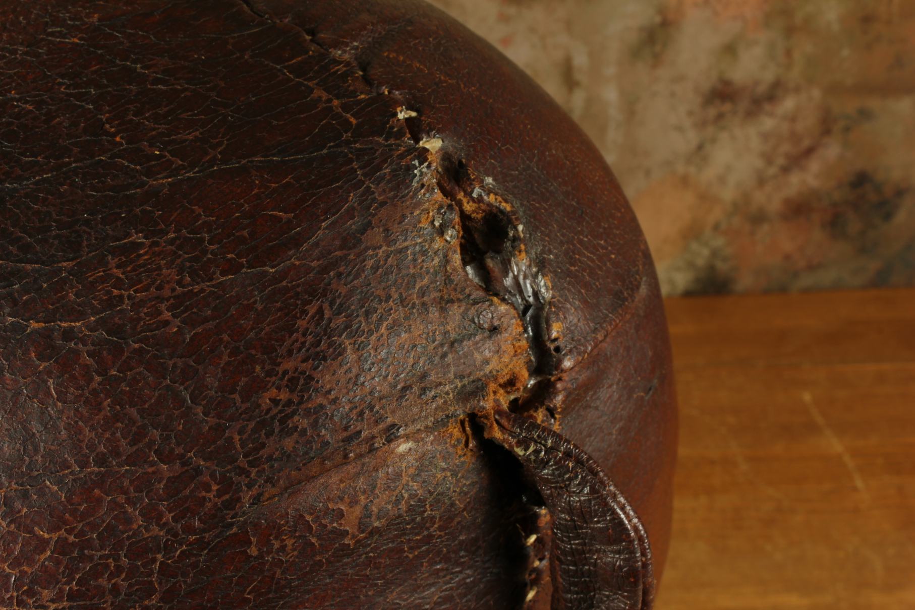 A very nice vintage piece that has is a beautiful dark brown colour with a wonderful patina. There is some damage to the leather and legs but still a lovely decorative piece with great character.