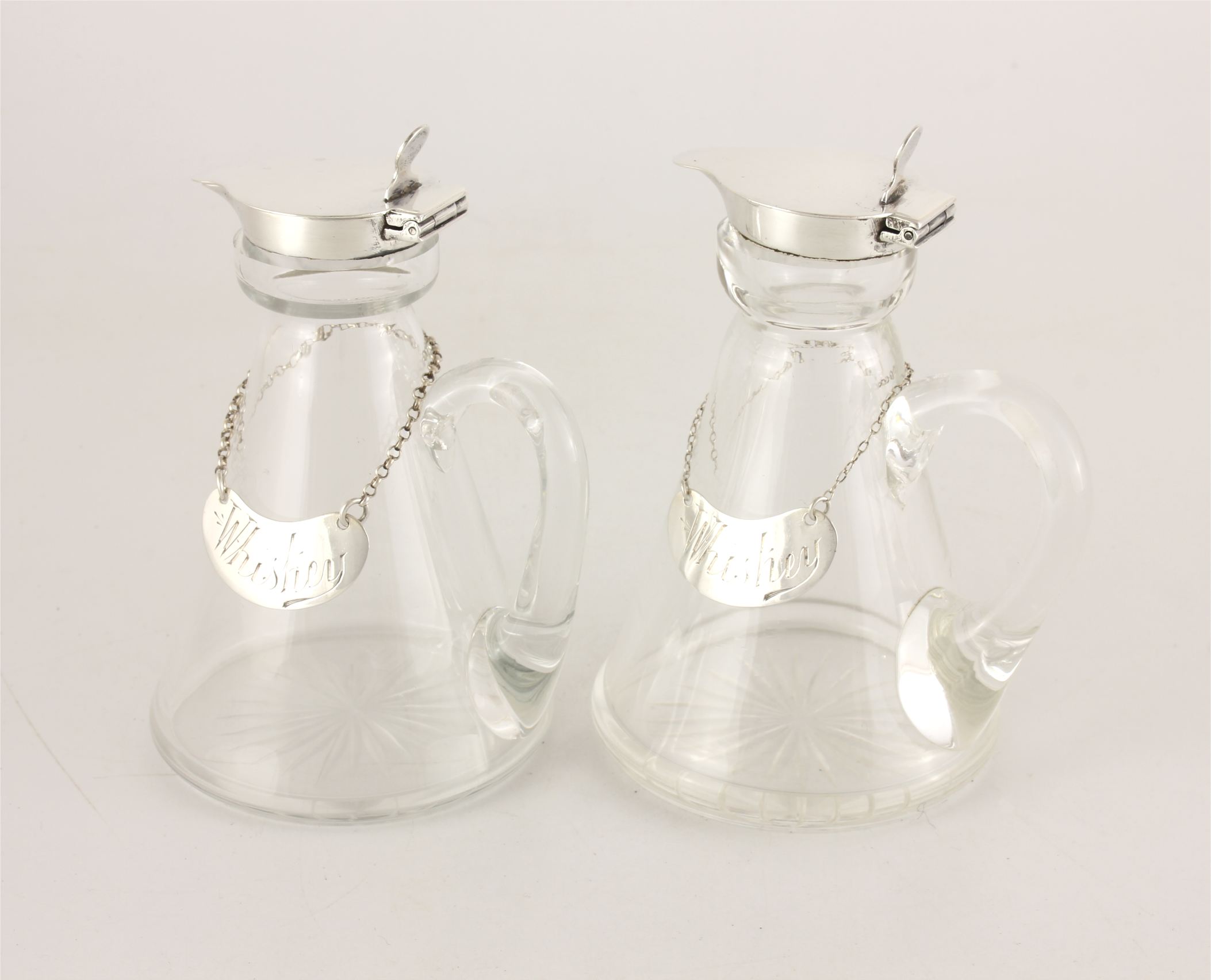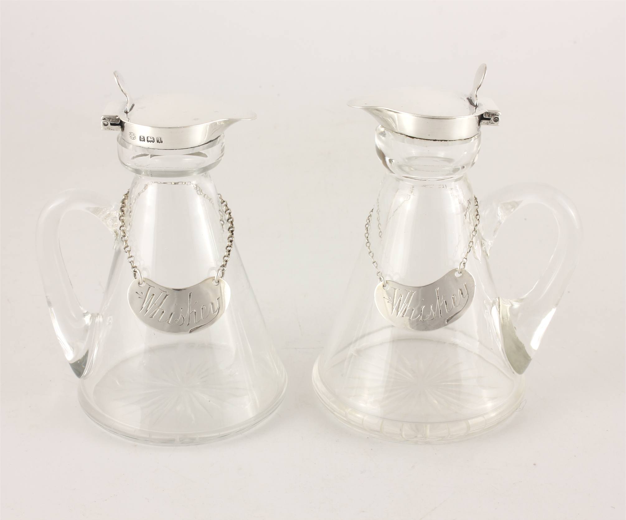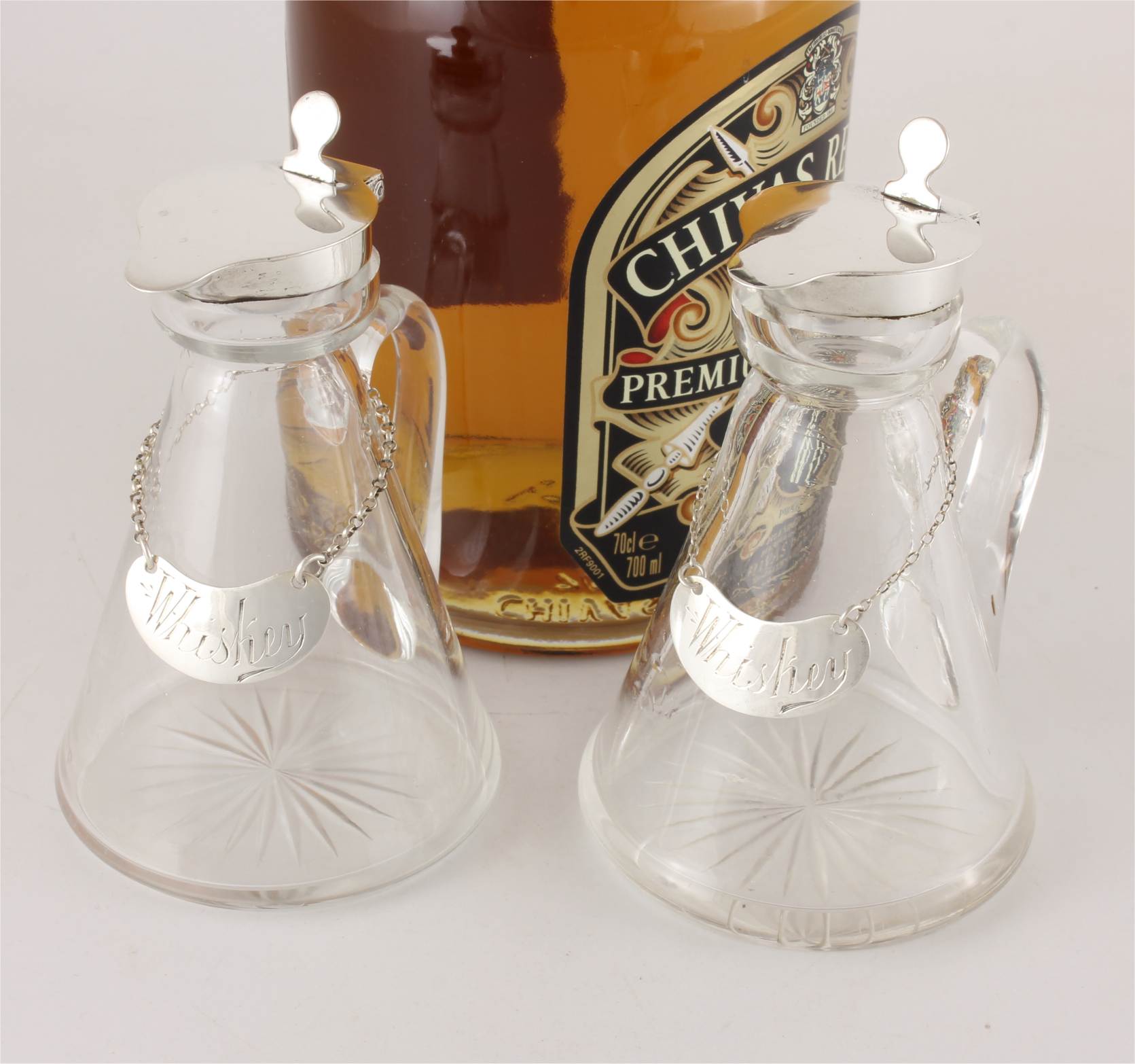 These early 20th century whisky noggins have a glass handle and fully hallmarked silver mounts with a top hinged cover that can be opened with the thumb tab for pouring.