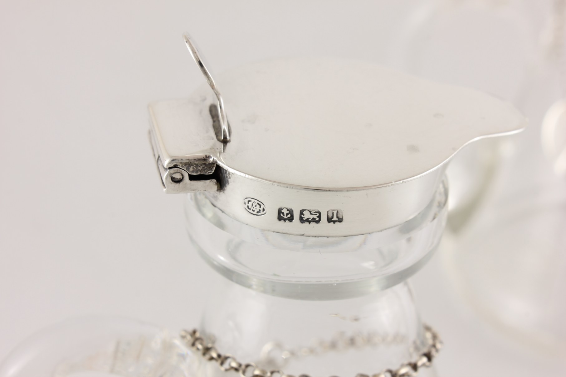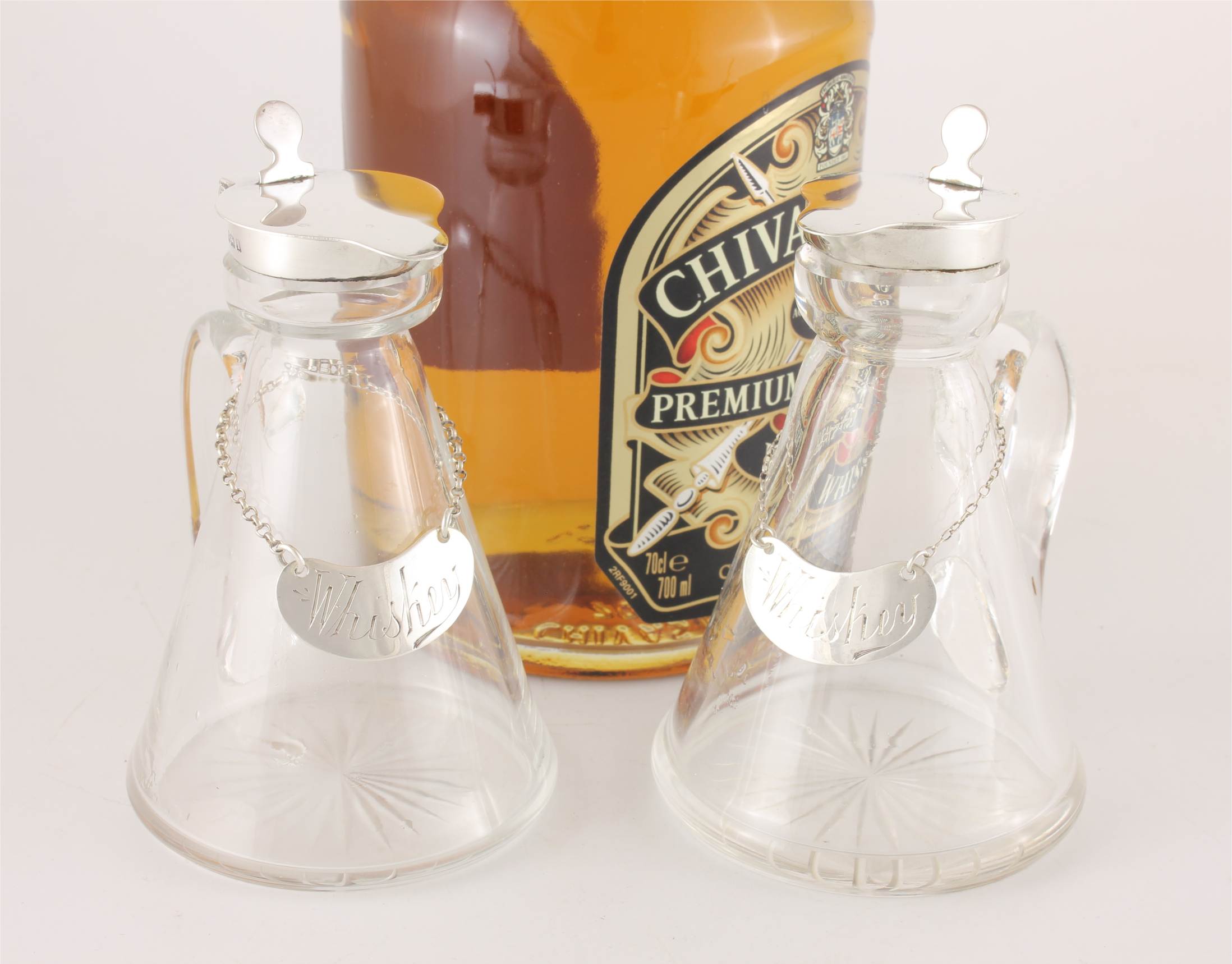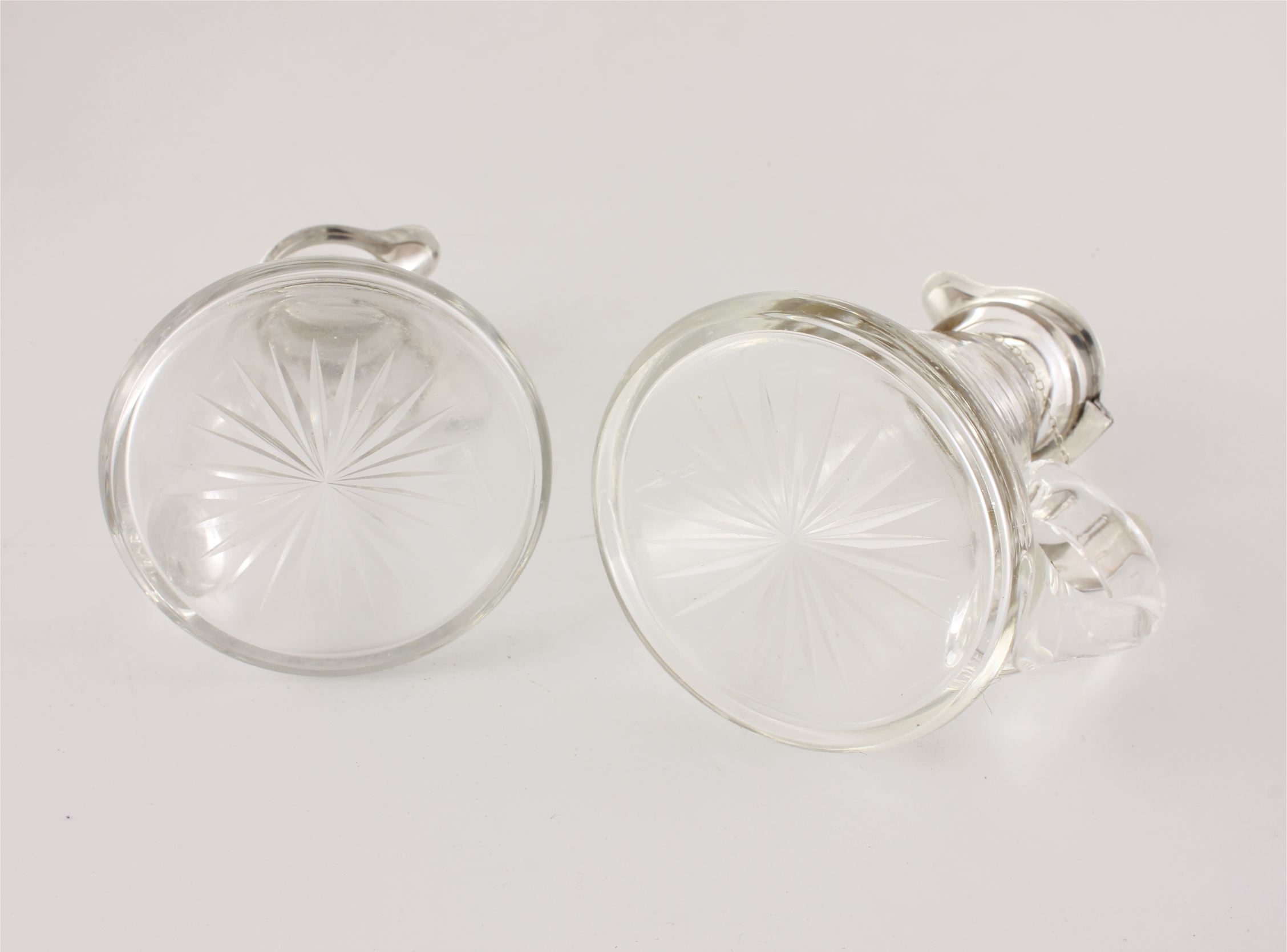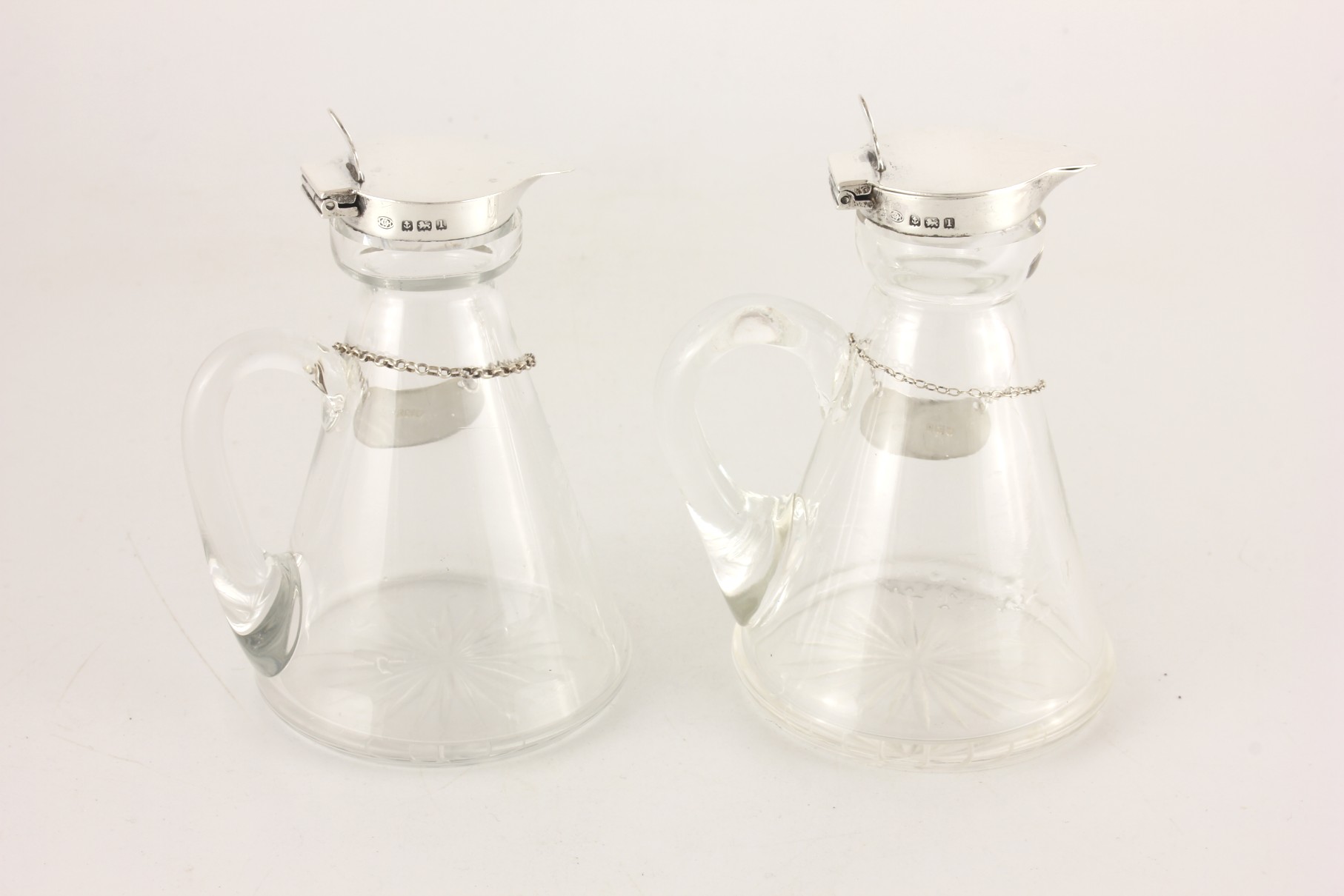 These early 20th century whisky noggins have a glass handle and fully hallmarked silver mounts with a top hinged cover that can be opened with the thumb tab for pouring.