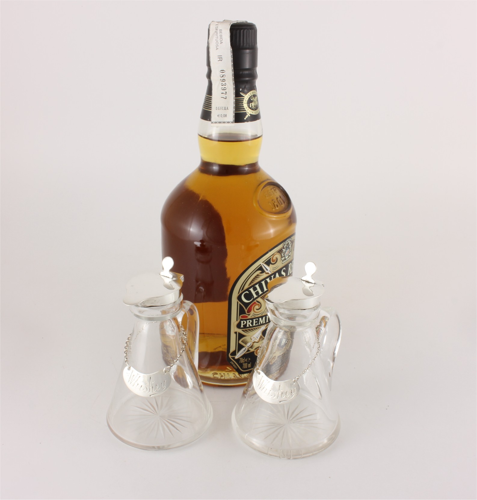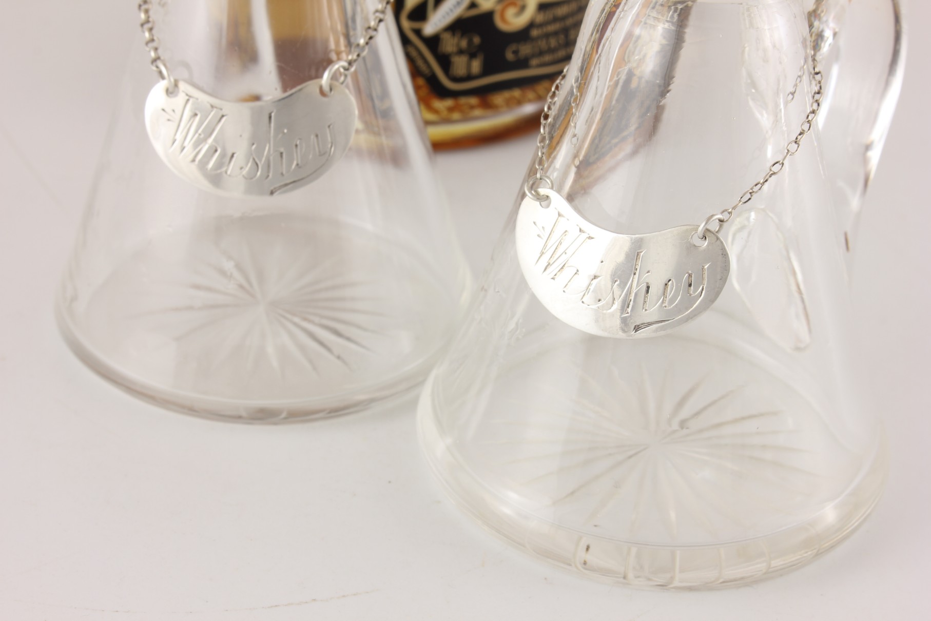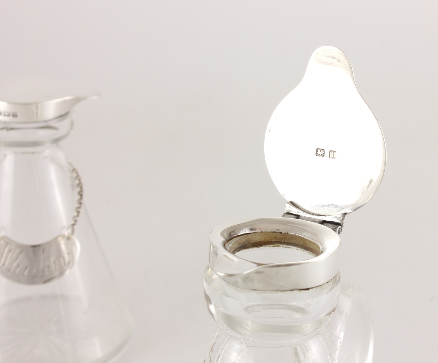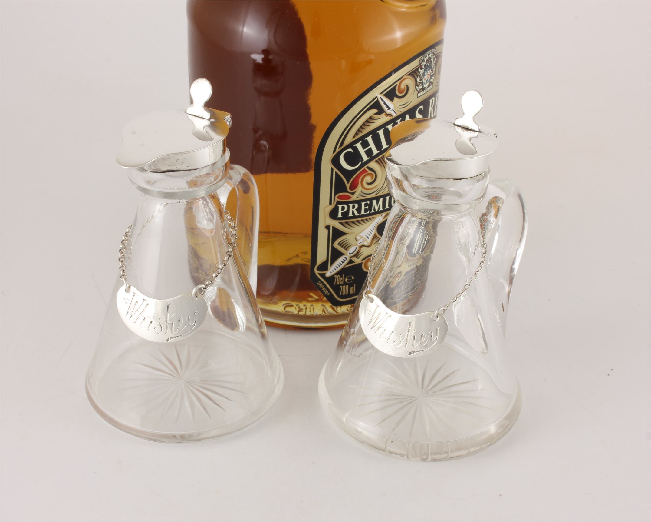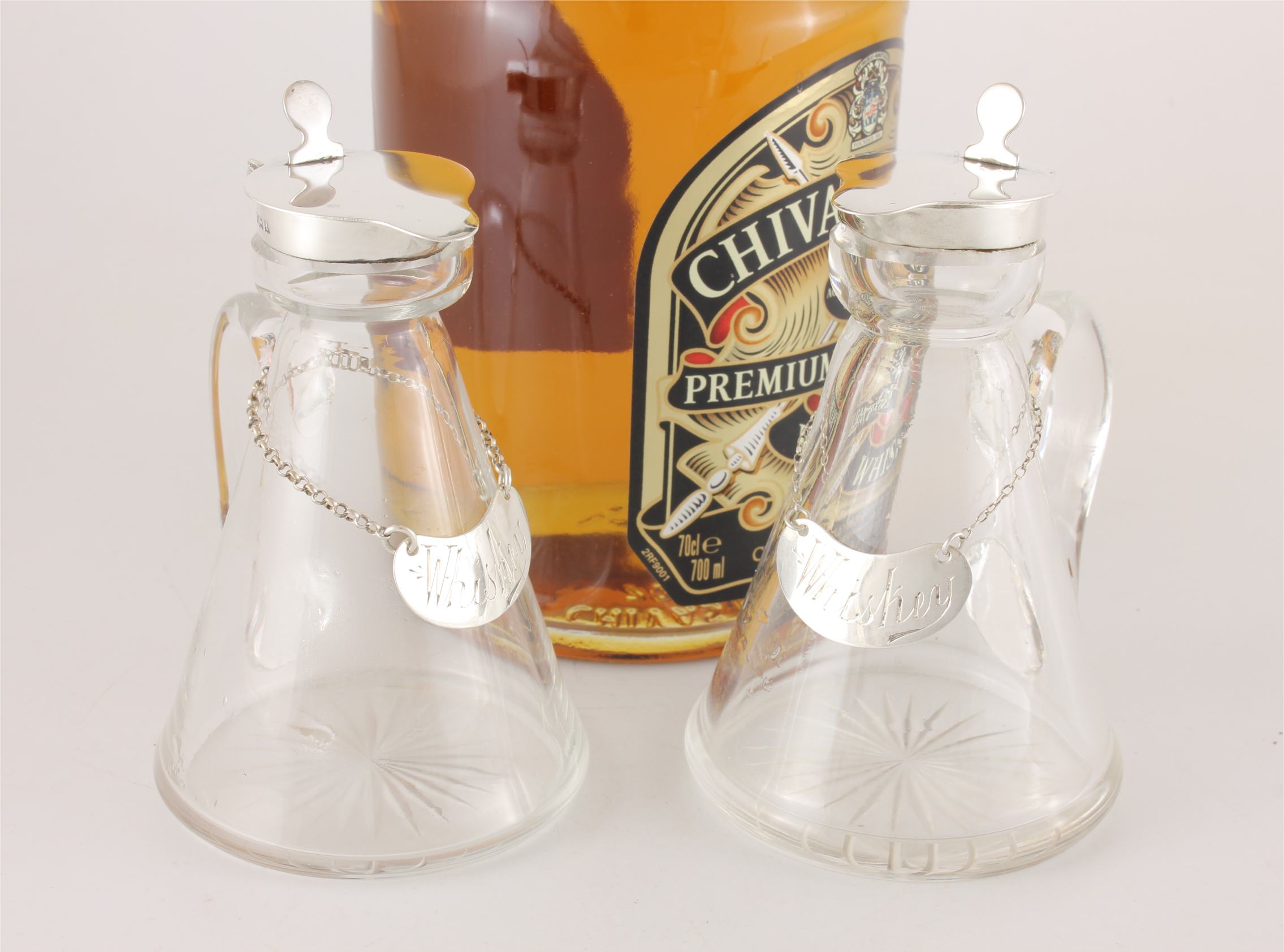 This beautiful pair of antique silver mounted whisky noggins or tots by top quality silversmith Hukin & Heath, have a stylish glass body with star-cut bases and come with their original Whisky labels.