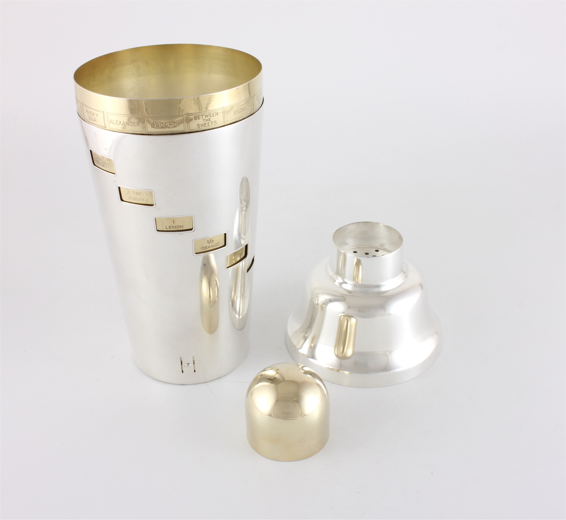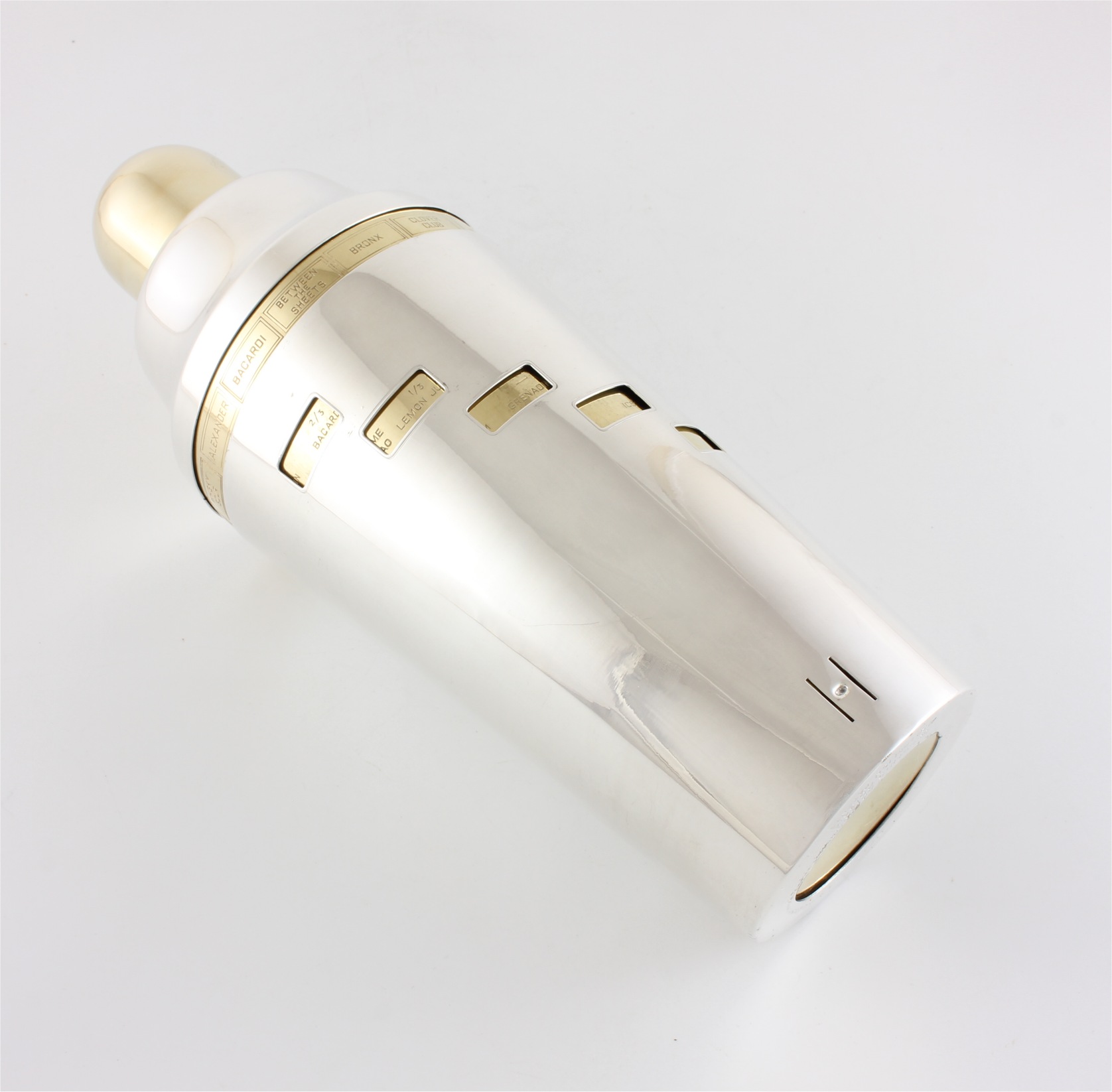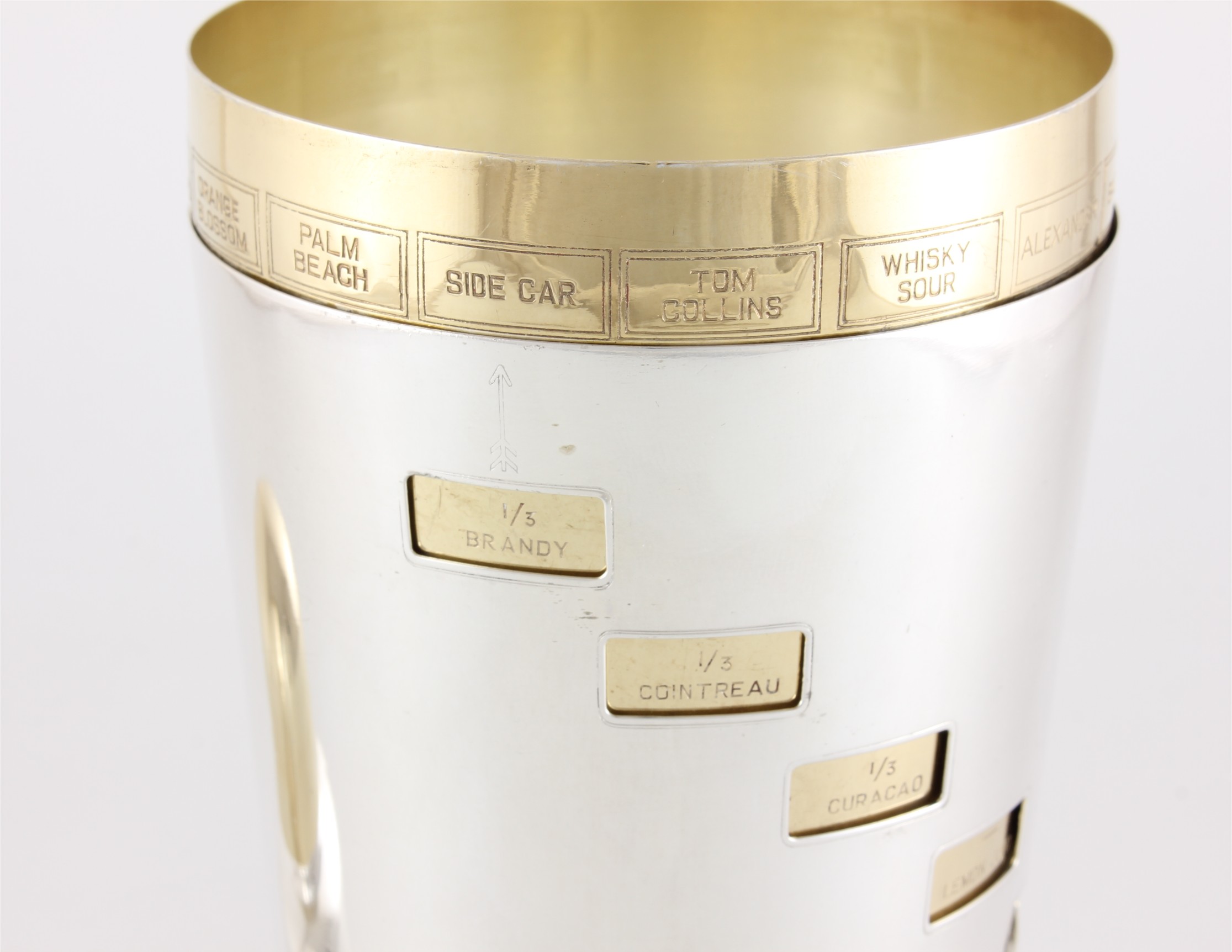 This stylish Art Deco Dial a Drink recipe cocktail shaker is by the American company Napier and features a silver plated sleeve which fits over the nicely gilded body.