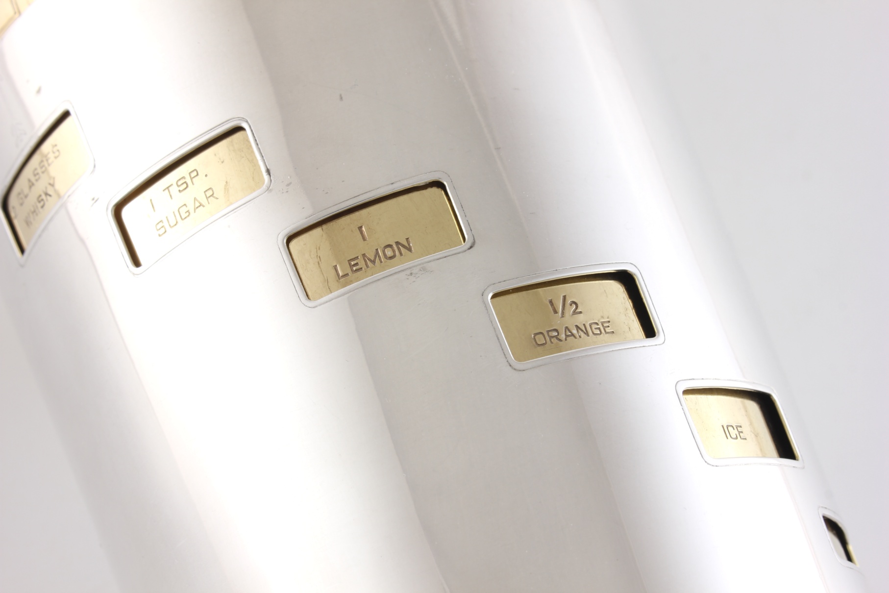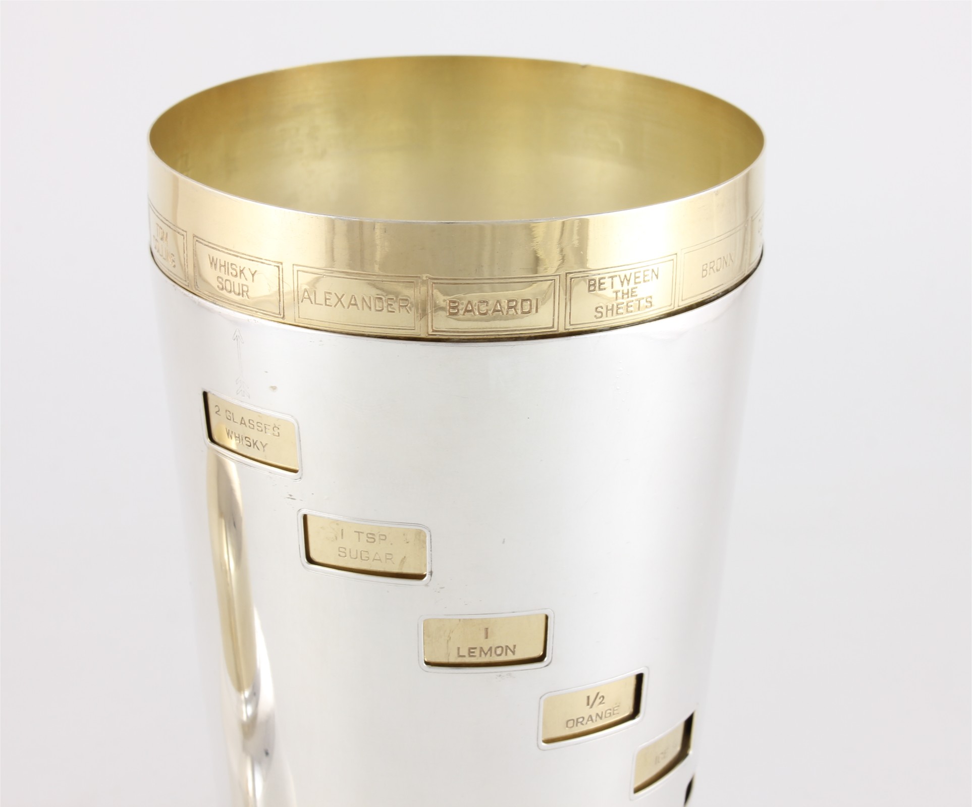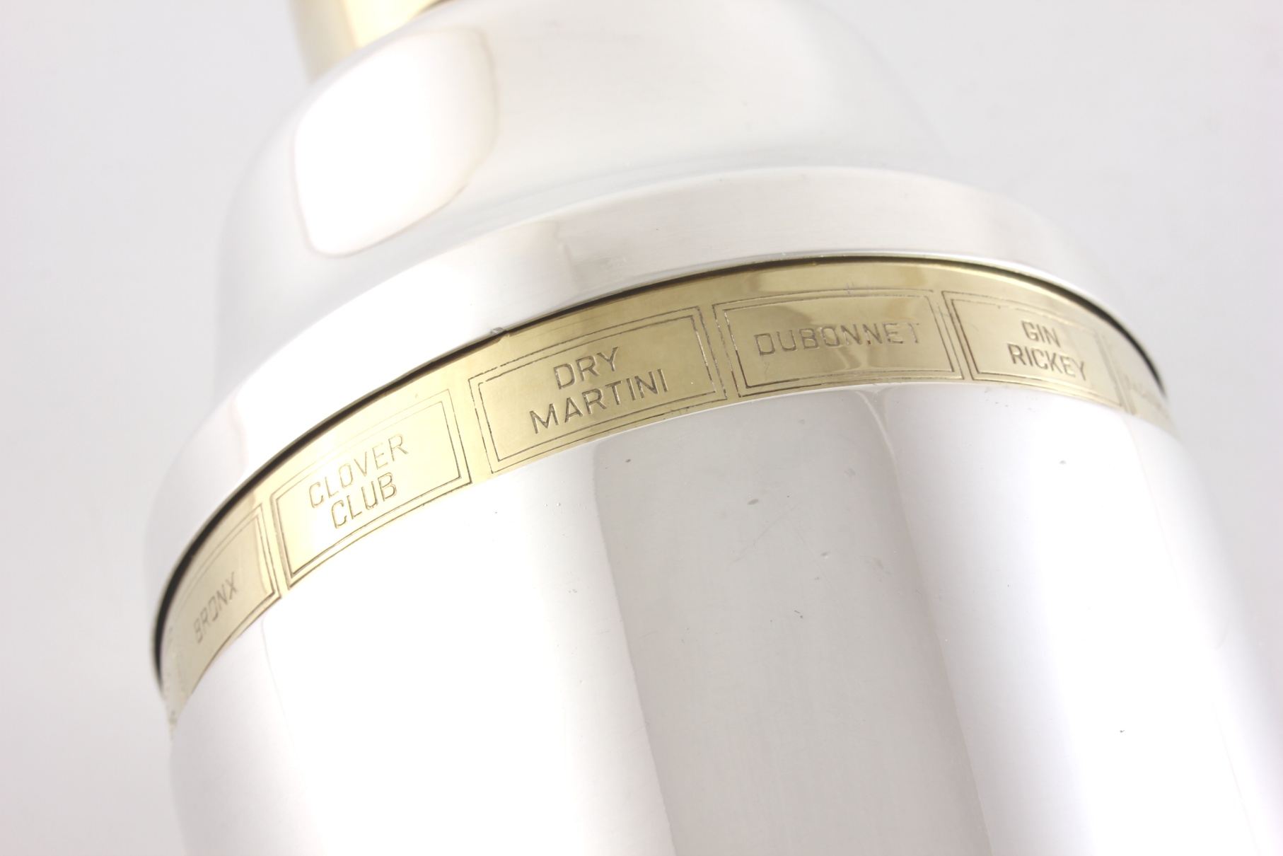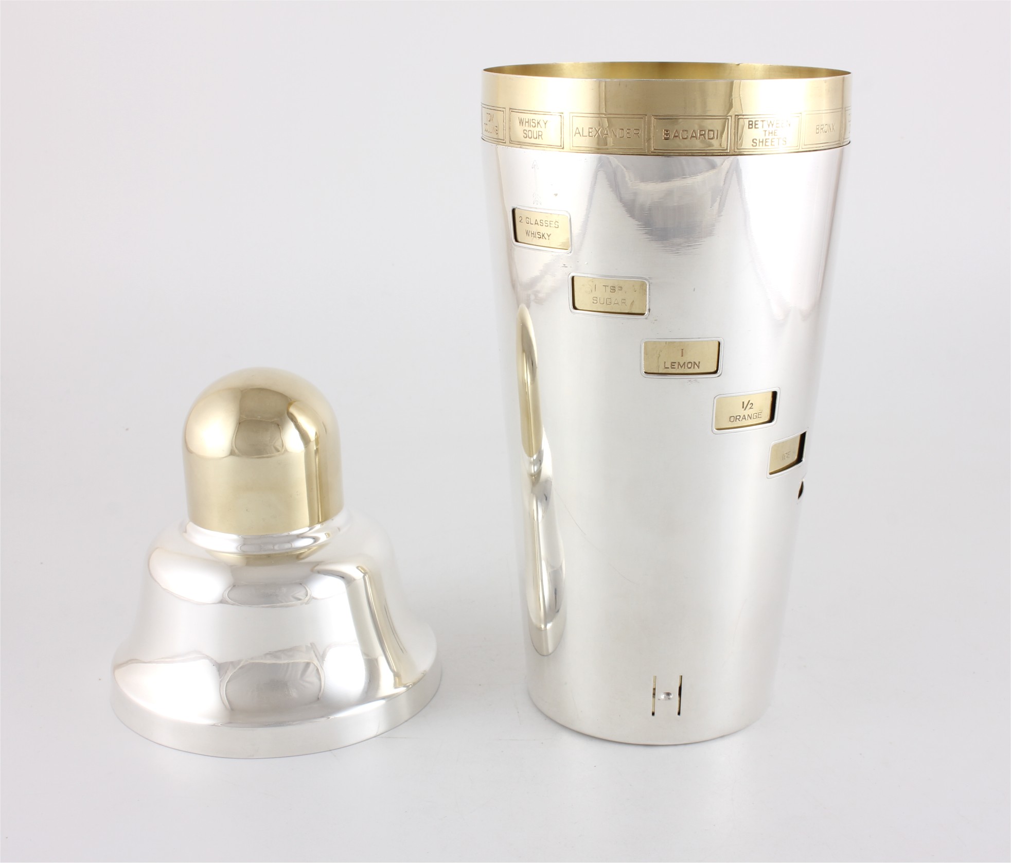 This stylish Art Deco Dial a Drink recipe cocktail shaker is by the American company Napier and features a silver plated sleeve which fits over the nicely gilded body.