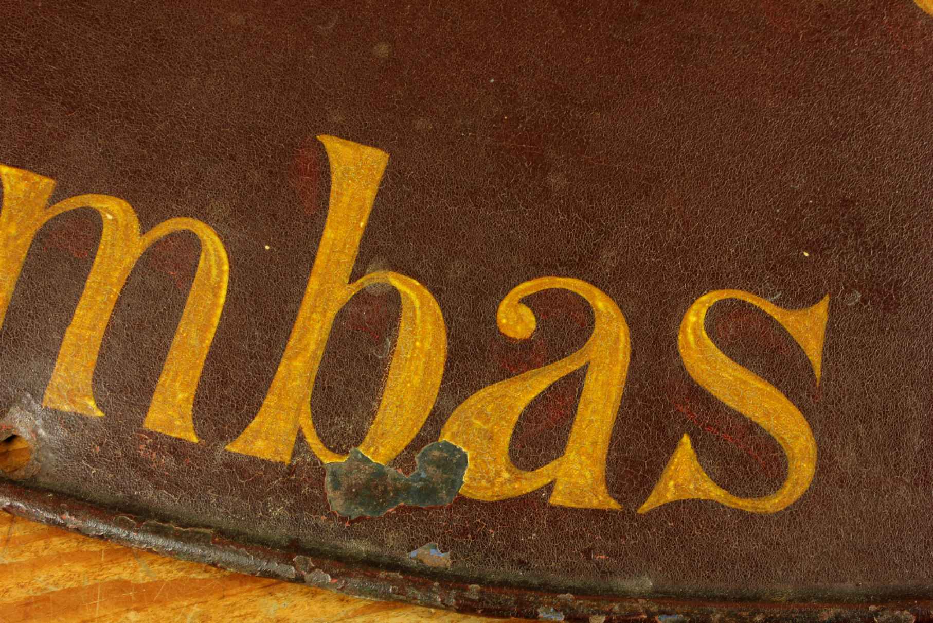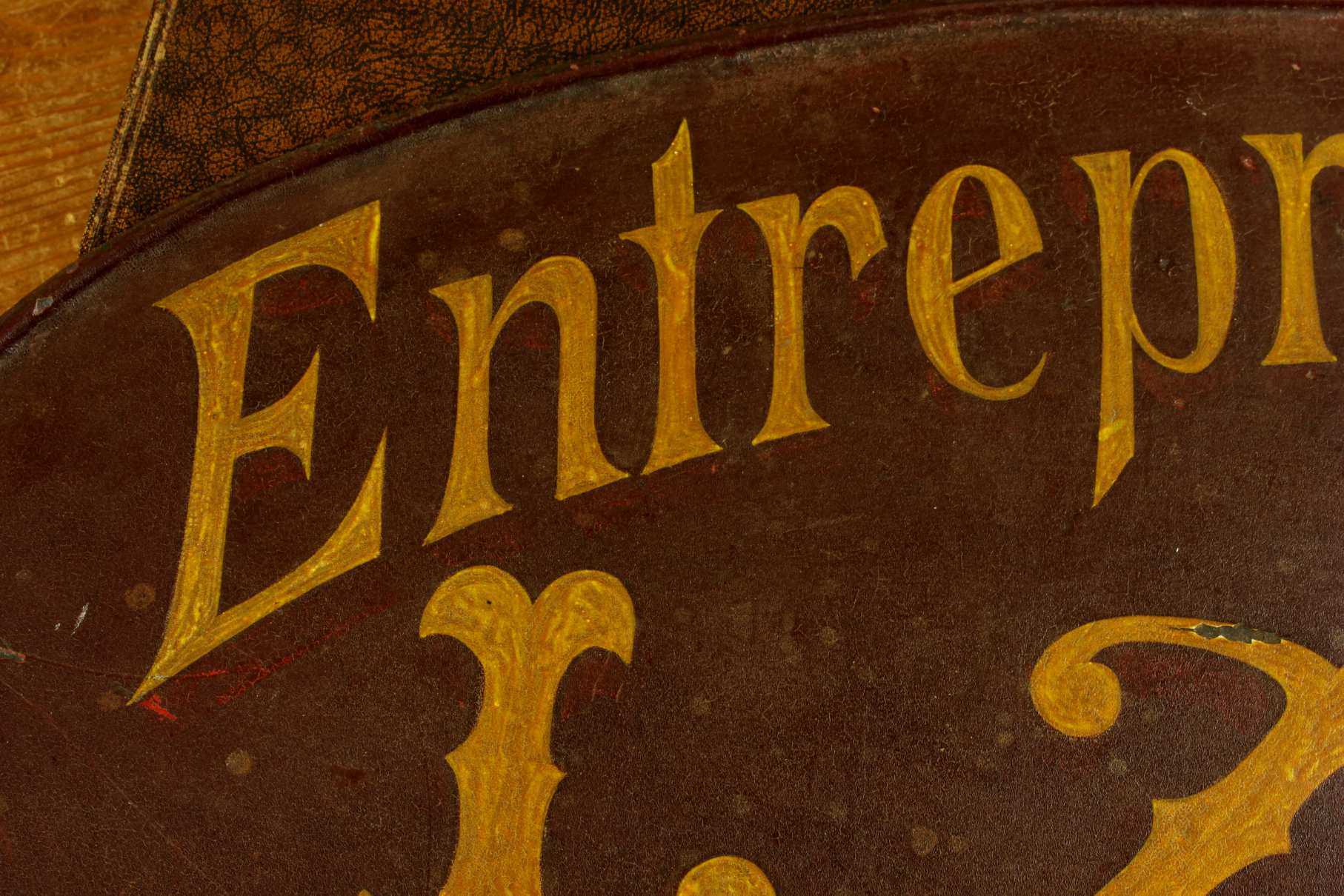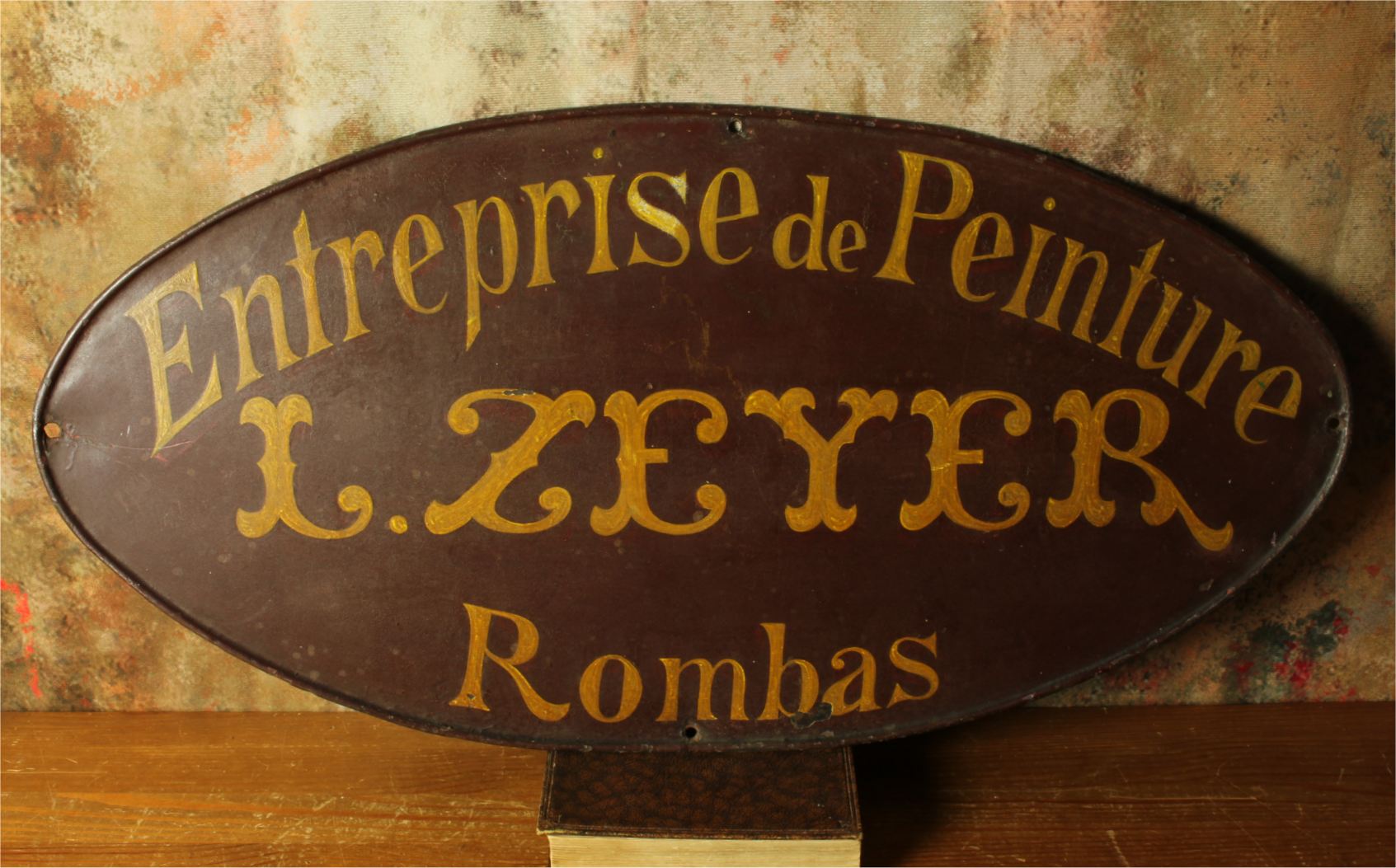 This fabulous highly decorative French tradesman's sign which is made of metal has a painted brown background with beautifully hand painted wording to the front in orange / brown that reads Entreprise de Peinture, L Zeyer, Rombas.