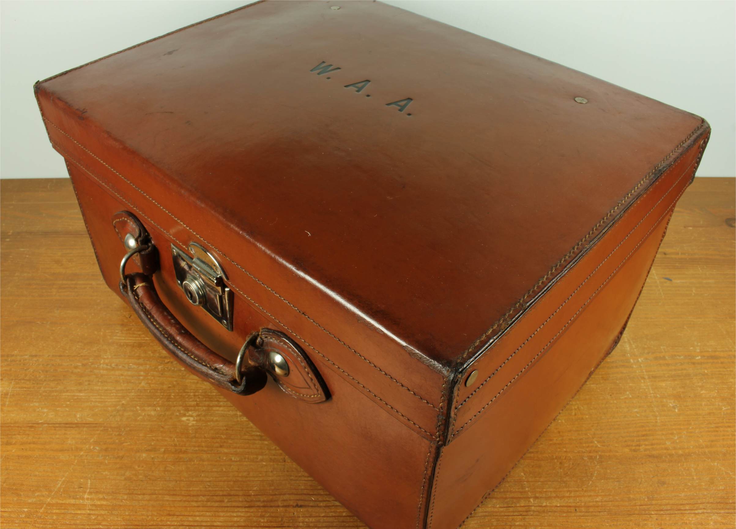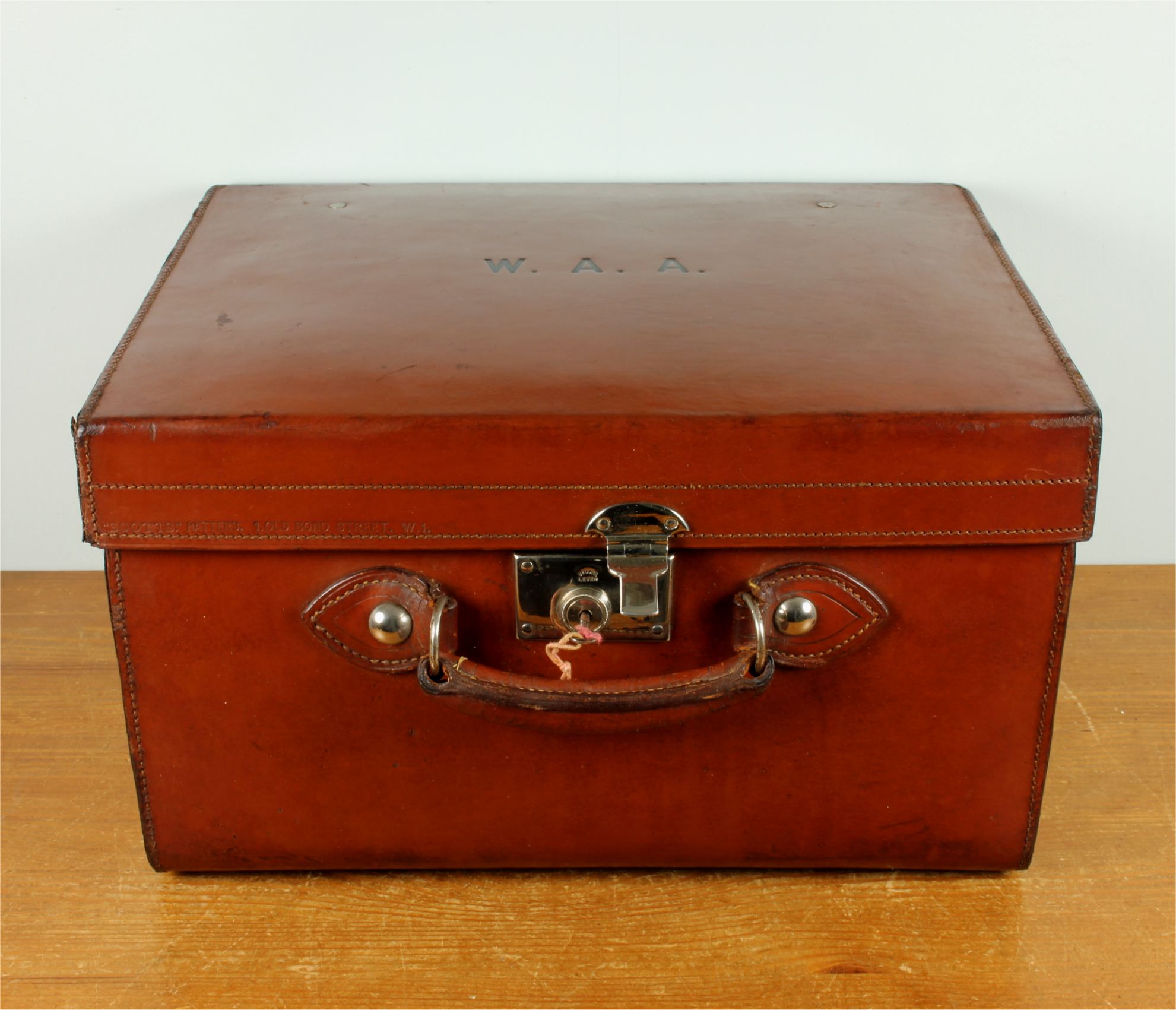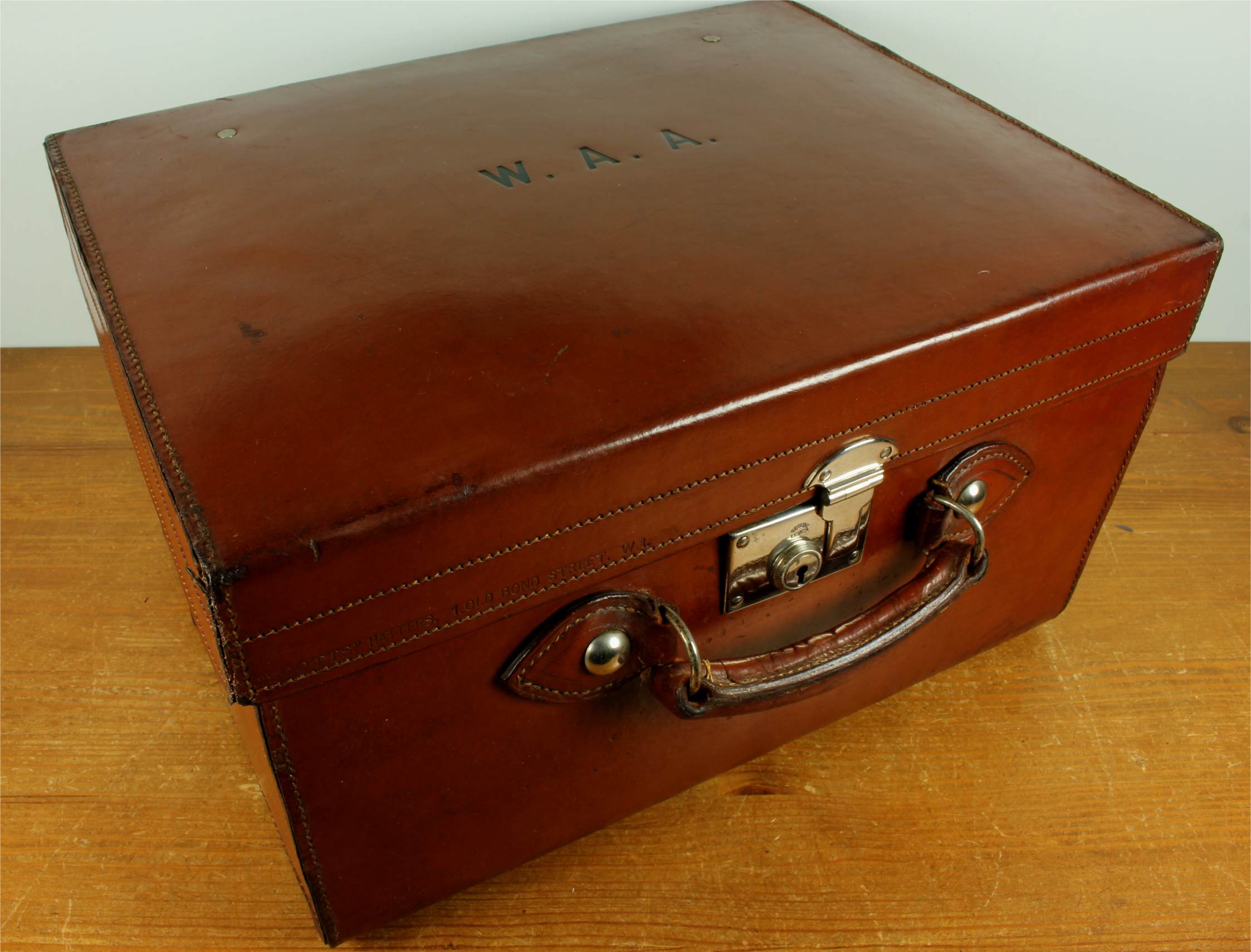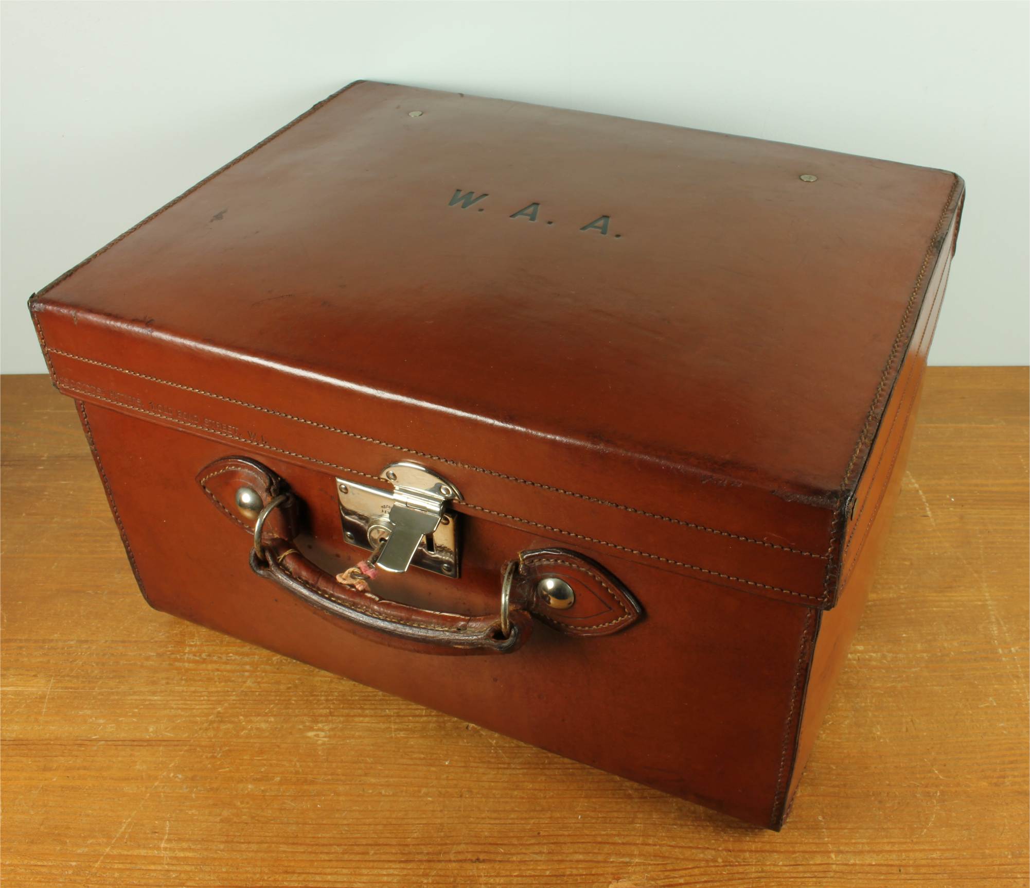 The beautiful case which has a wonderful patina has metal fittings, a metal lock which is marked Secure Lever, a leather carry handle, is nicely monogrammed W.A.A to the lid, stud feet to the underside, leather inner straps and is embossed with the maker's details. The lock works with the key.