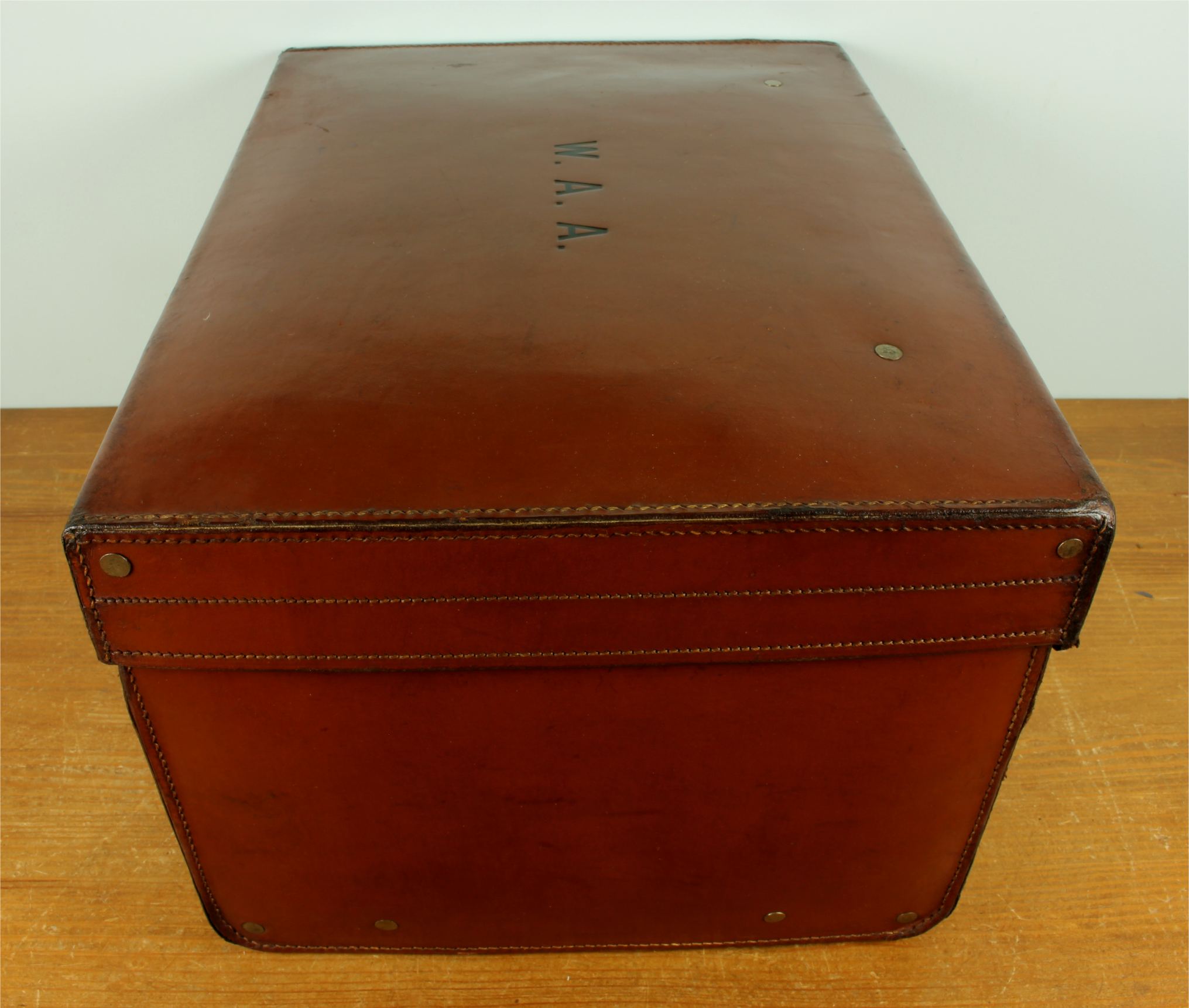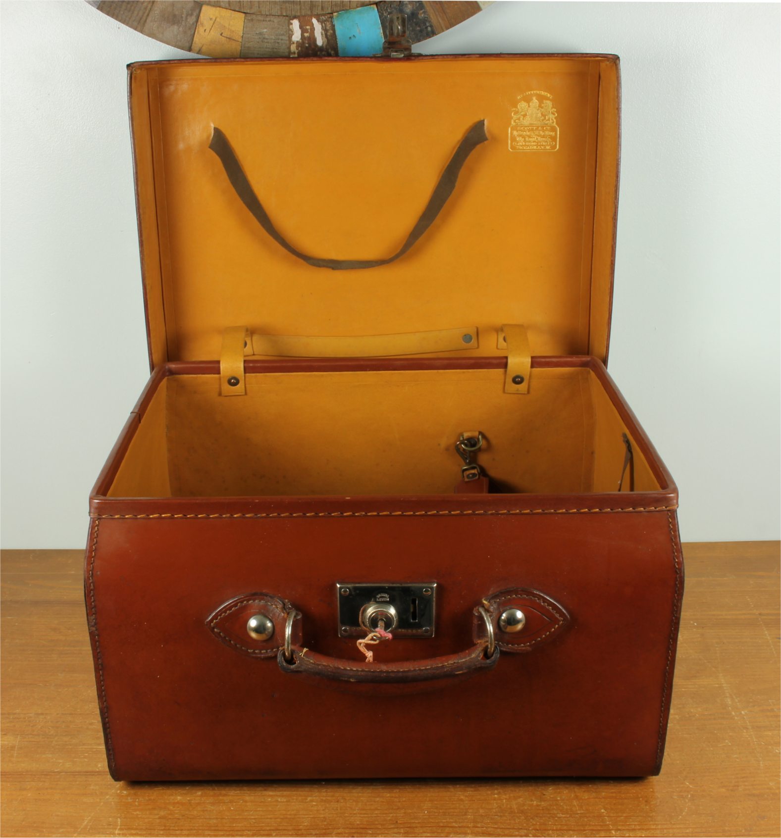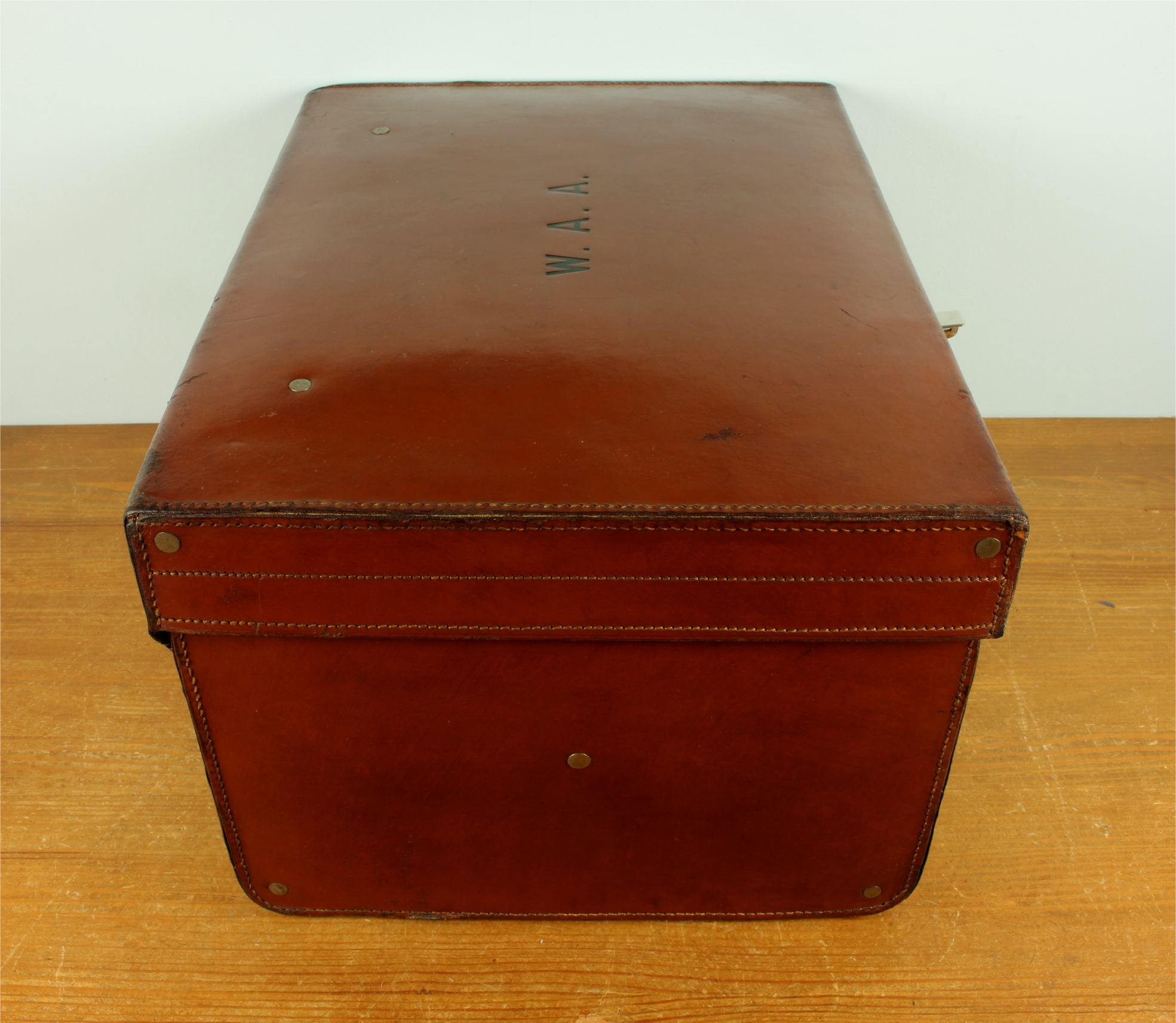 The beautiful case which has a wonderful patina has metal fittings, a metal lock which is marked Secure Lever, a leather carry handle, is nicely monogrammed W.A.A to the lid, stud feet to the underside, leather inner straps and is embossed with the maker's details. The lock works with the key.