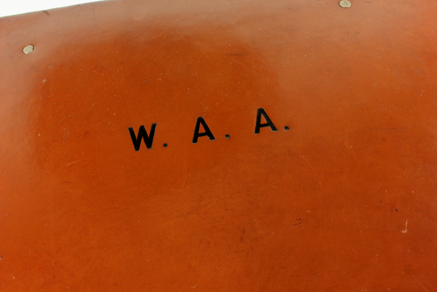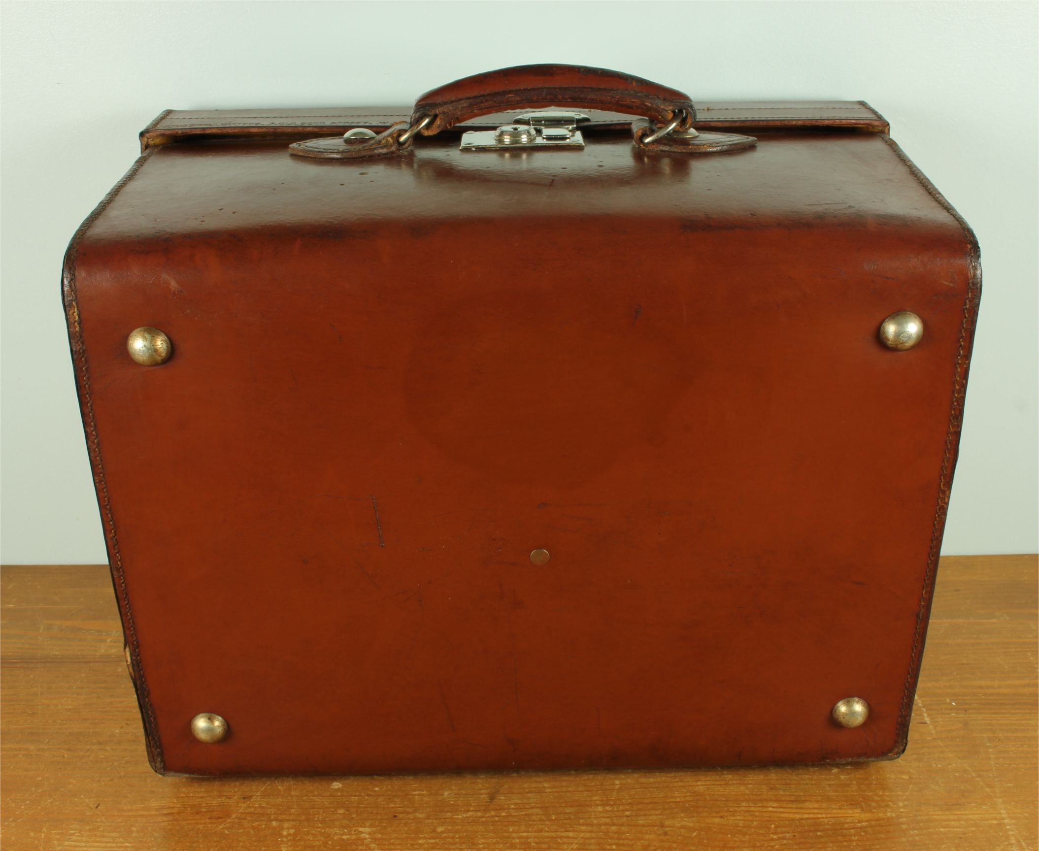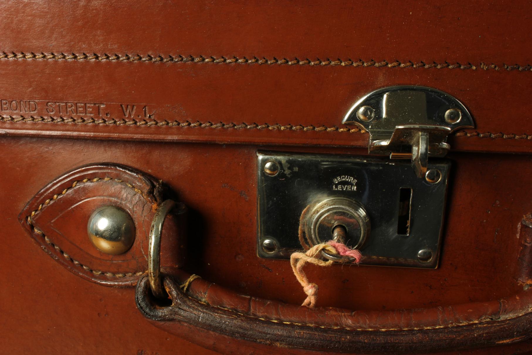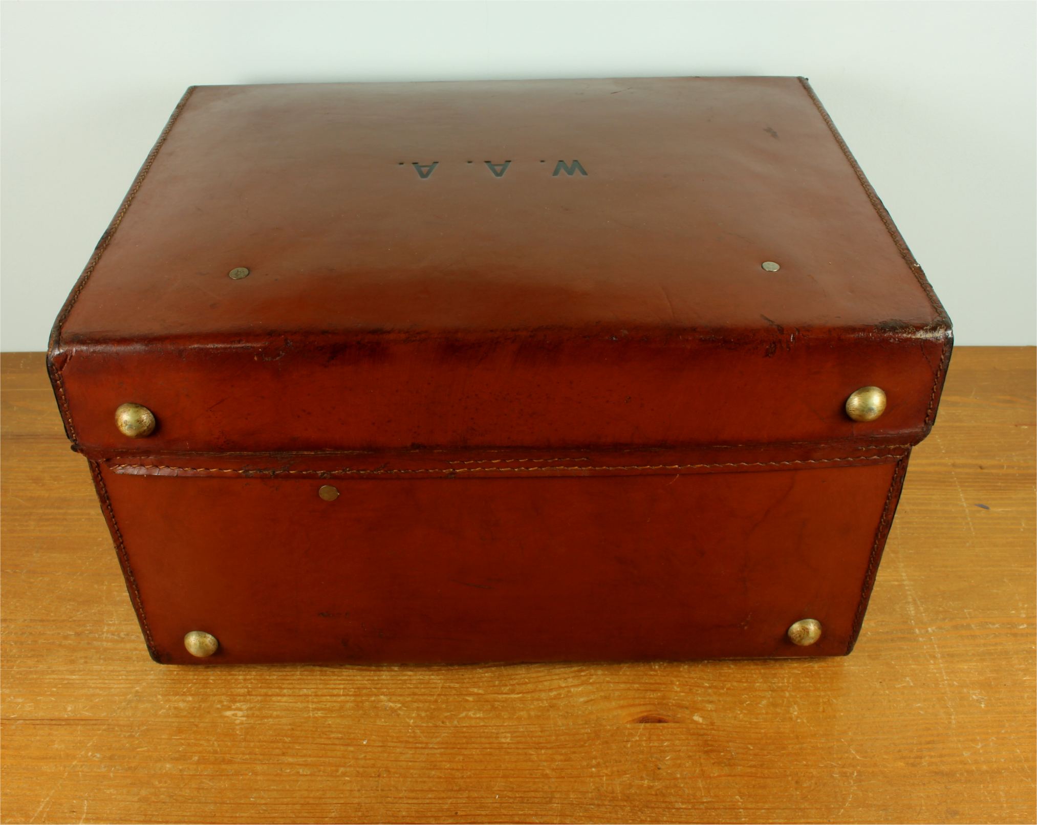 The beautiful case which has a wonderful patina has metal fittings, a metal lock which is marked Secure Lever, a leather carry handle, is nicely monogrammed W.A.A to the lid, stud feet to the underside, leather inner straps and is embossed with the maker's details. The lock works with the key.