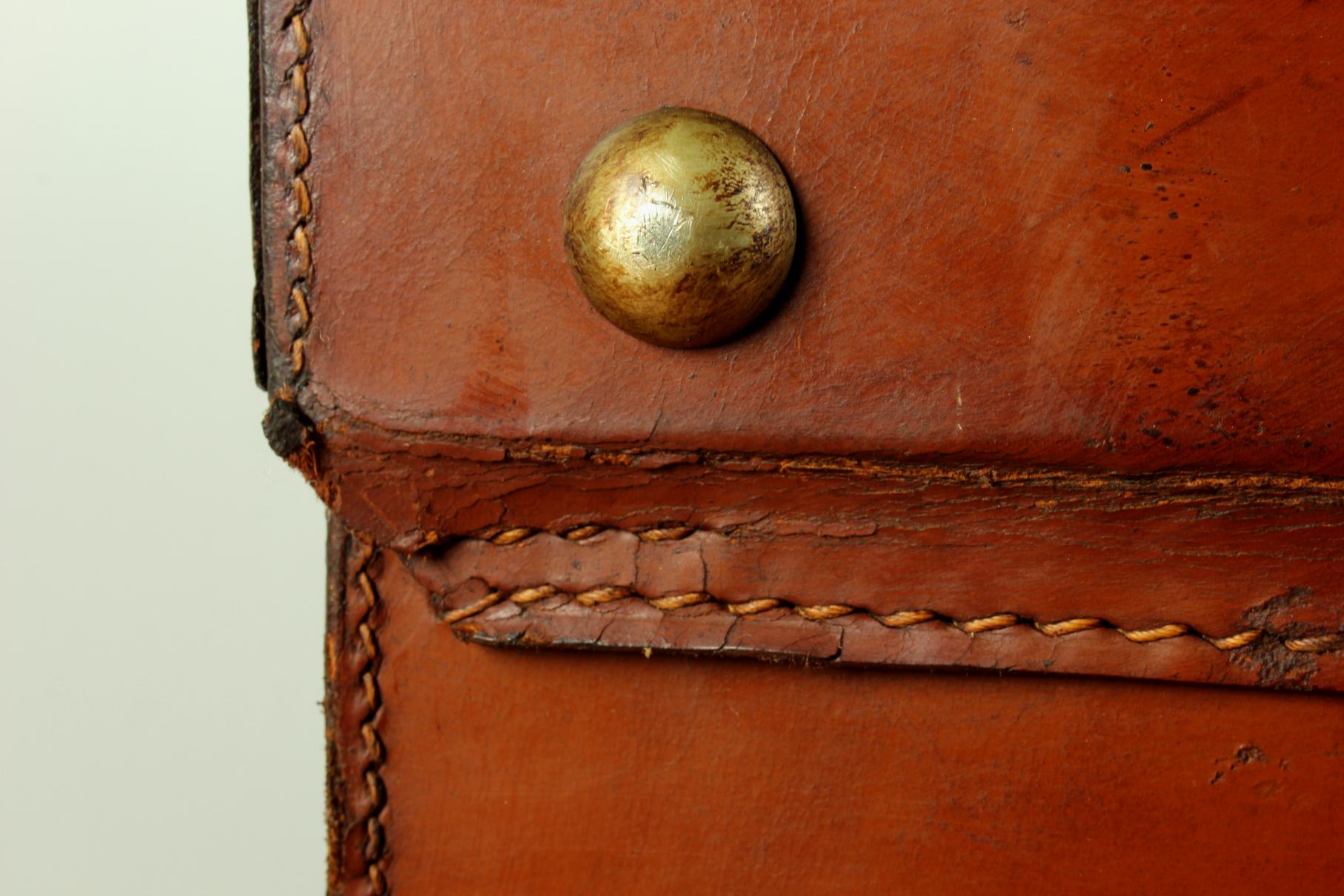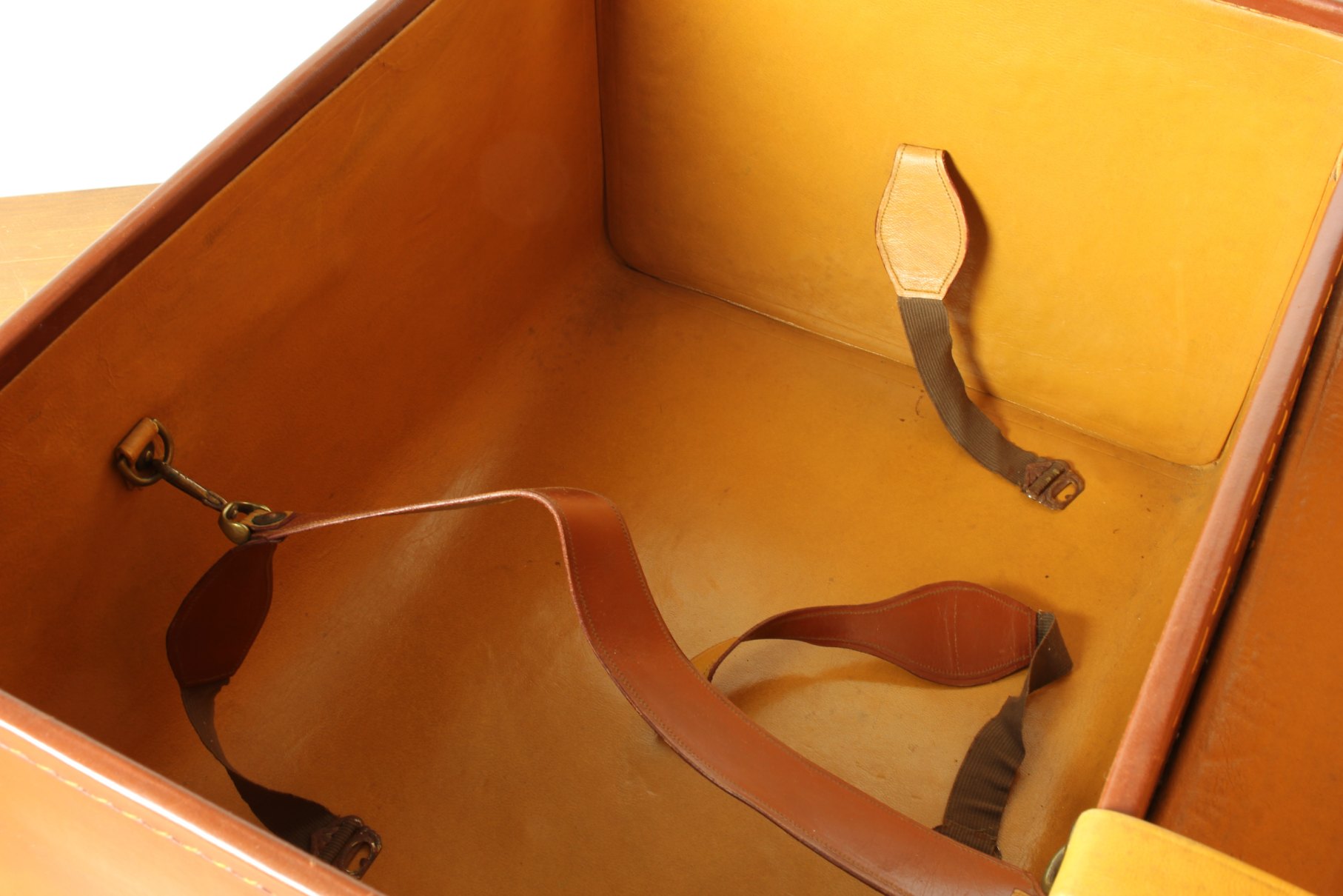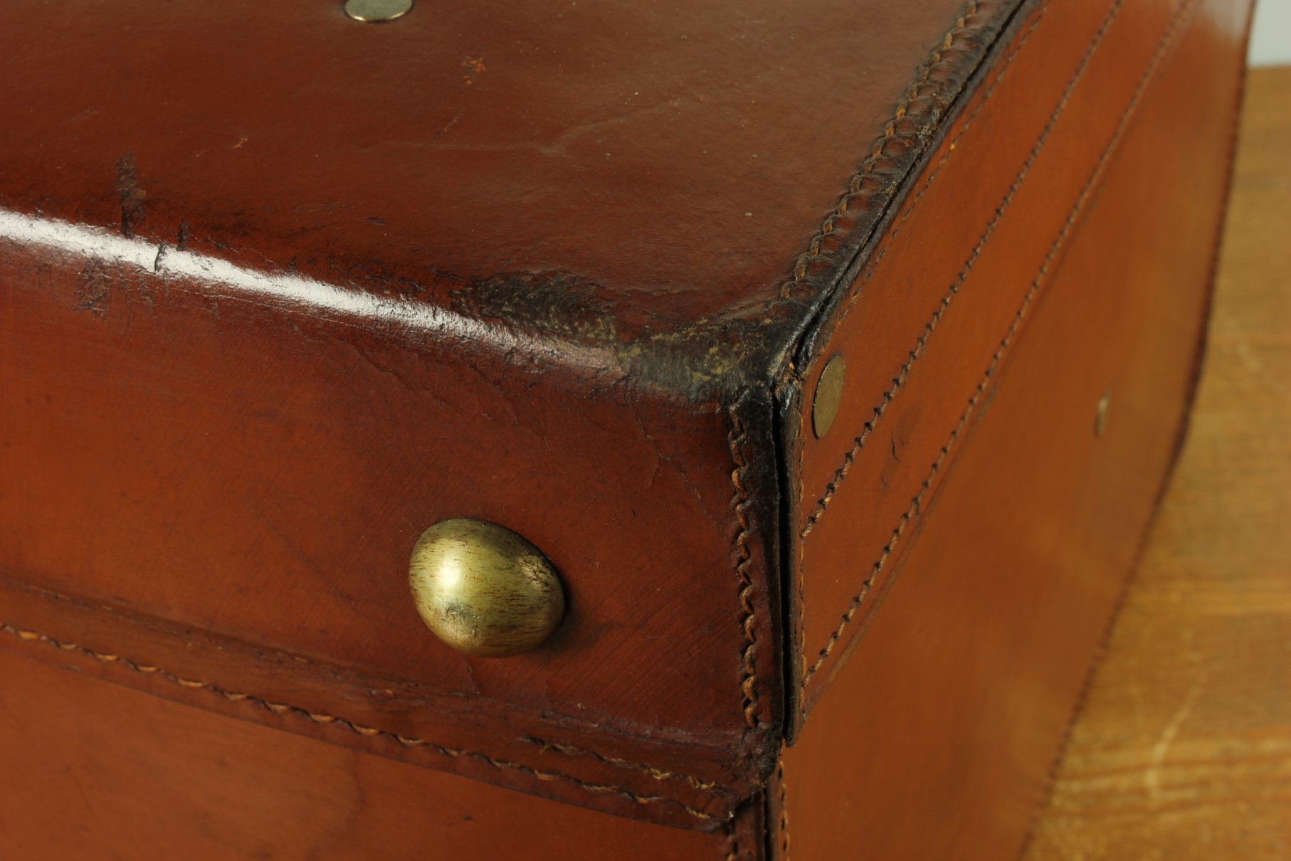 This leather hat case is a very nice quality piece that is well made of thick leather and has it's front lower corners shaped to fit inside the top lid.