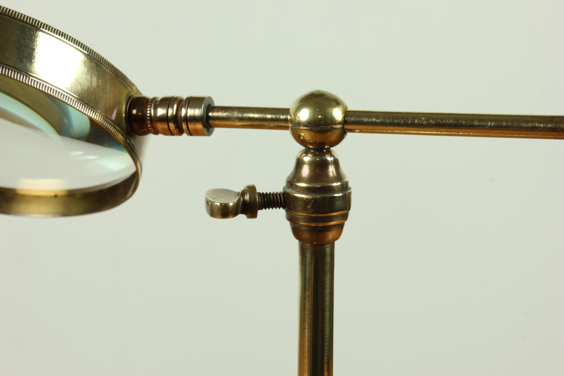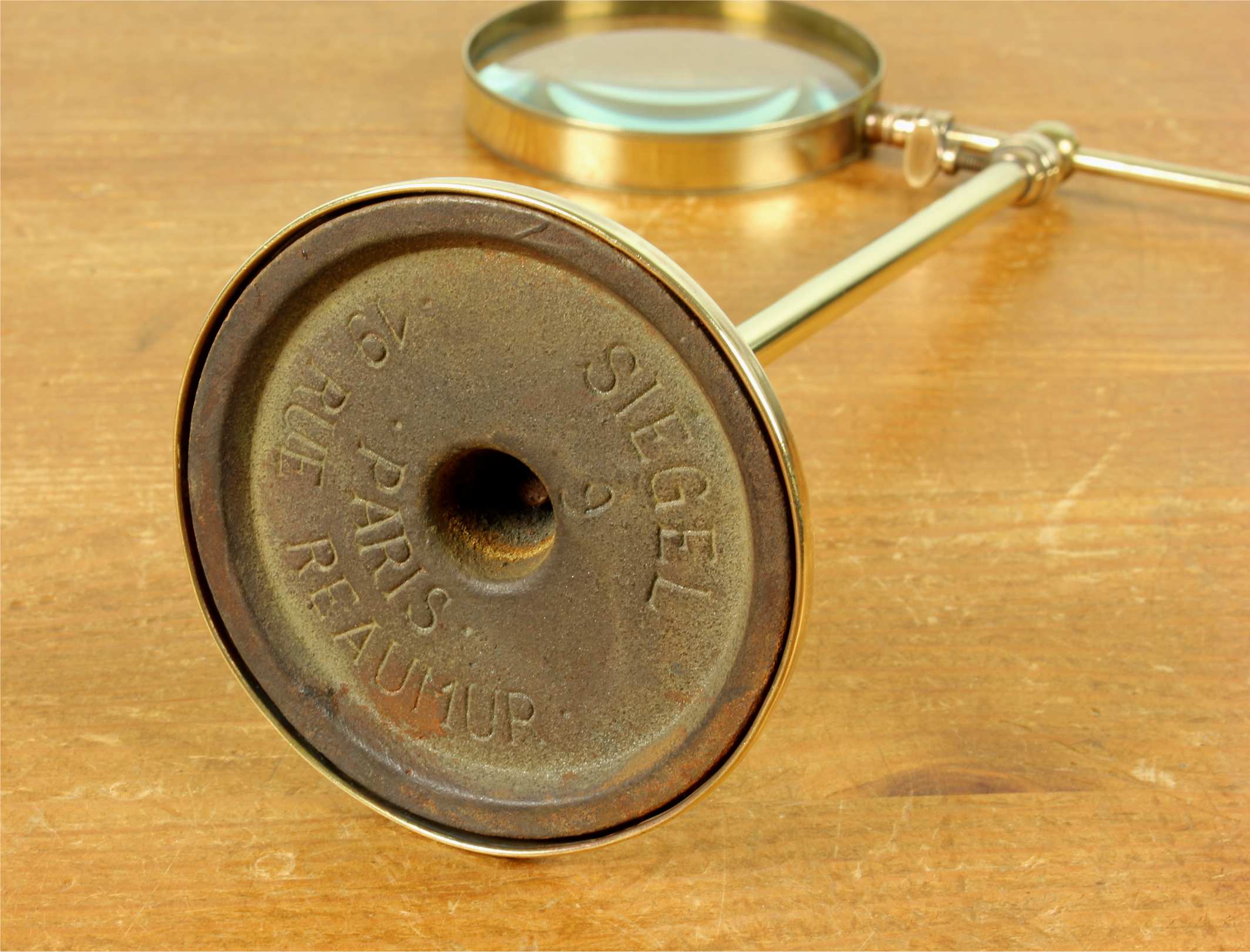 This fine quality antique French magnifying glass which is made of brass dates from the early 1900's has a round weighted base which is embossed to the underside with Siegel. 9. 19 Rue Reaumur Paris and has an extendable arm which holds a circular magnifying lens.