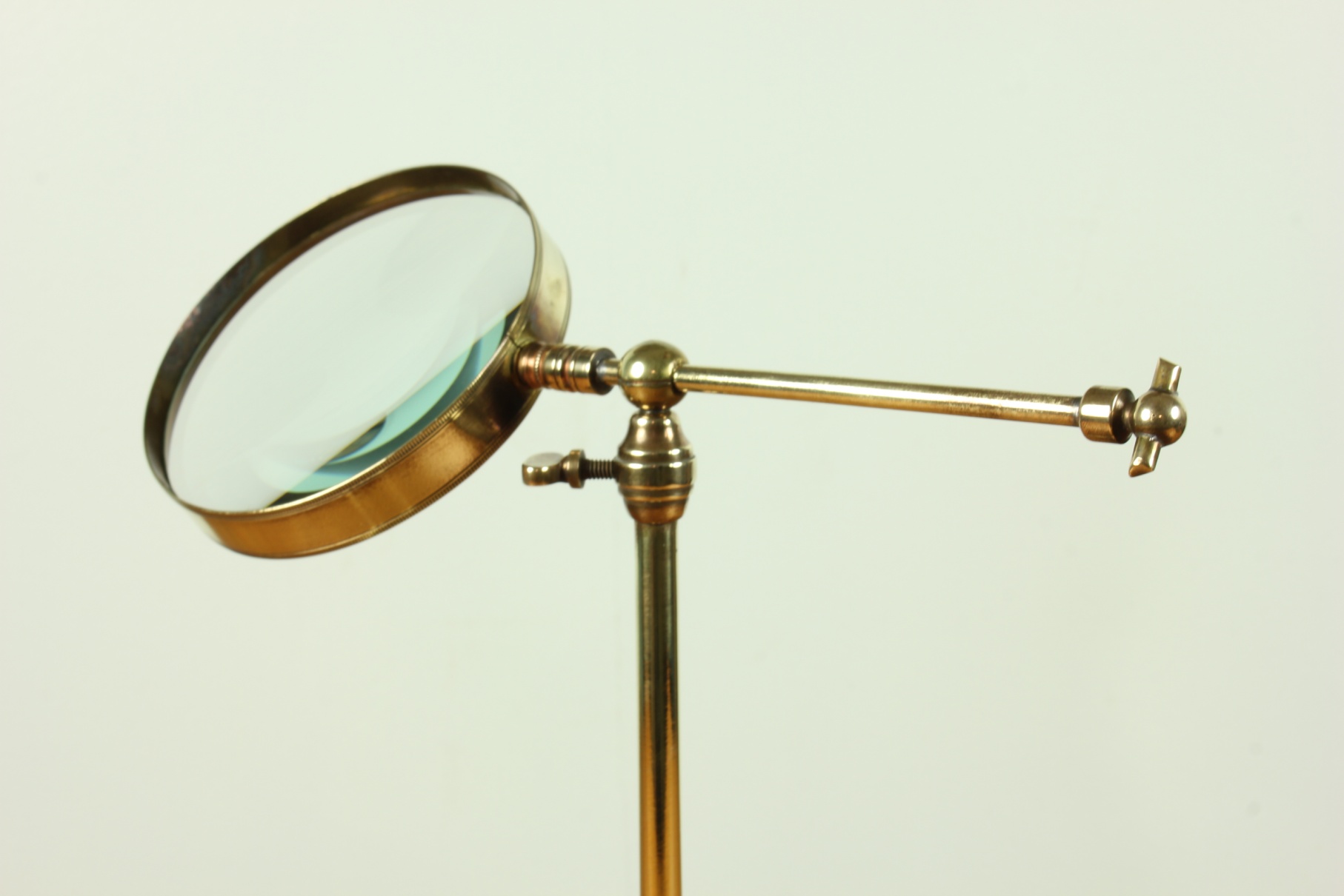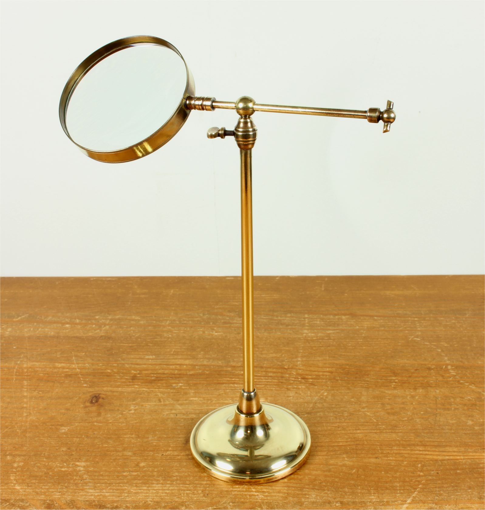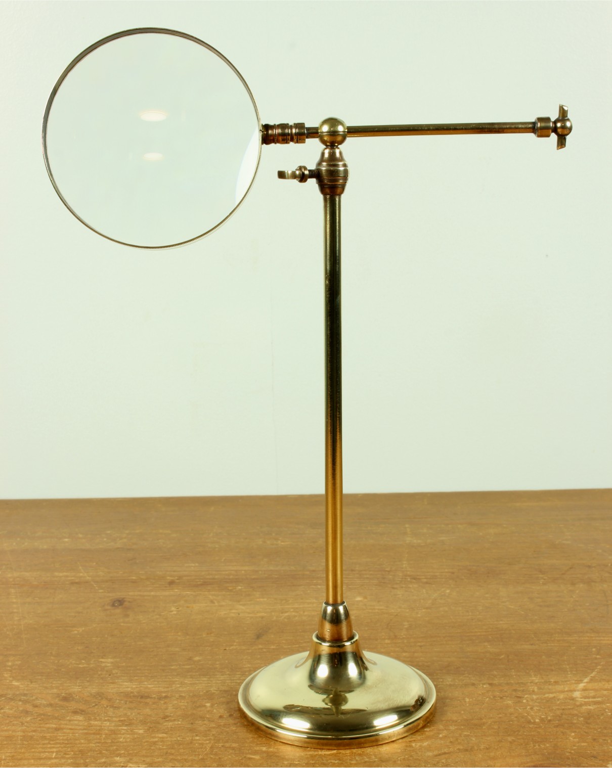 This brass stand which sits on a table top can have it's height adjusted by loosening the central screw and sliding and swivelling the arm to your required height and position.