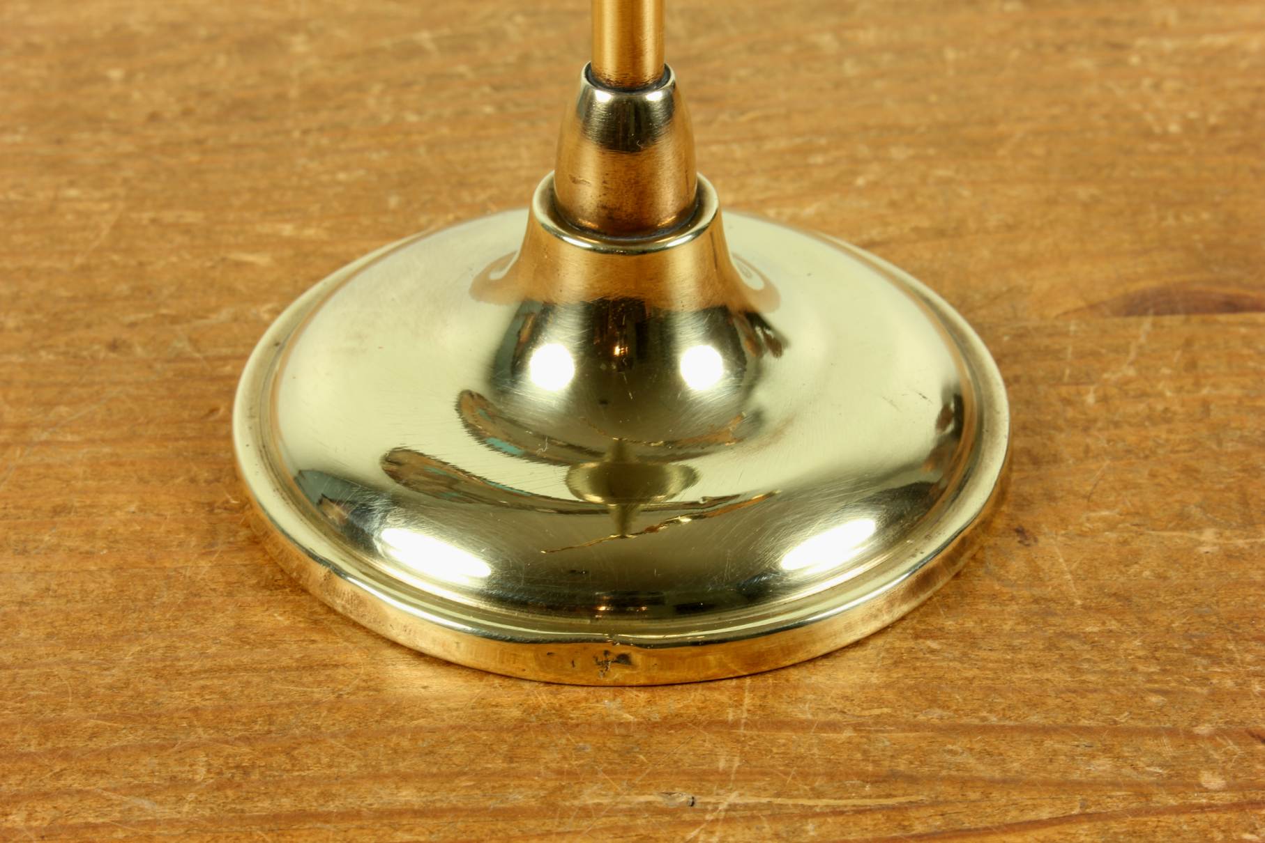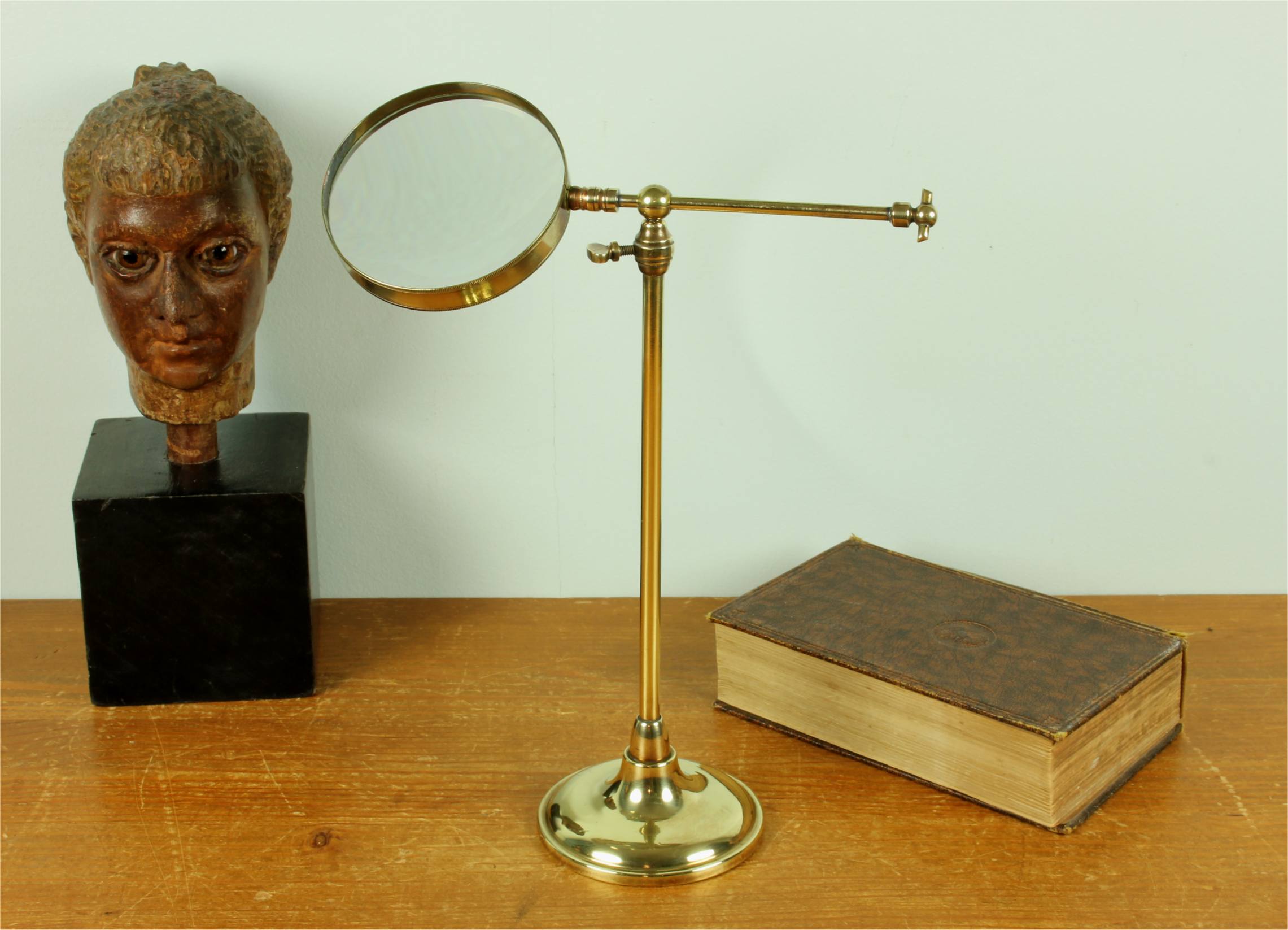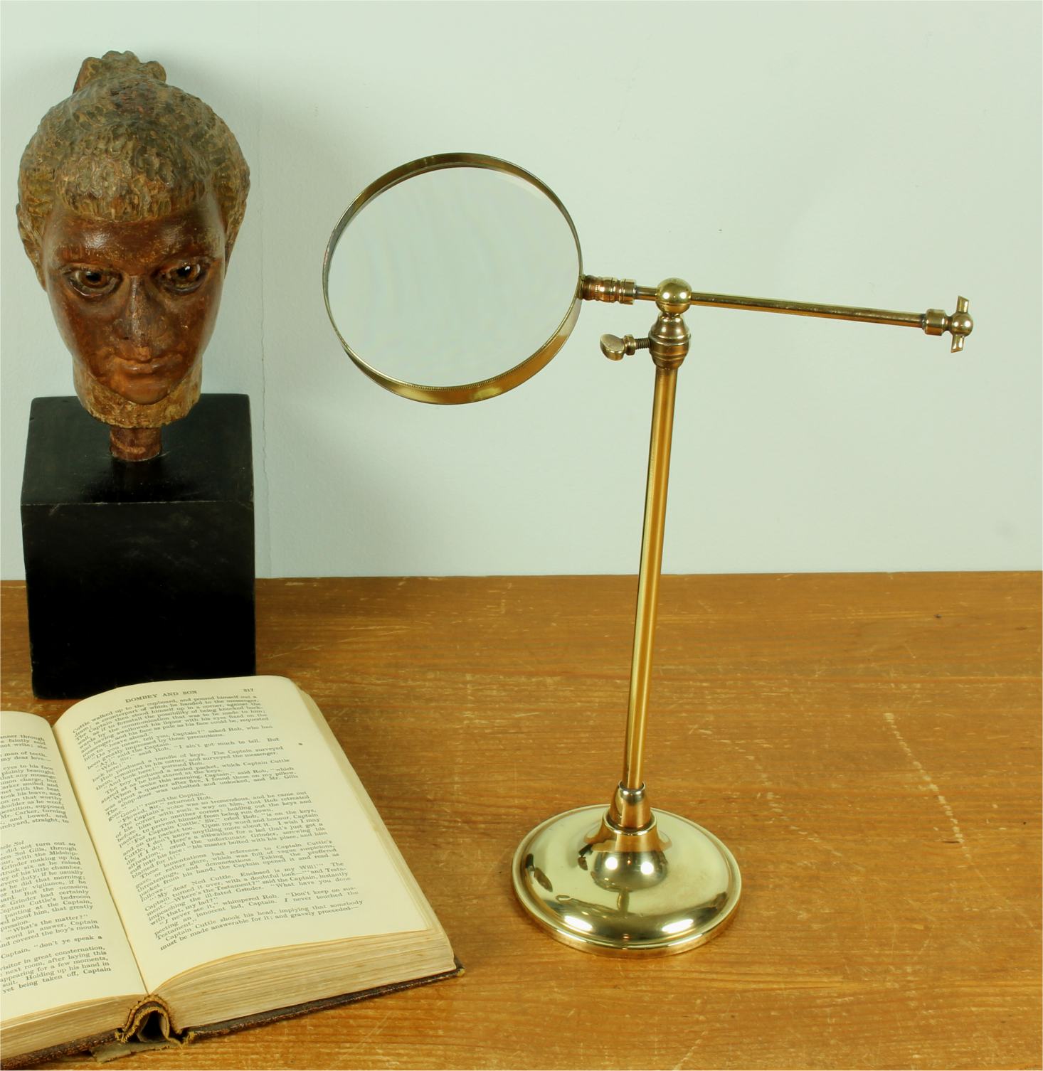 This brass stand which sits on a table top can have it's height adjusted by loosening the central screw and sliding and swivelling the arm to your required height and position.