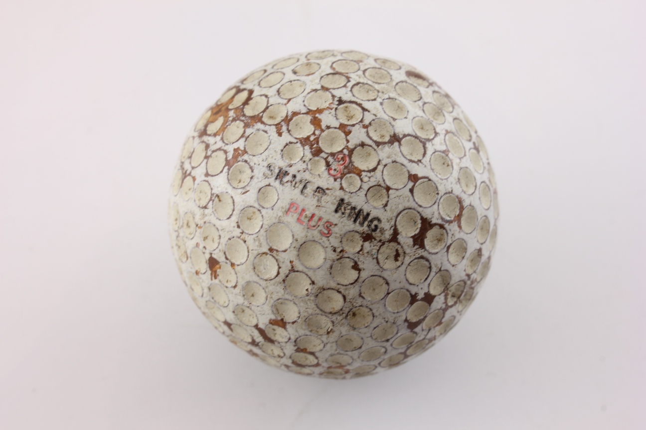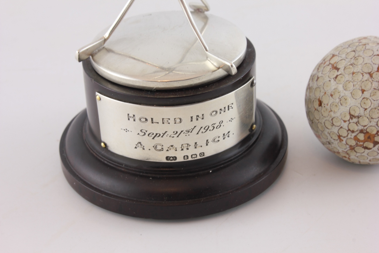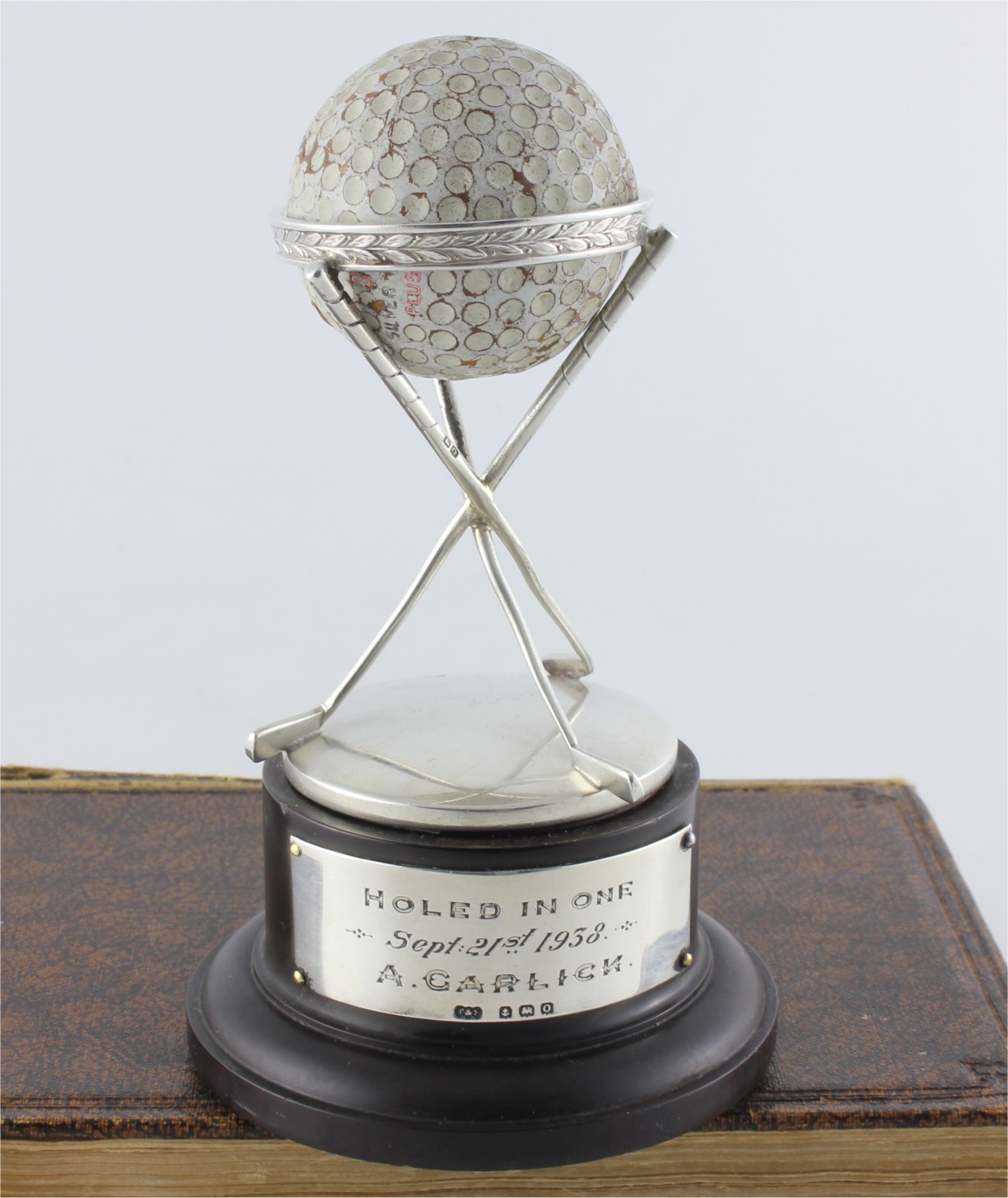 This antique Hole In One trophy which is made of solid silver is fully hallmarked for 1938 and features three crossed golf clubs with a ringed top that holds a Silver King Plus 3 golf ball.