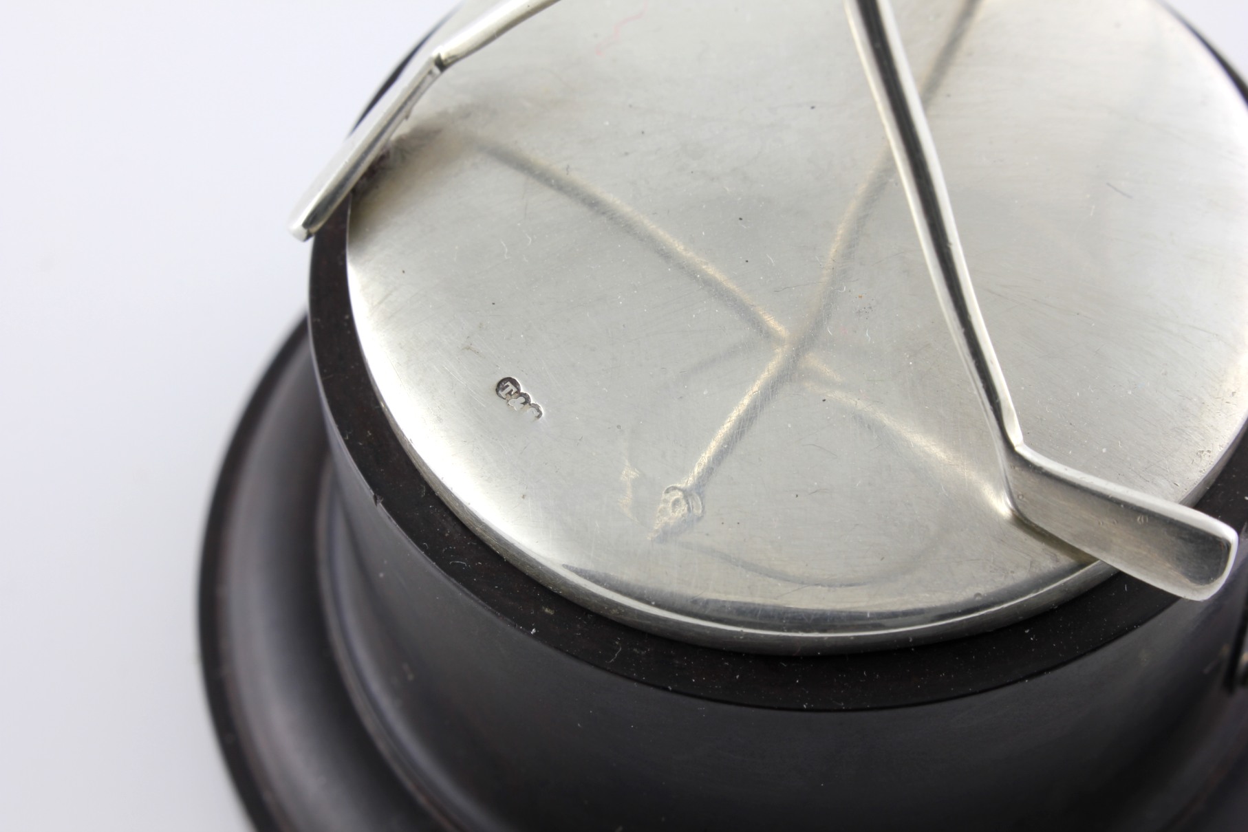 Hallmark to silver plaque: Lion for sterling silver. Anchor for Birmingham. Date letter O for 1938 and maker's mark T&S for Turner & Simpson Ltd.