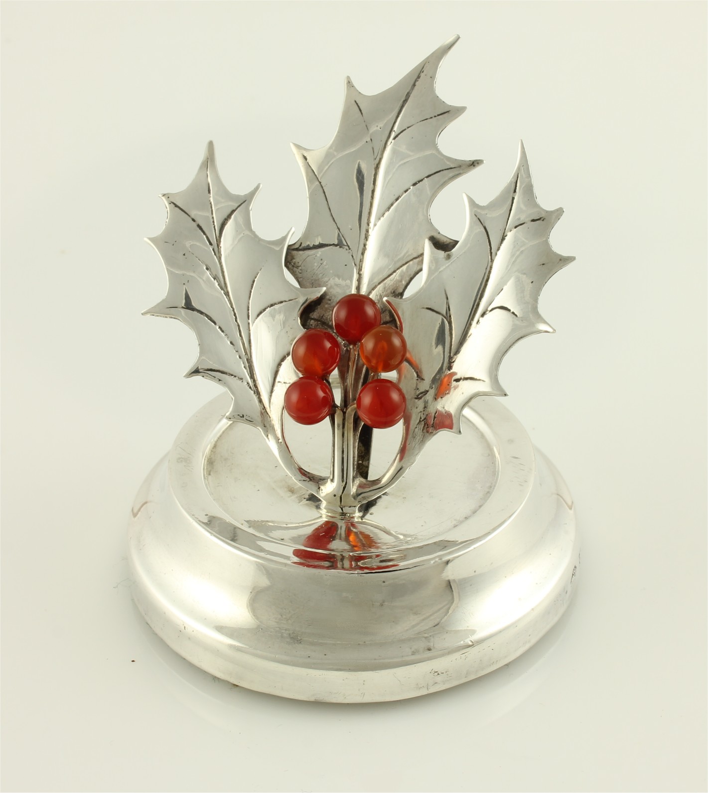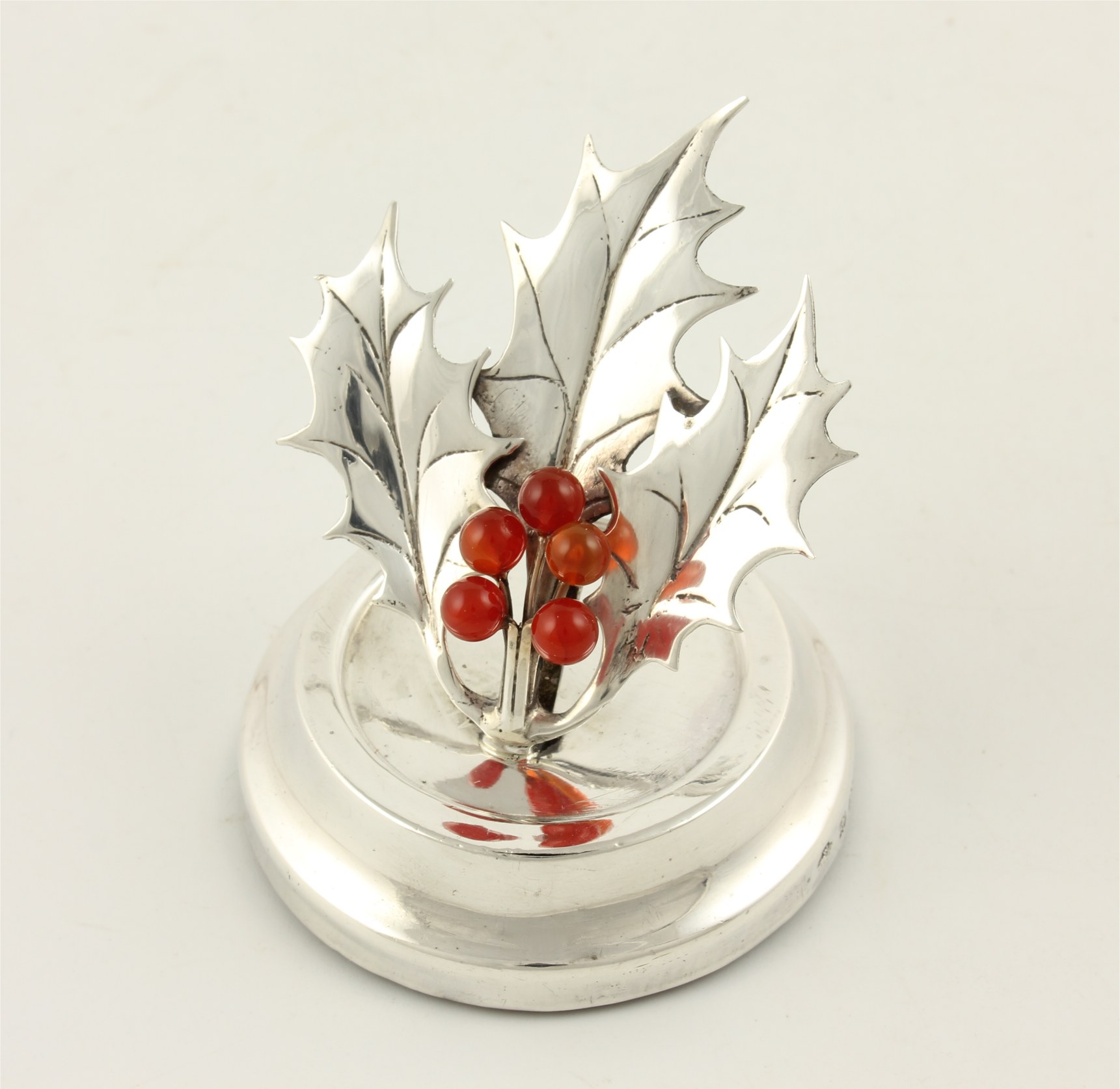 This stylish antique menu holder which is designed as a sprig of holly has good detail including holly berries and sits on it's hallmarked silver base.