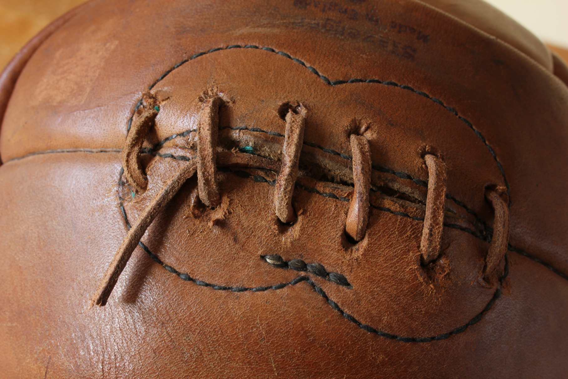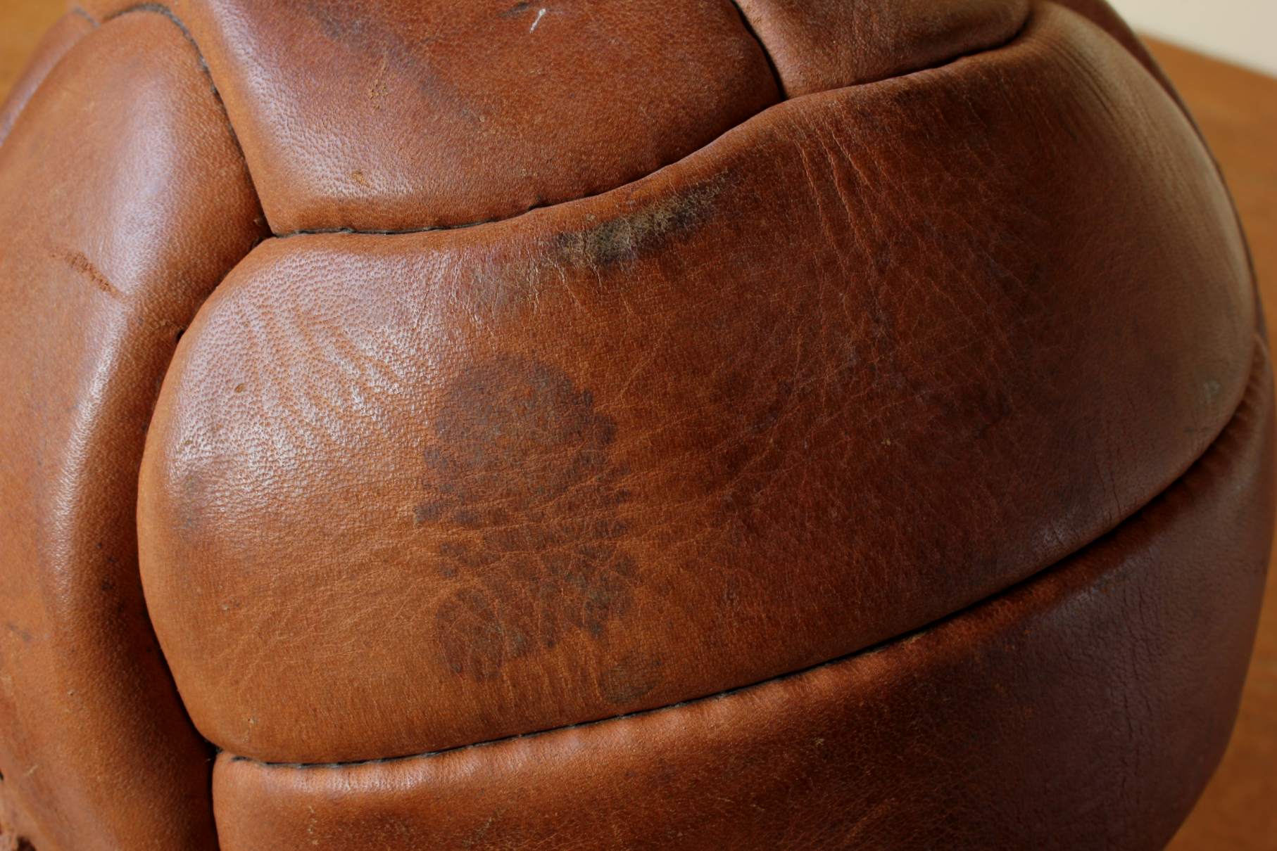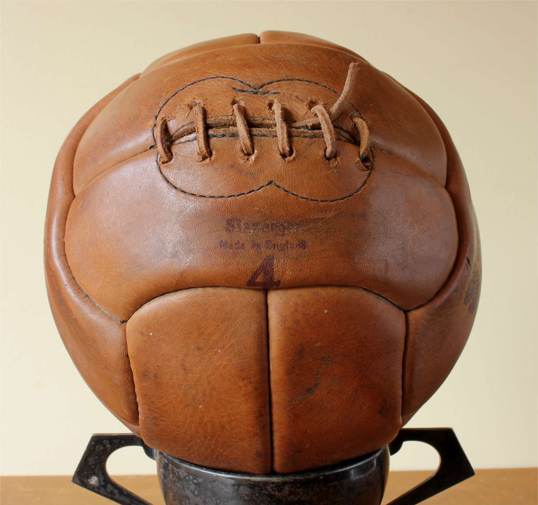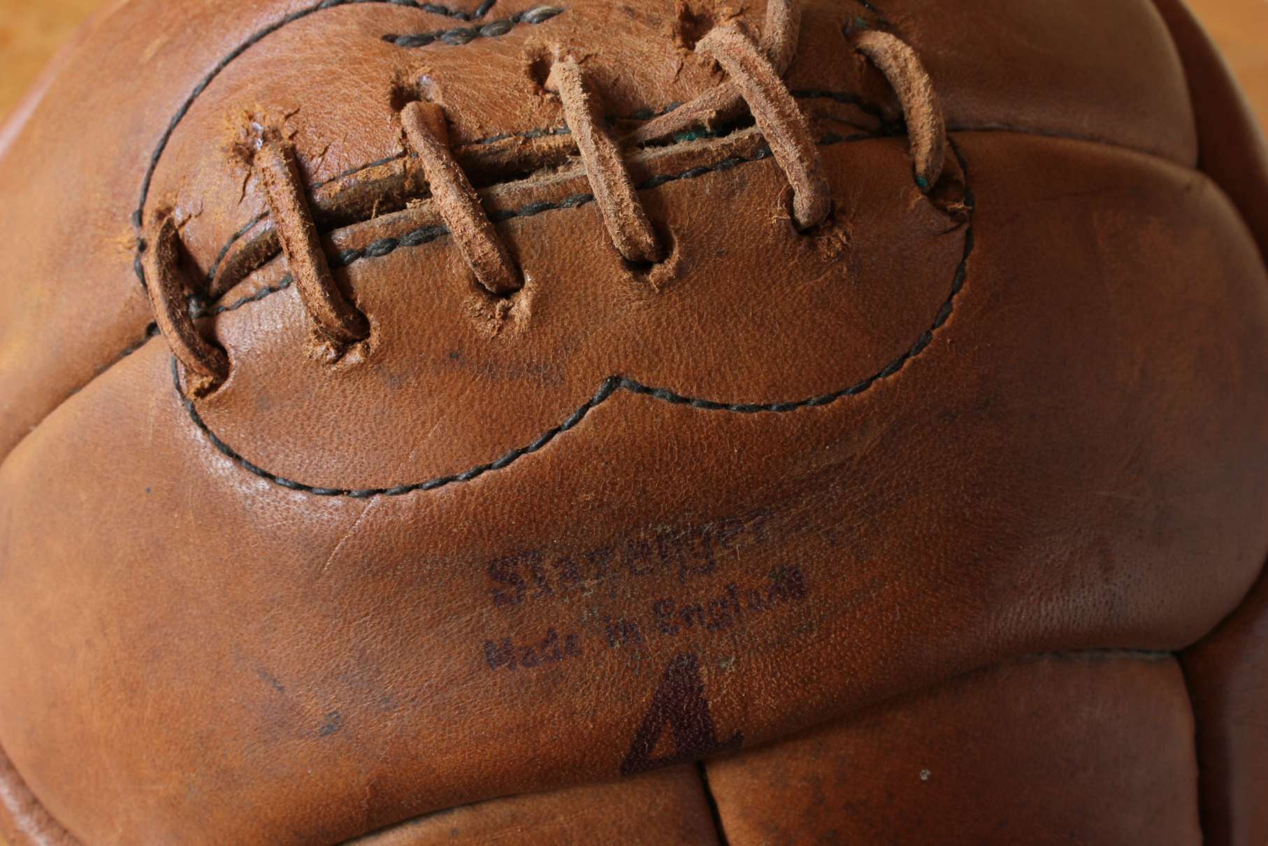 This great looking soccer ball which is made of thick tan leather has leather laces, is marked with a 4. This is a nice vintage English leather ball dating from c1940 and is by a top maker.