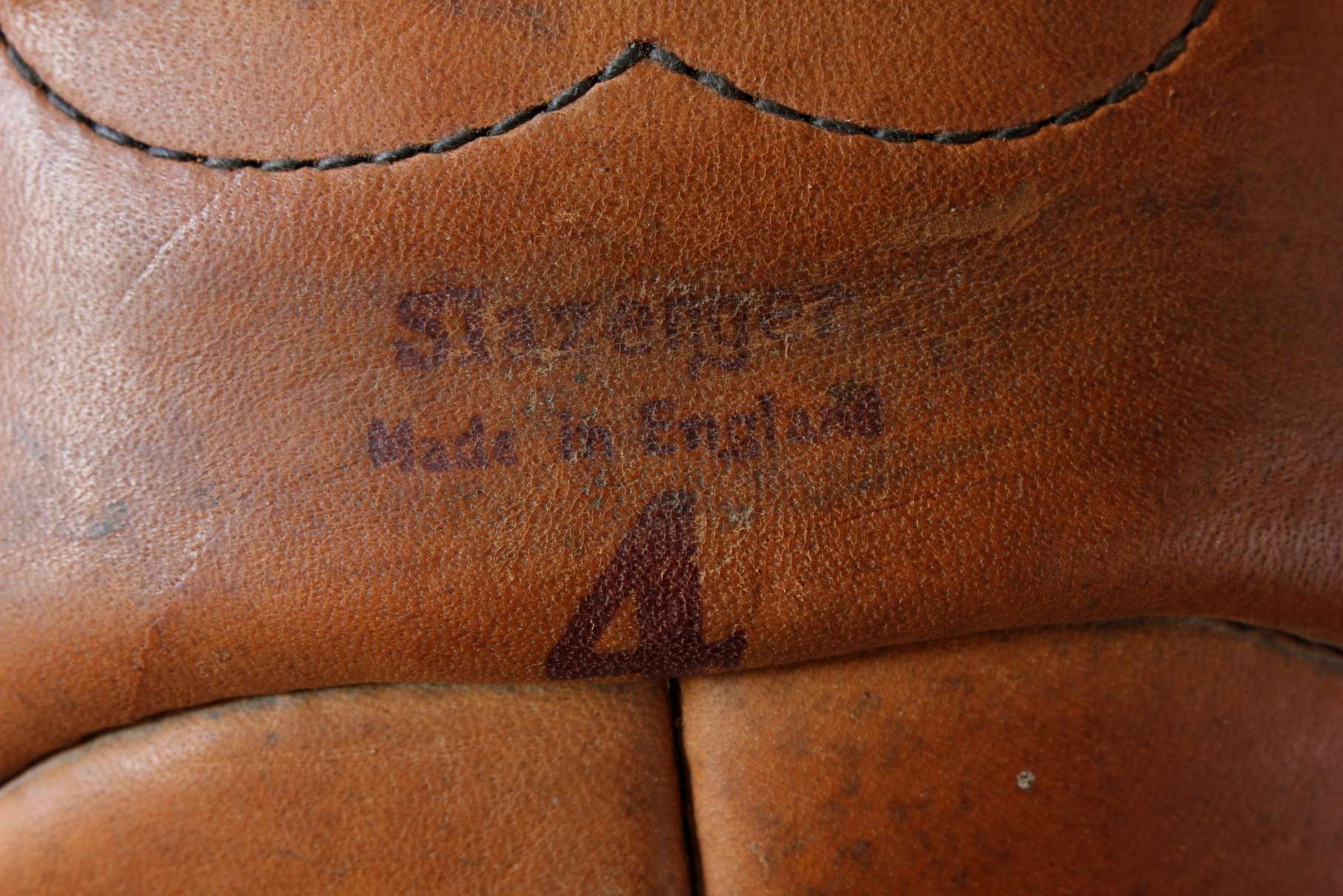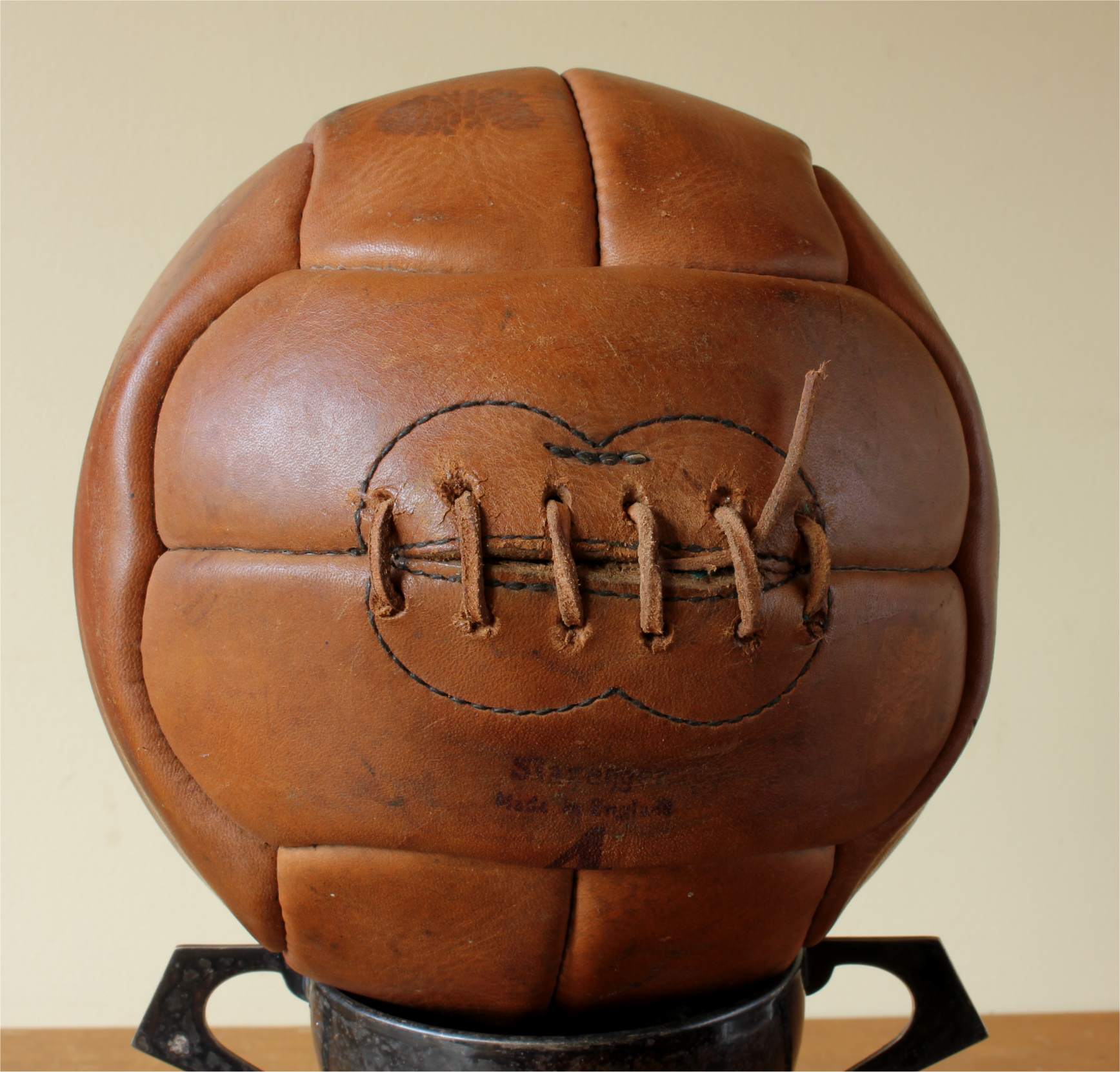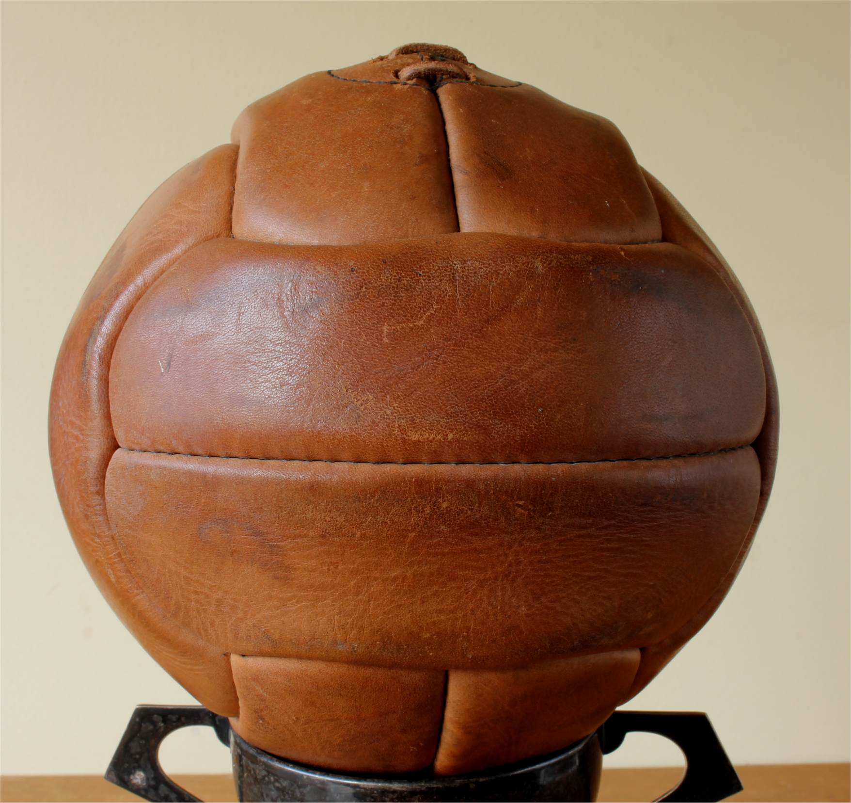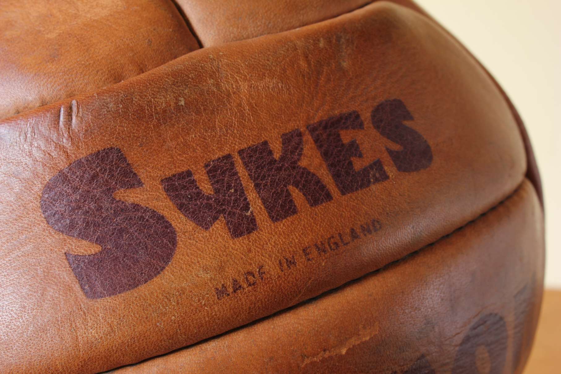 This great looking soccer ball which is made of thick tan leather has leather laces, is marked with a 4. This is a nice vintage English leather ball dating from c1940 and is by a top maker.