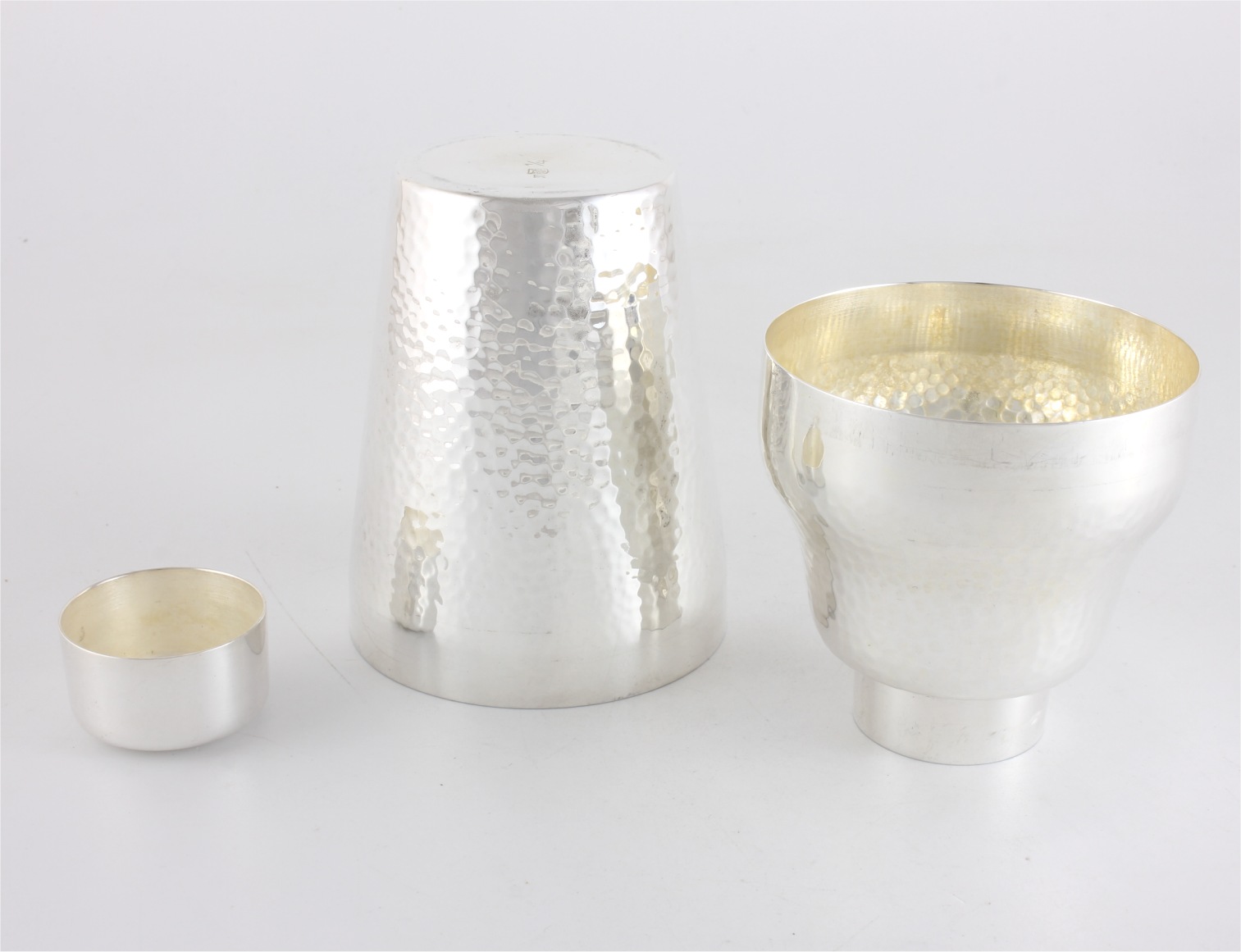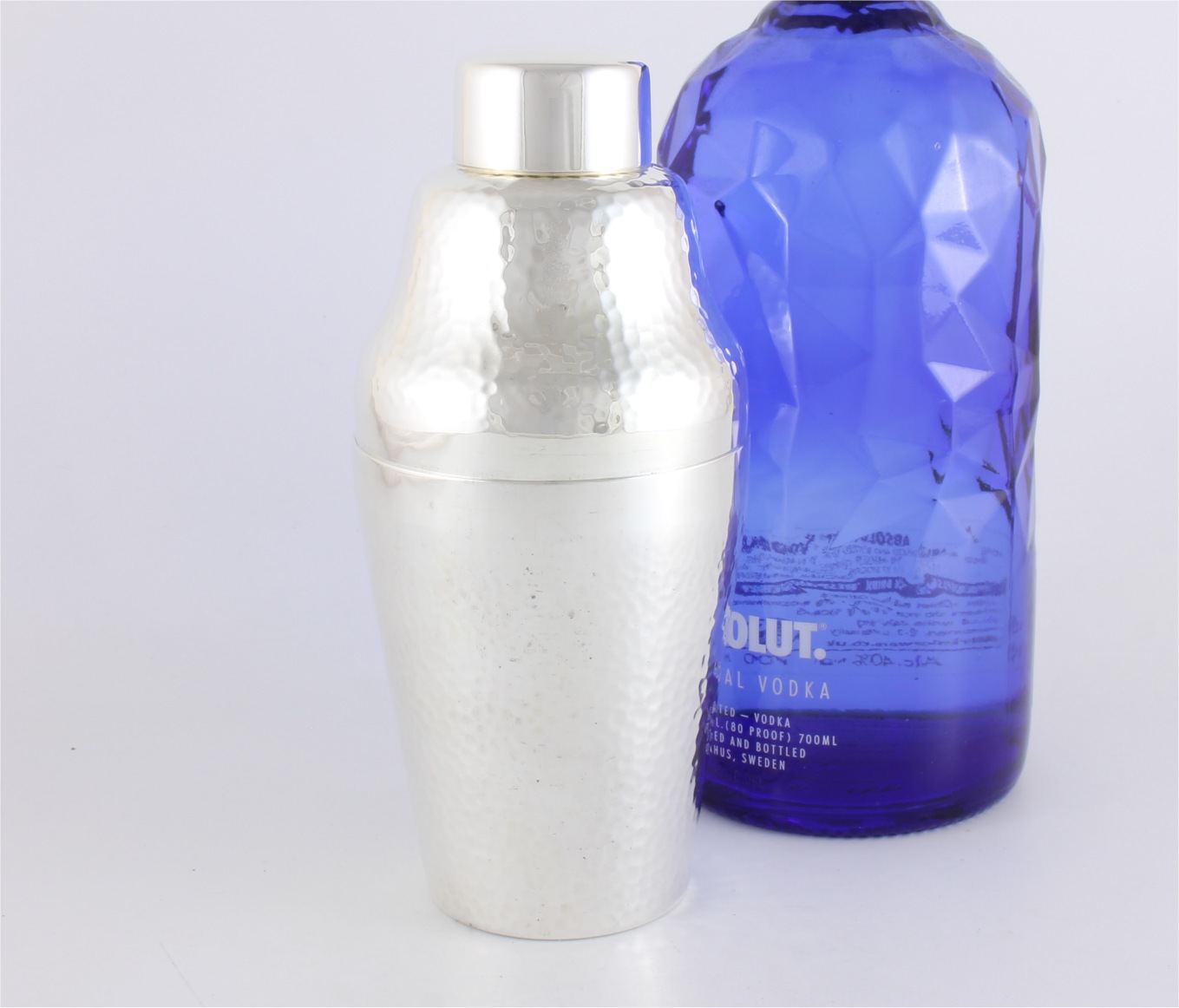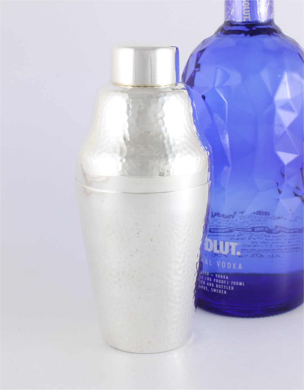 This stylish antique 3 piece cocktail shaker which has hammered design decoration to the body is made of high quality silver plate by Carl Deffner and dates from c1920.