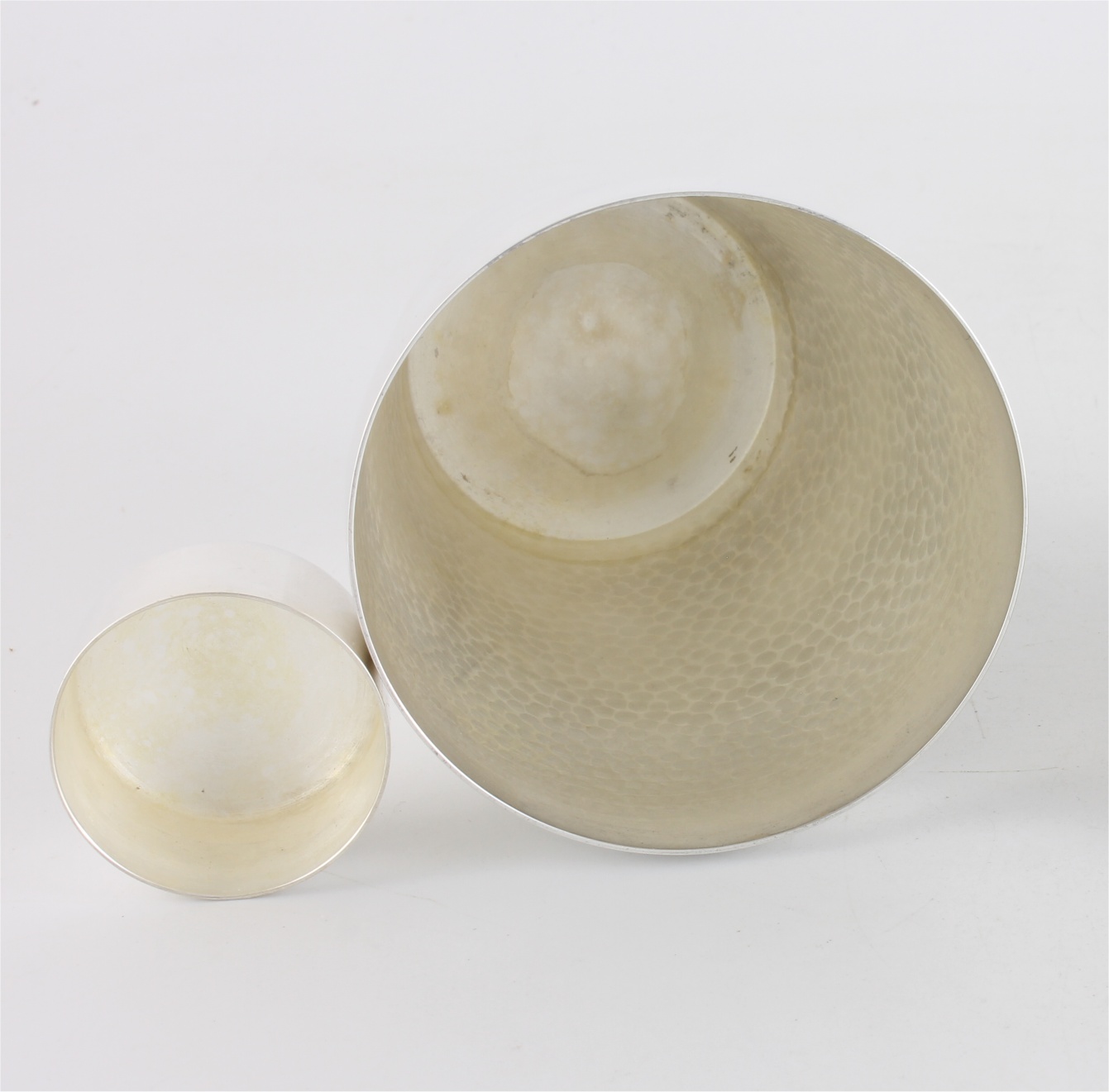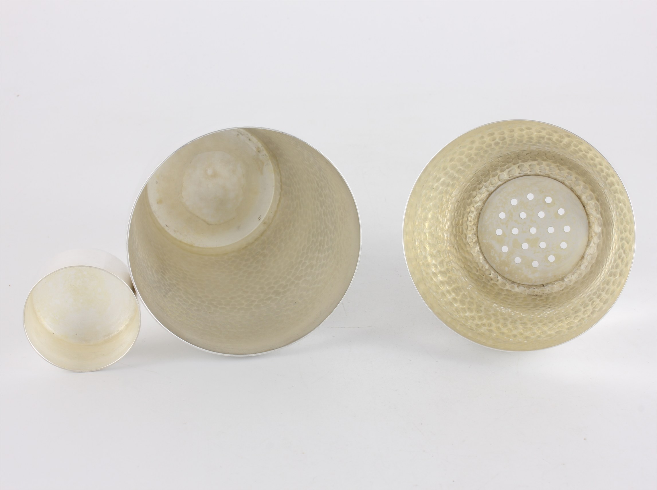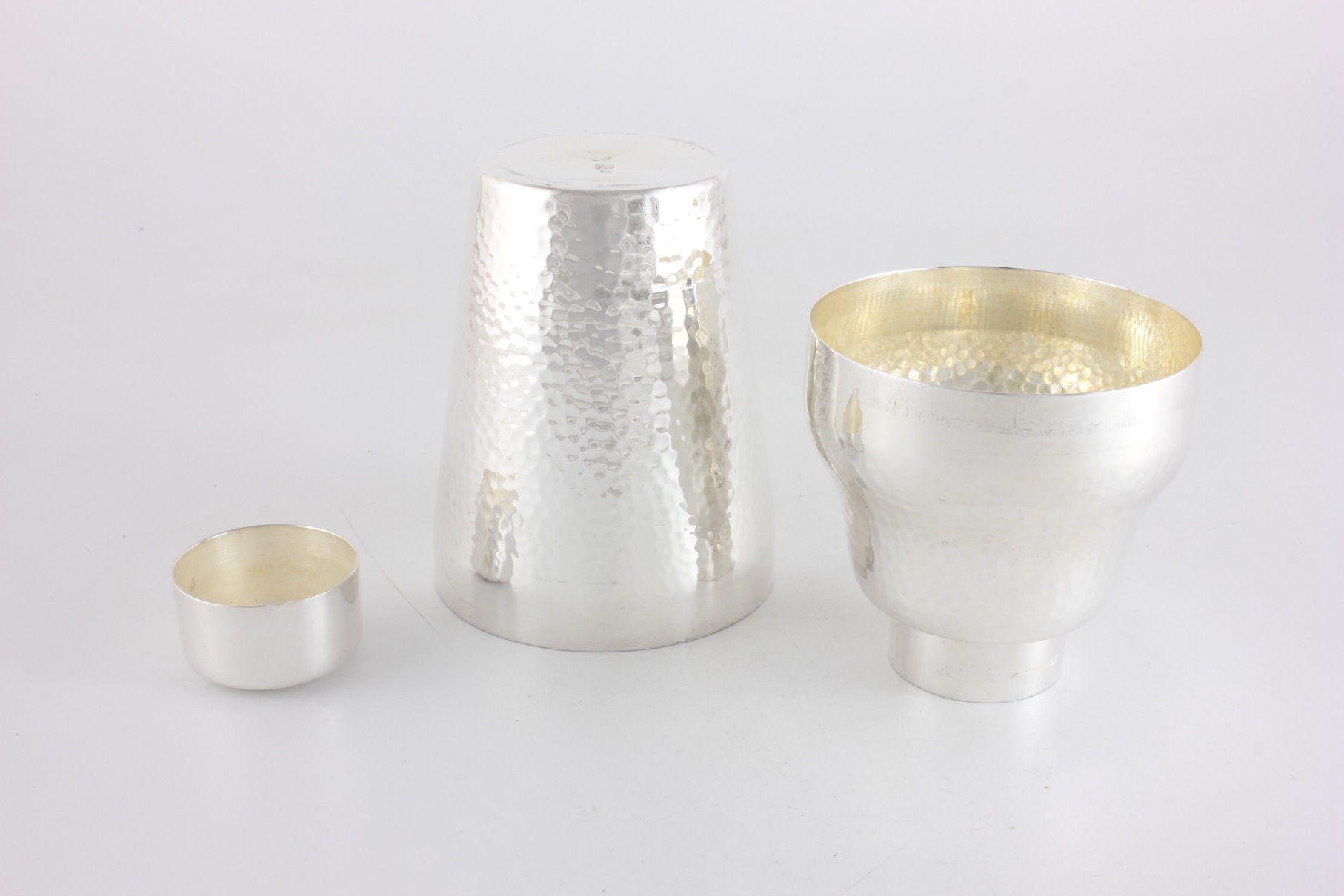 This stylish antique 3 piece cocktail shaker which has hammered design decoration to the body is made of high quality silver plate by Carl Deffner and dates from c1920.