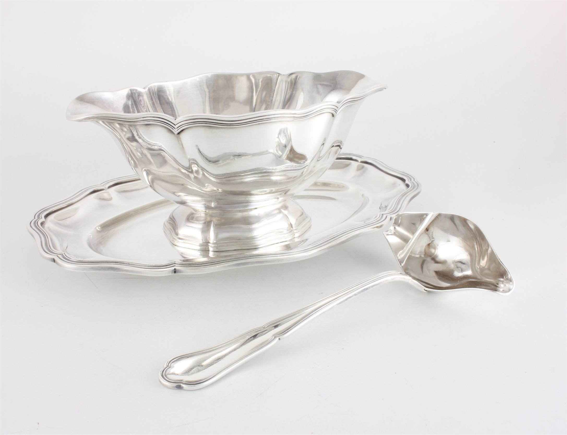 This sauciere has a wonderful wavy design and sits on it's attached underplate that is marked to the underside with the French maker's marks. This sauce bowl comes with it's St Medard silver plated sauce ladle.