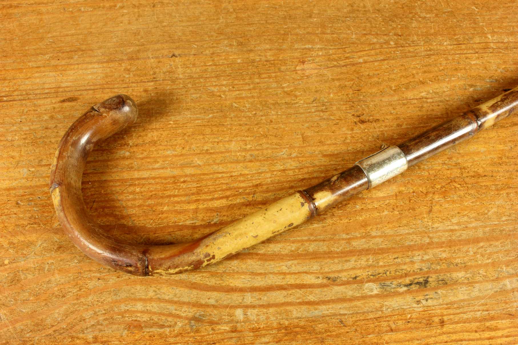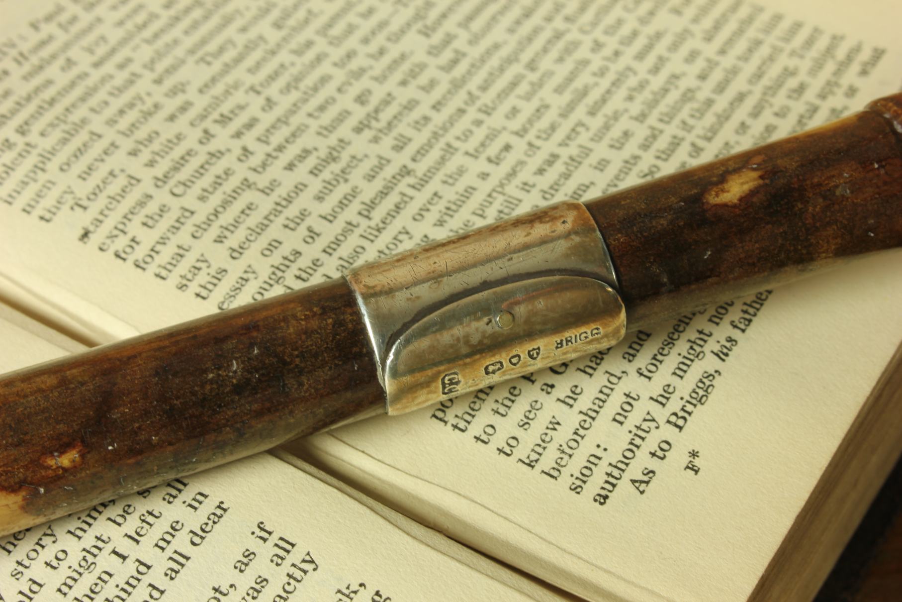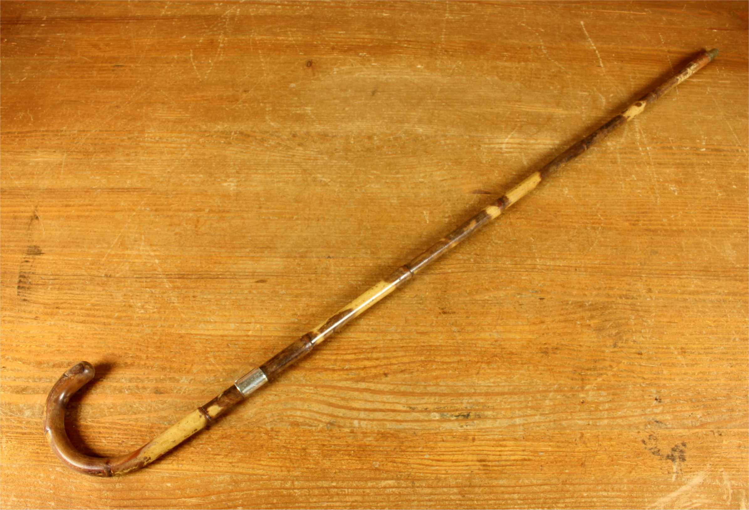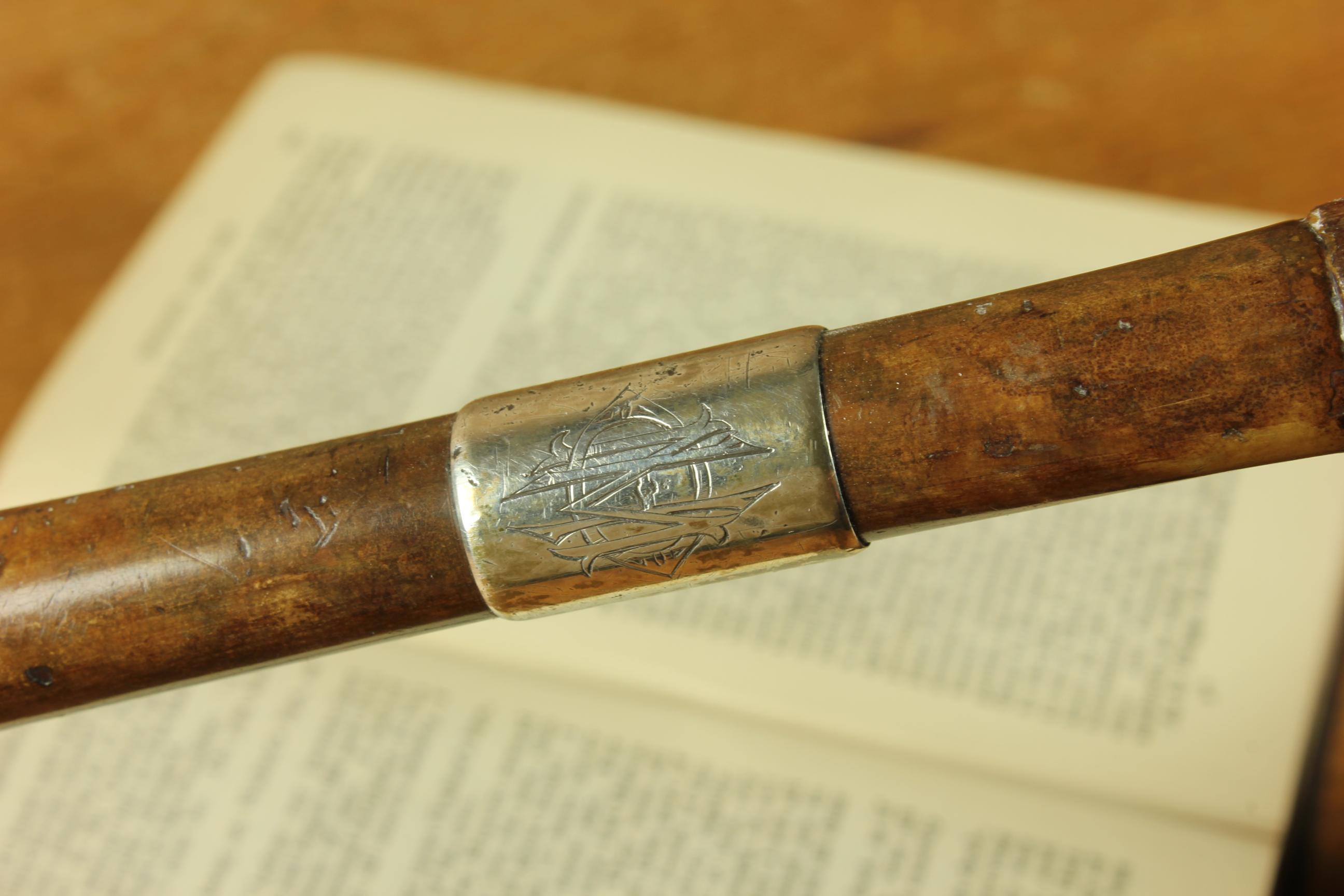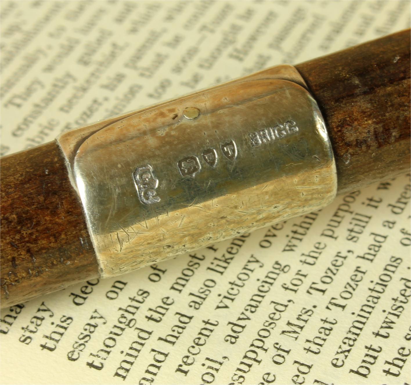 This antique stick which is by top stick maker Thomas Brigg & Sons of London has a bamboo shaft and a Charles Cooke hallmarked silver collar which dates to 1894.