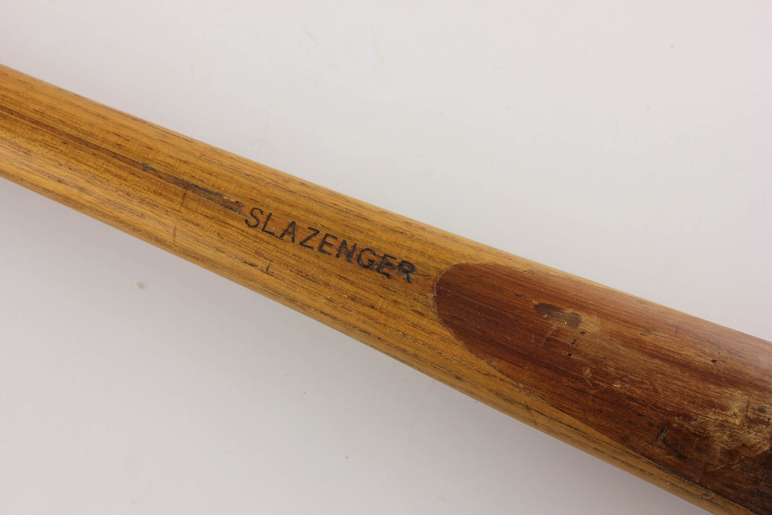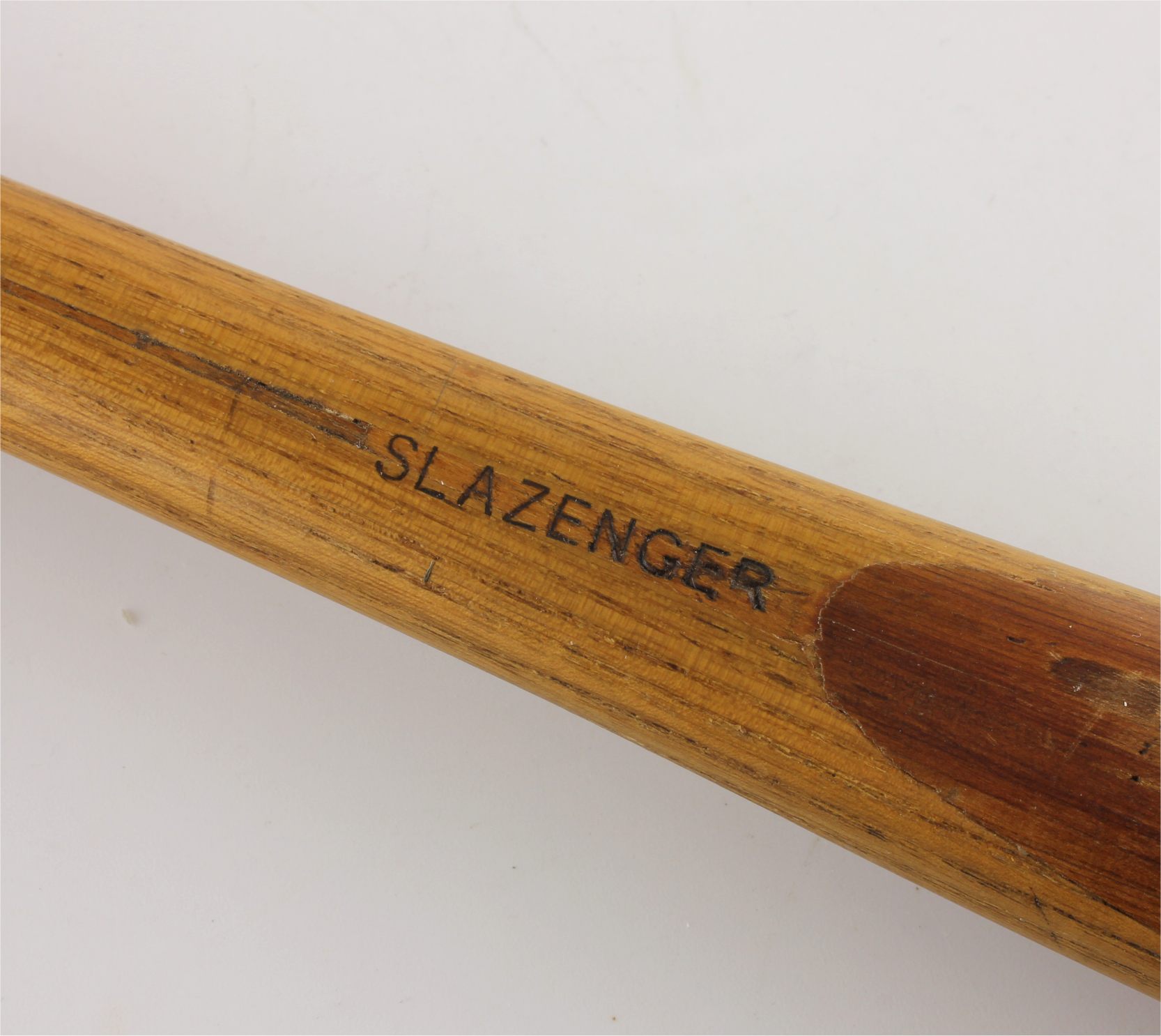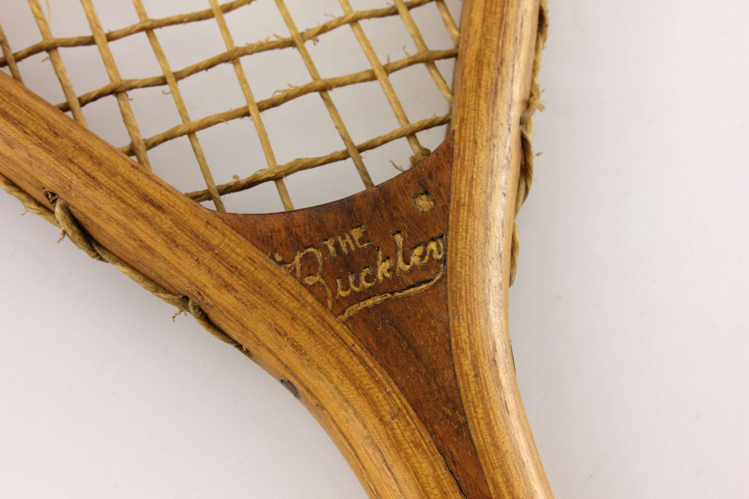 This scarce antique badminton racket which is made of wood has a teardrop shape head with gut stringing, octagonal handle which is embossed with Slazenger and is stamped with The Buckley to the throat.