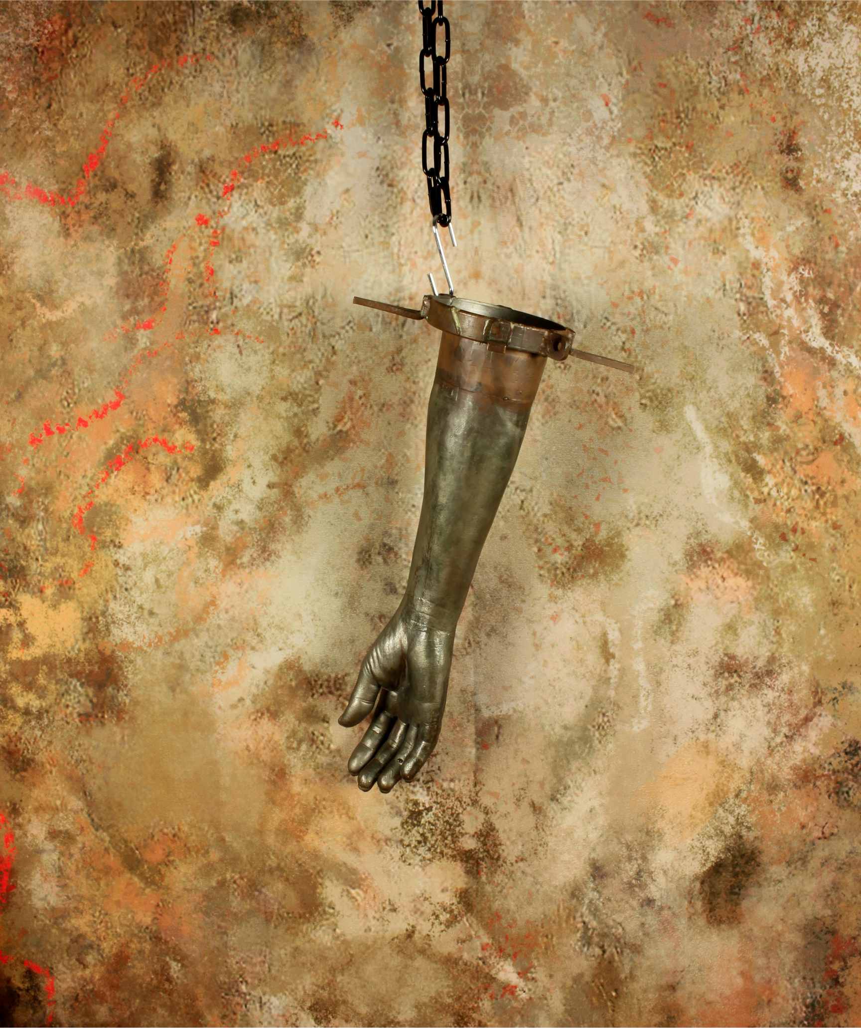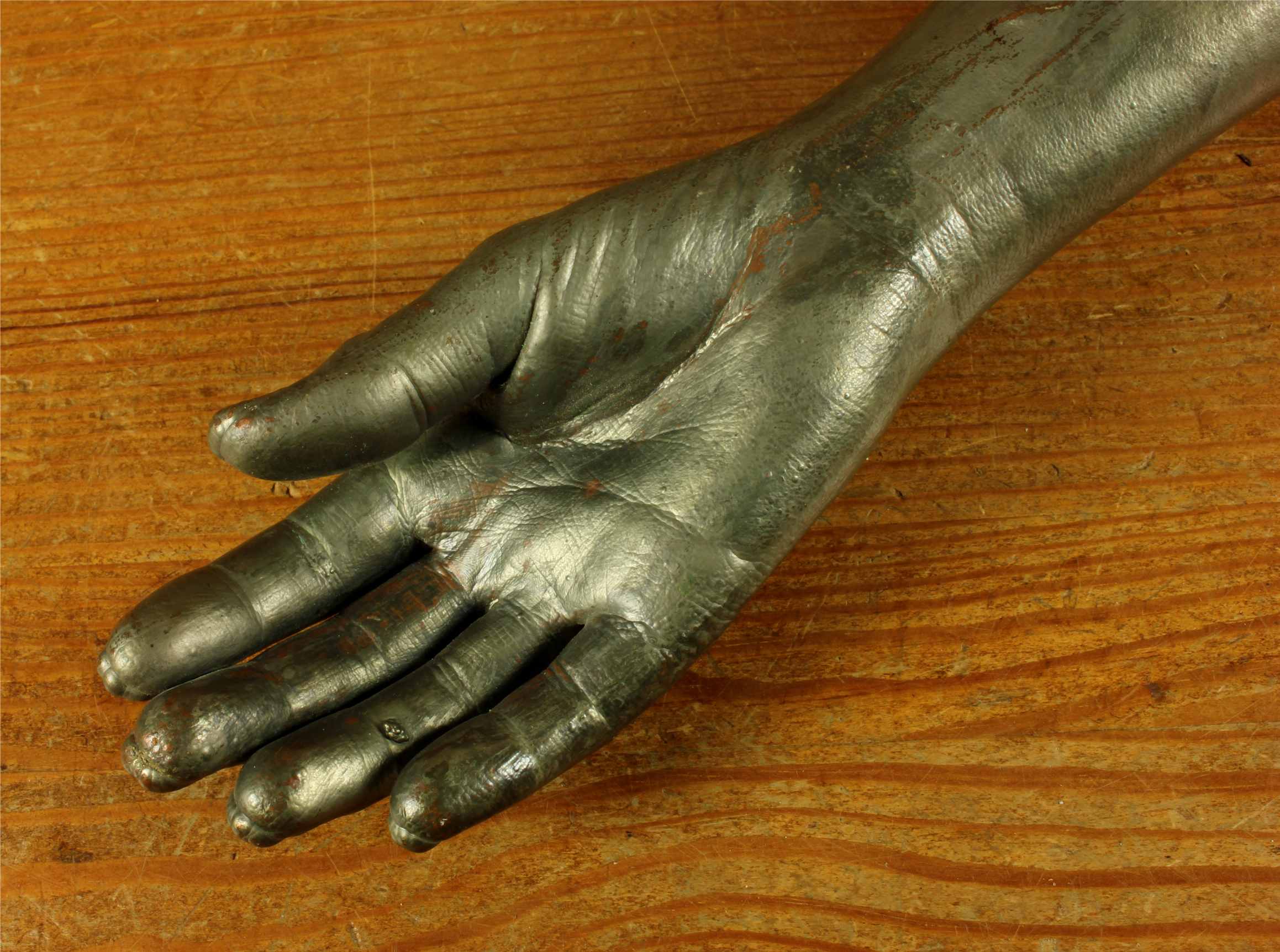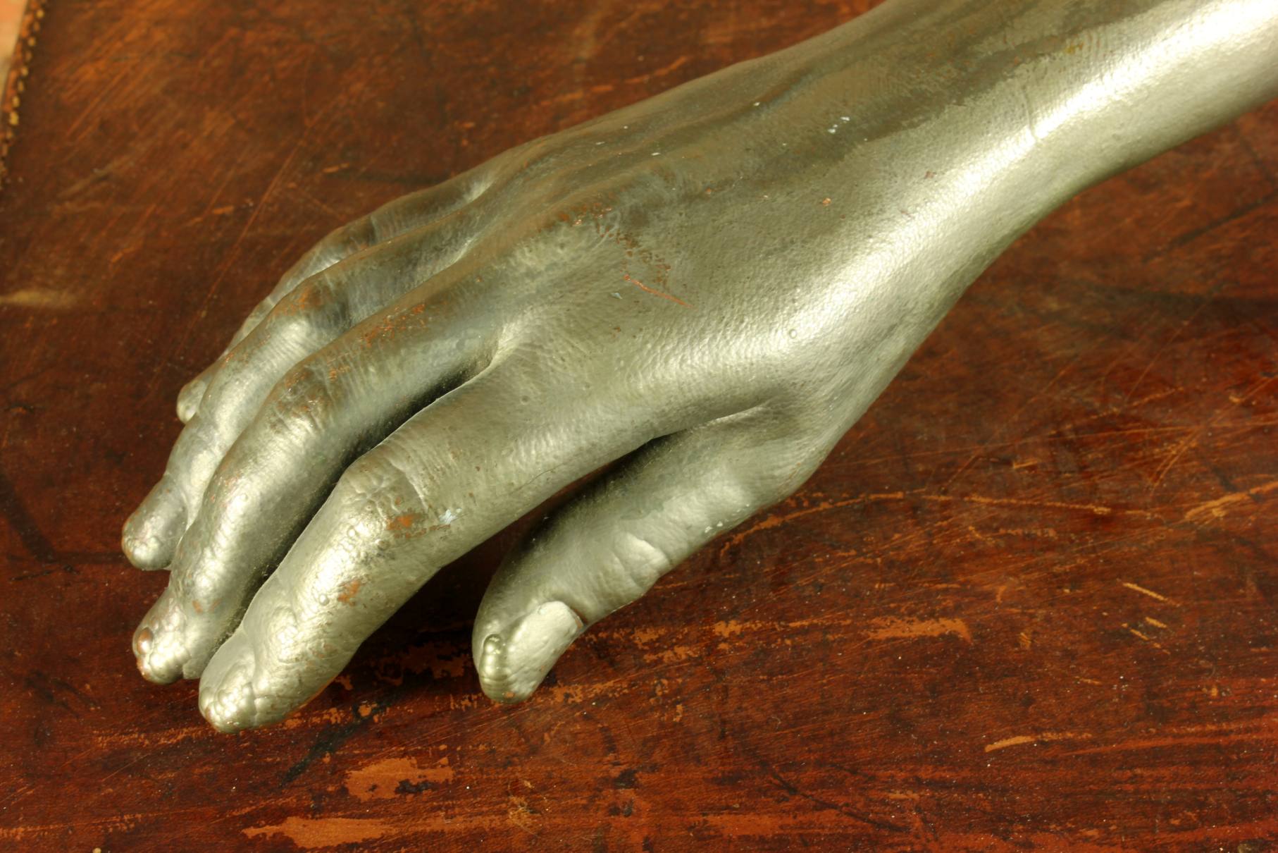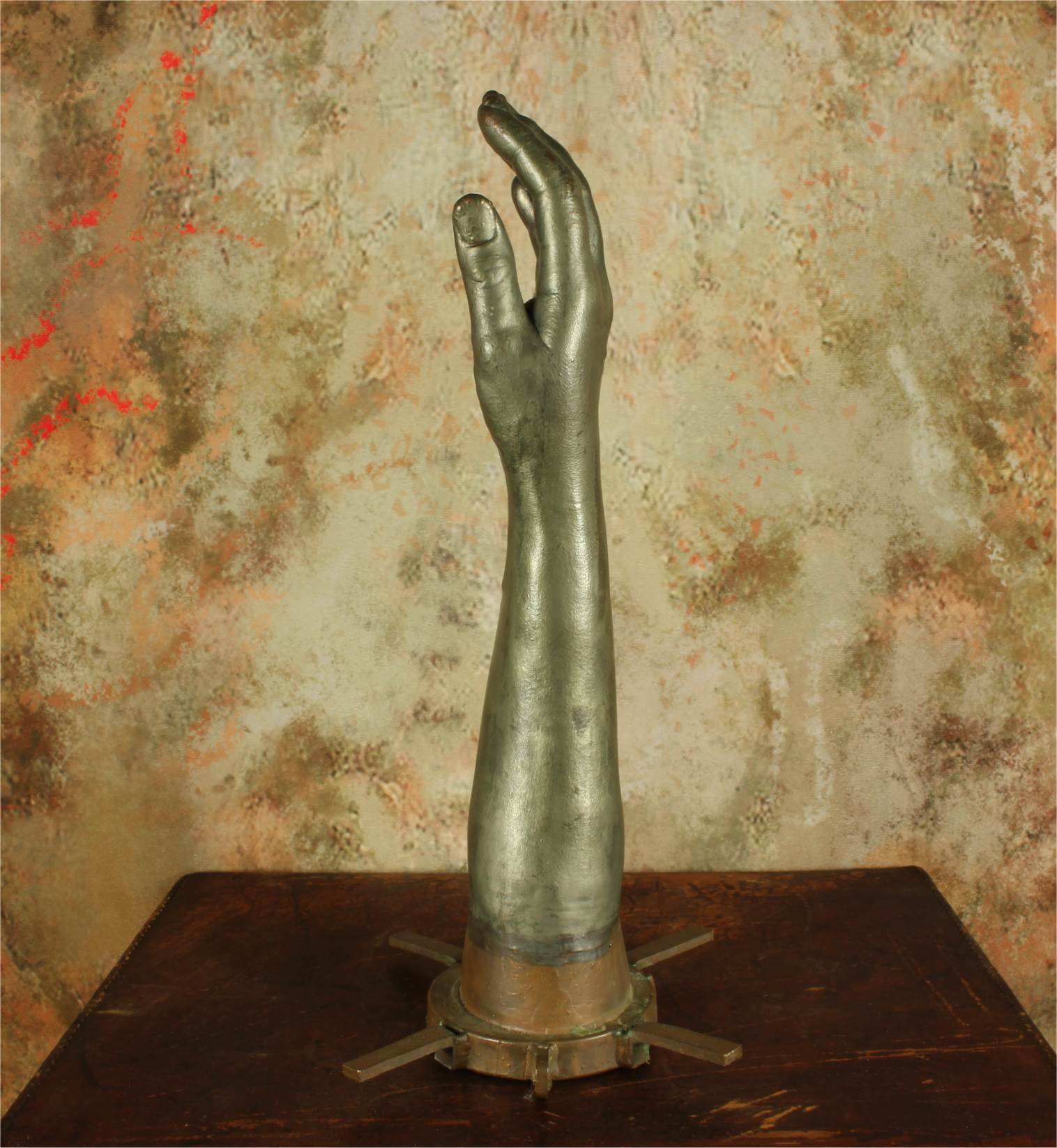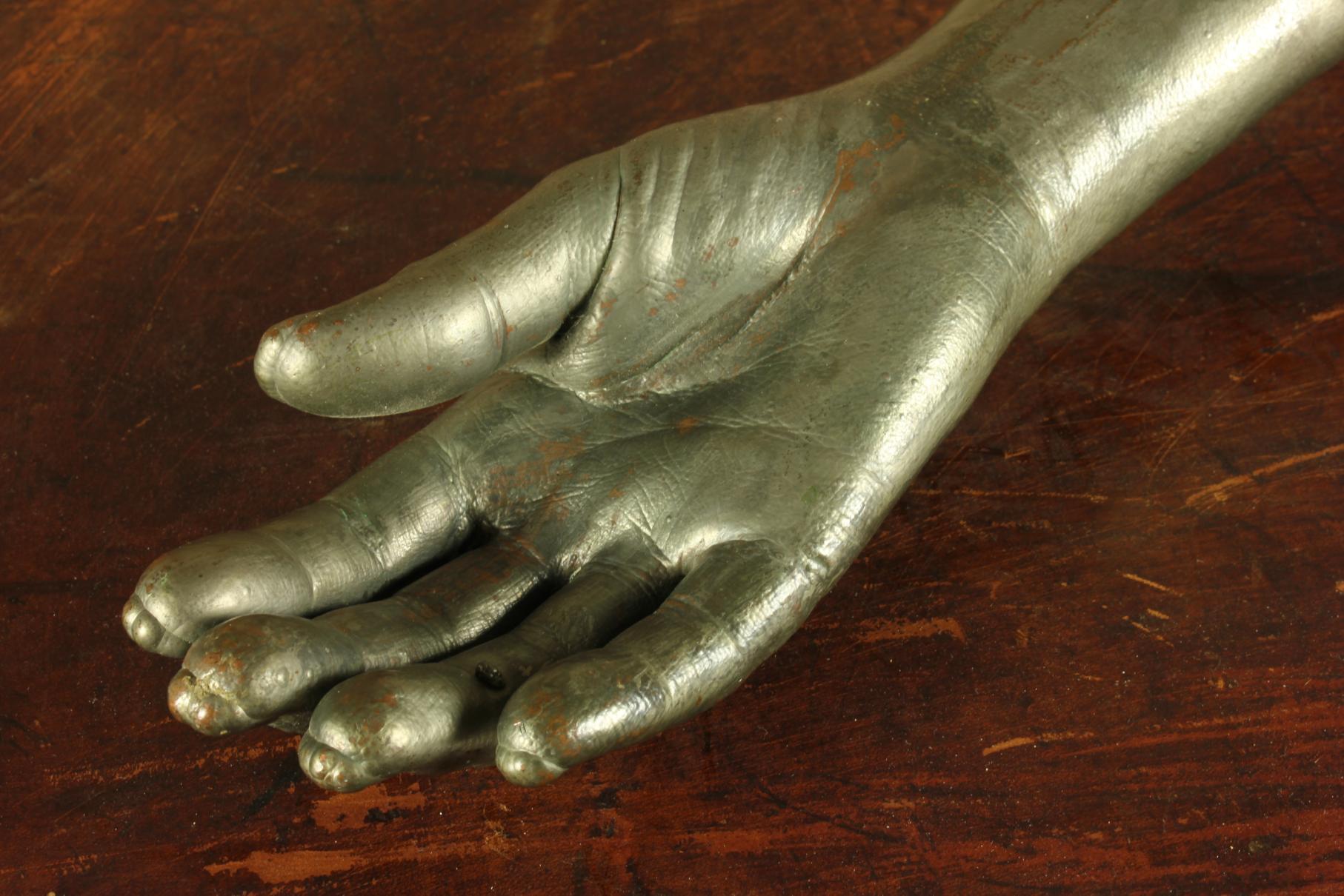 This highly decorative life size piece which is of a female arm has a silver coloured coated finish and has lots of detail including fingernails, palm lines, knuckles and joints.